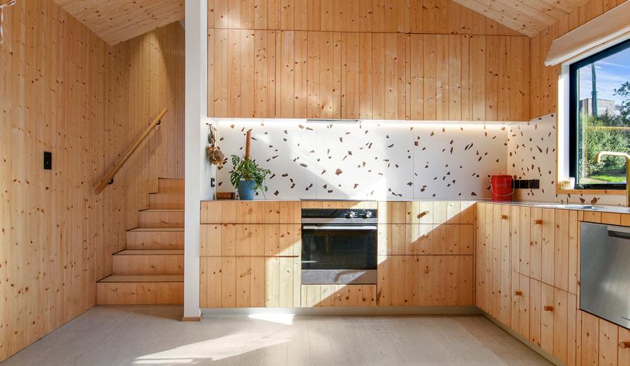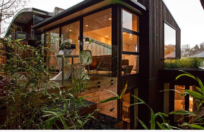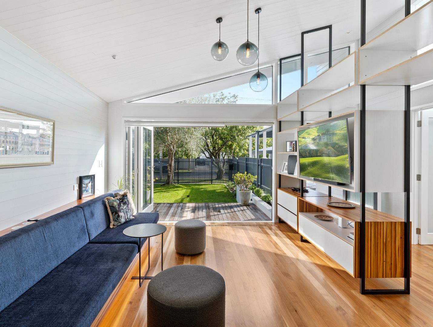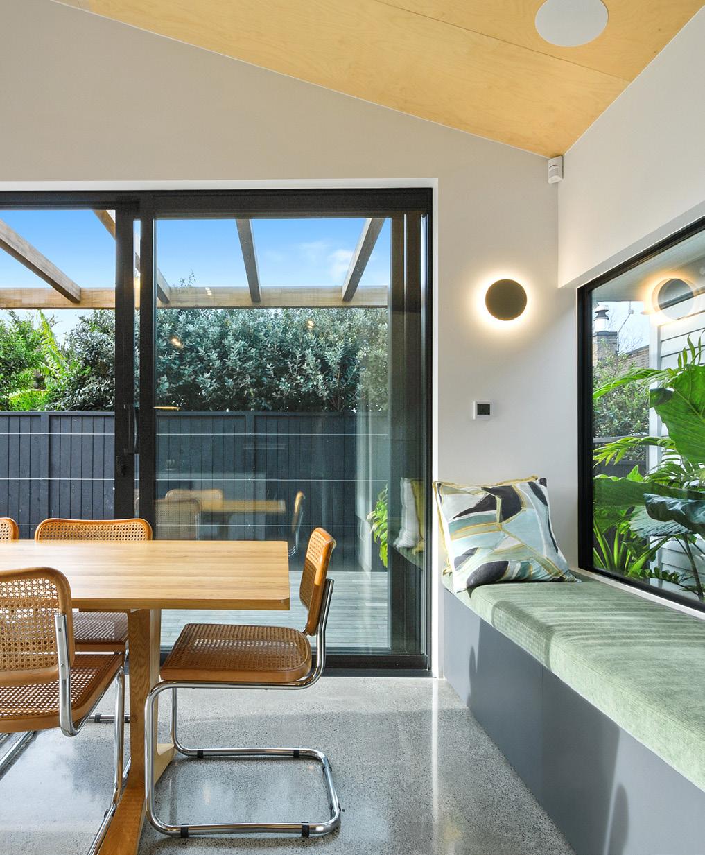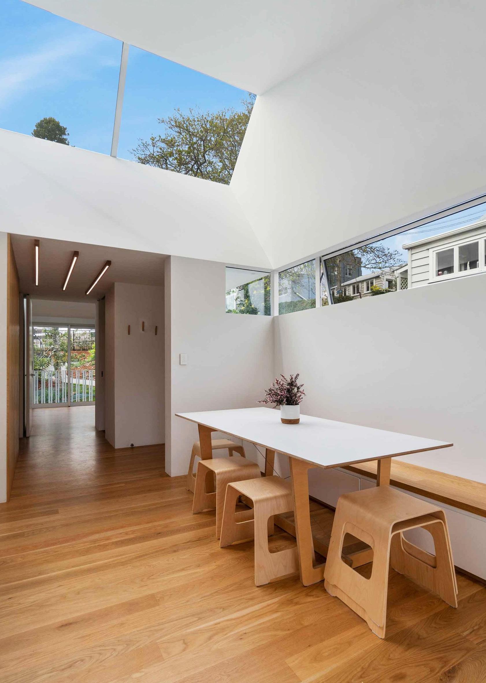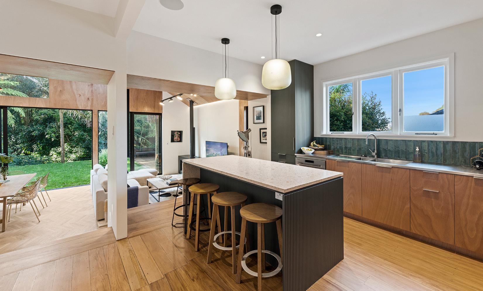 What a difference 35sqm can make. In this central-city house it makes a new living-dining extension that eases onto decking in the lush, private back garden. There’s no shortage of natural light here. Sliders, clerestory windows and a skylight usher in rays that highlight the parquet floor, the pitched ceiling and walls crafted in plywood.