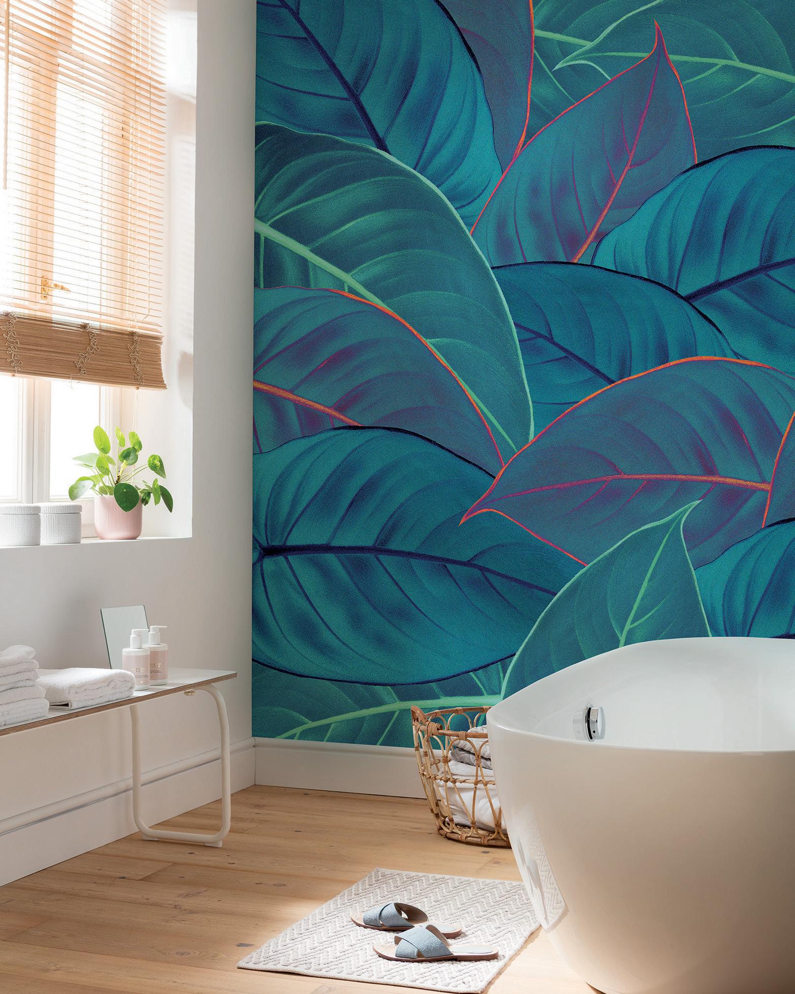 Franklin bath towel by Baina, $90, from TessutiIf you’ve always dreamed of relaxing in the tub in an exotic location, bring the holiday home with a wallpaper mural. Washable designs such as Resene Wallpaper Collection P026-VD2 are suitable for wet areas and are a cost-effective way to transform a bathroom.