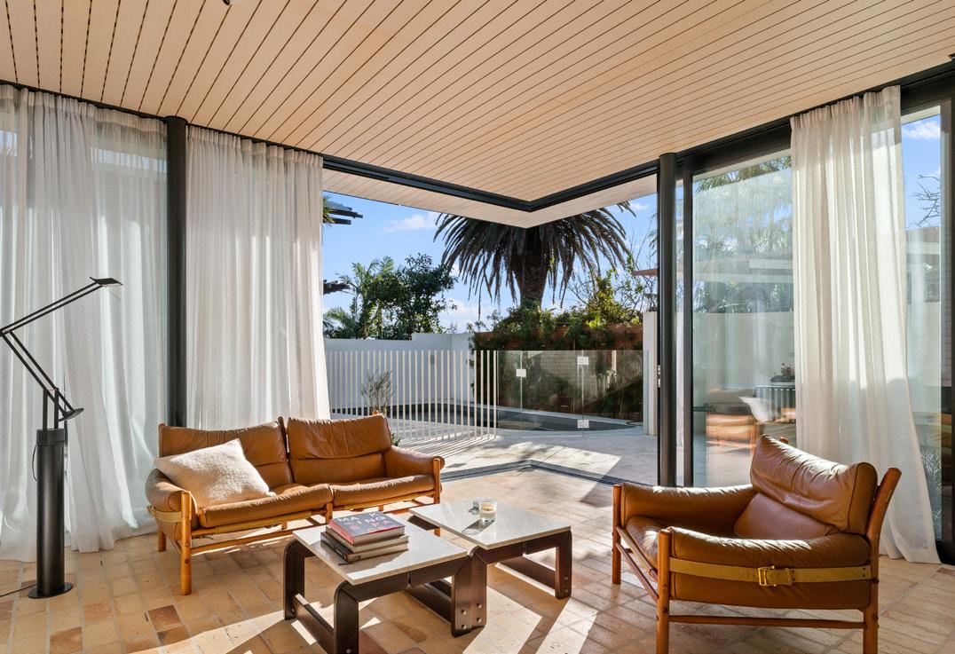 living area opens to the outdoors through corner sliding doors, with easy access to a paved patio, pool and garden.