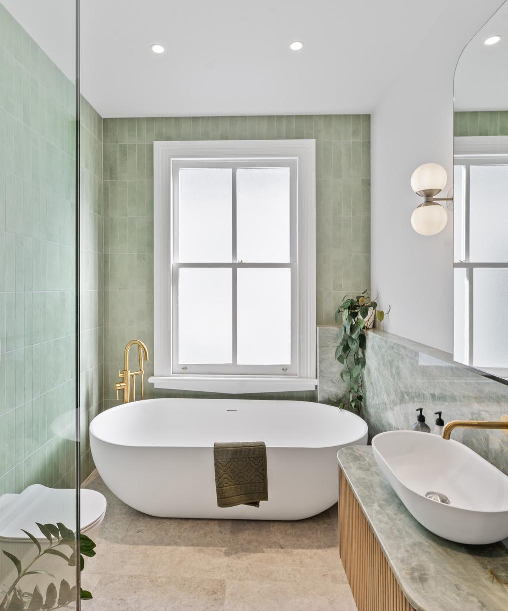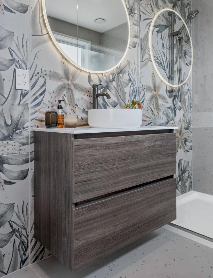 frosted glass will help.” For a more European-style resort-look, consider large tiles that will have fewer grout lines, making a small space look bigger. If incorporating two types of tiles or combining tiles and paint, choose colours with similar undertones. “Luxurious bathrooms really lend themselves to tiles, but if you’re not tiling the entire bathroom, think about where they will finish so your eye isn’t drawn to a lip of tiles,” says Kate. “It also pays to really nail the layout first and think about practicalities like how you live in the space and where you want the bin to go. For instance, I’m a big fan of vertical bath rails because my kids don’t know how to hang towels.” For the ultimate escape, consider a washable wallpaper mural placed behind a bathtub so you can dream of tropical locations without leaving home.