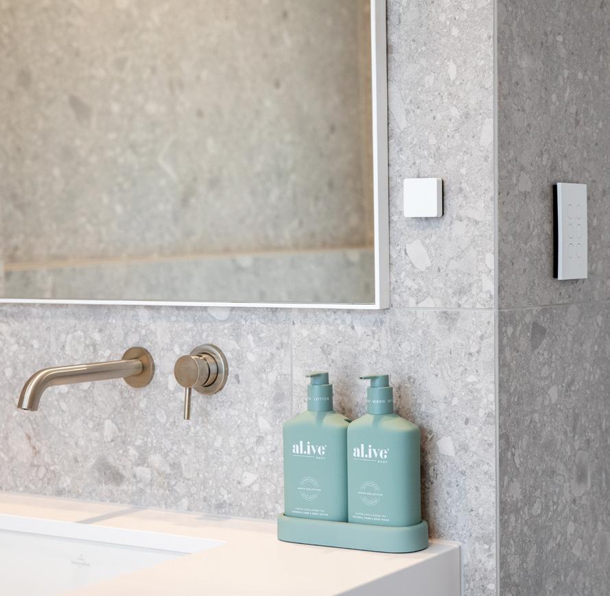 With clean lines and matte finishes, Saturn Zen light switches and power points by PDL Schneider Electric will complement any modern bathroom.