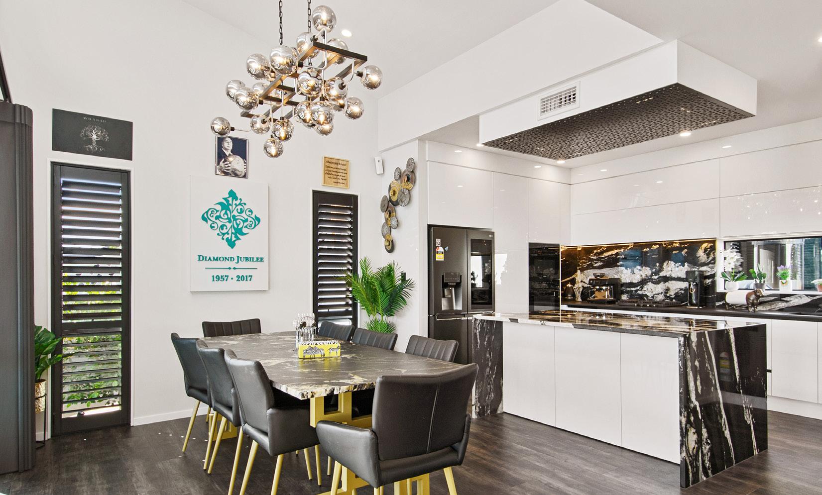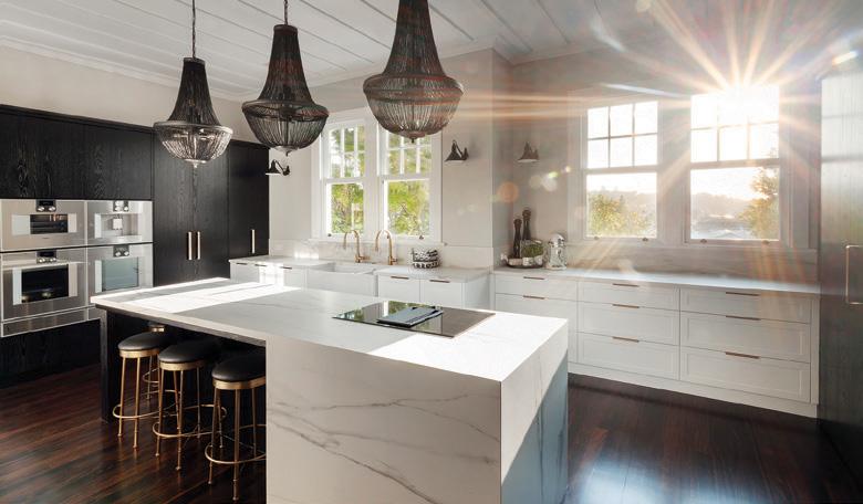 achieving an opulent look often comes down to well thought-out design rather than the most expensive materials. “Your design will define your finishes, and it’s easy to create a sense of luxury with cheaper products if the layout is right,” she says. “I always think stone and natural materials raise the sophistication level, and you can do things like wrap an extractor fan in stone or render to make it a statement. Think about intersections like where the bench ends and how that lines up with elements such as windows.” Colourwise go for dark and dramatic hues like charcoal, burgundy or British racing green or creamy vanillas in rooms with sheer drapes bathed in light.
