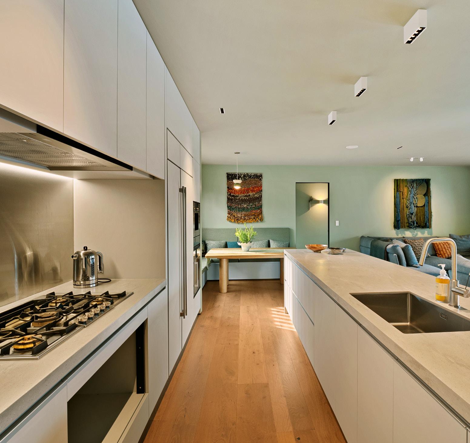 The extension, clad in Abodo timber, isn’t the only component of this impressive project. It also involved reconfiguring and renovating the existing house. A prime example: the kitchen that steps down to the new communal space. It has more timber as well as muted green tiles and cabinetry, both of which tie the area for prepping food to the zone for sitting down and enjoying it.