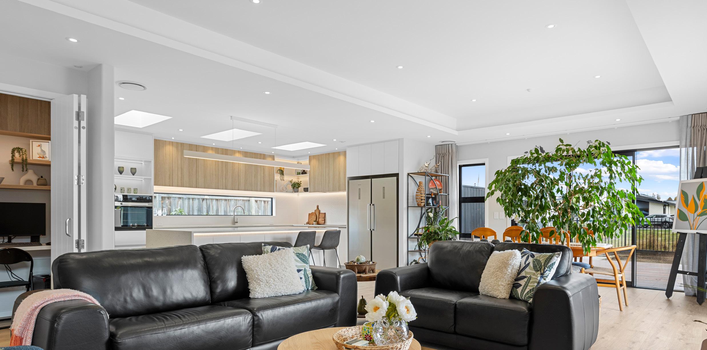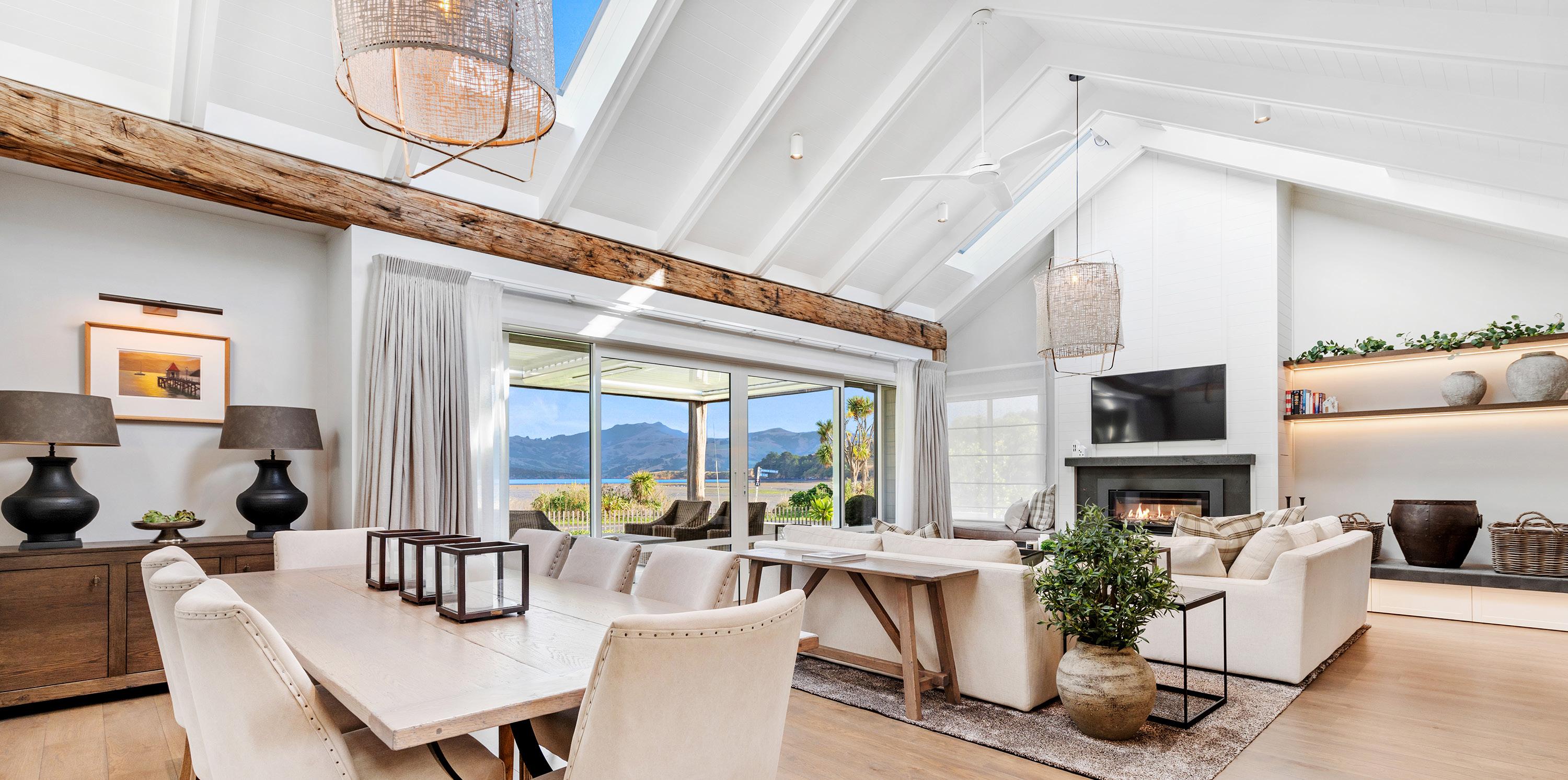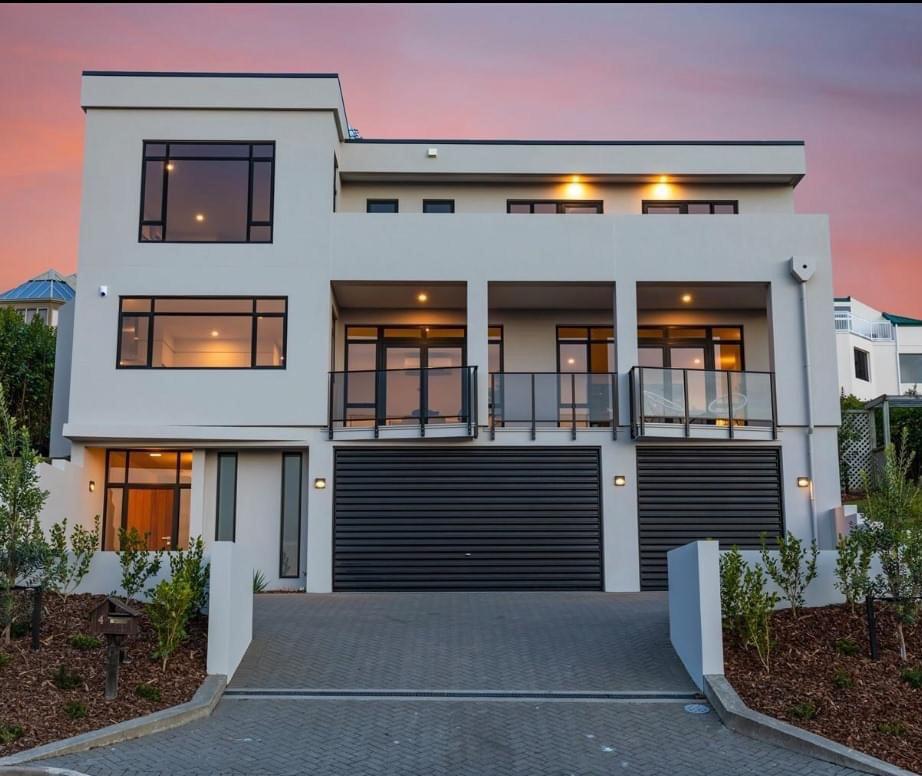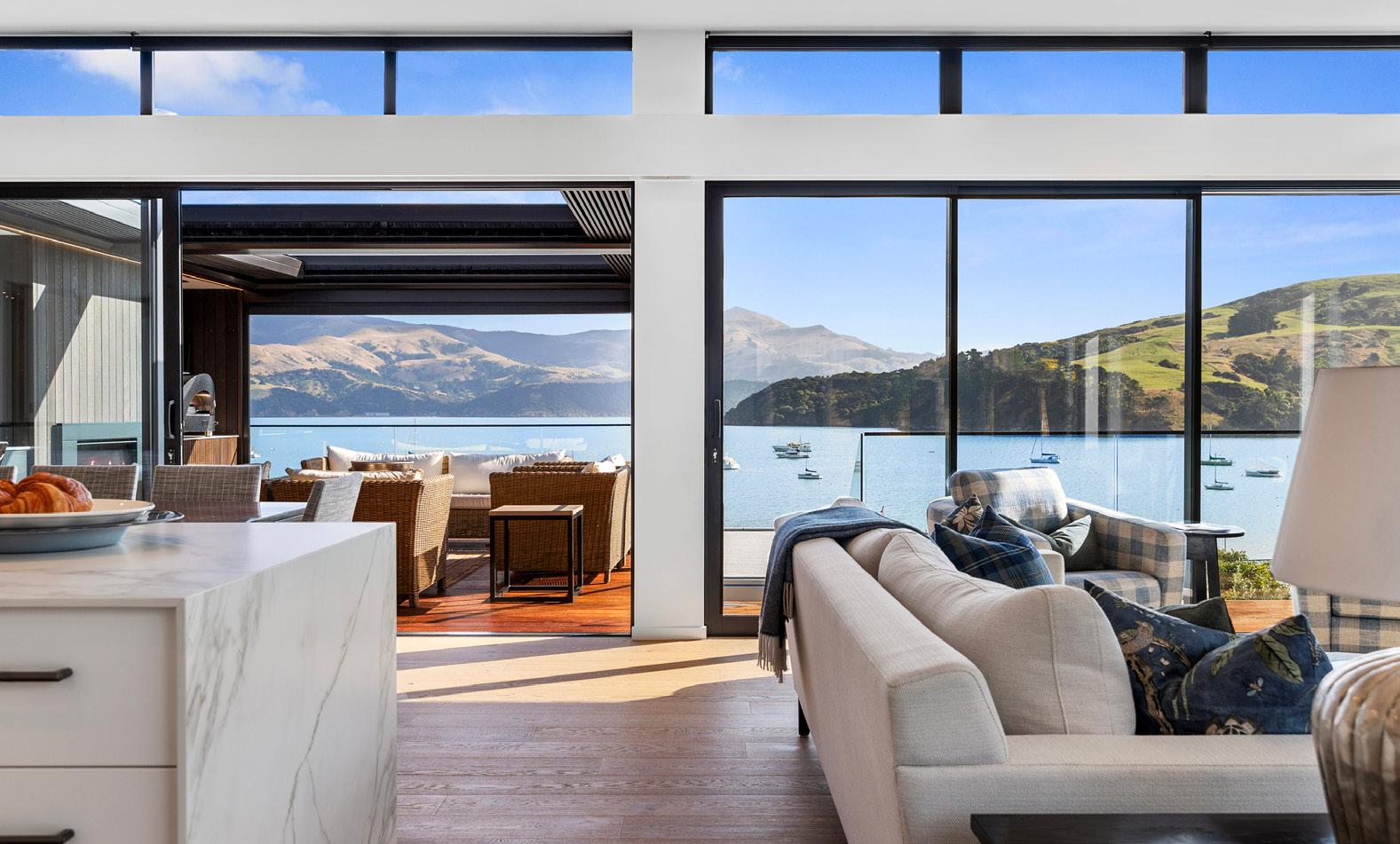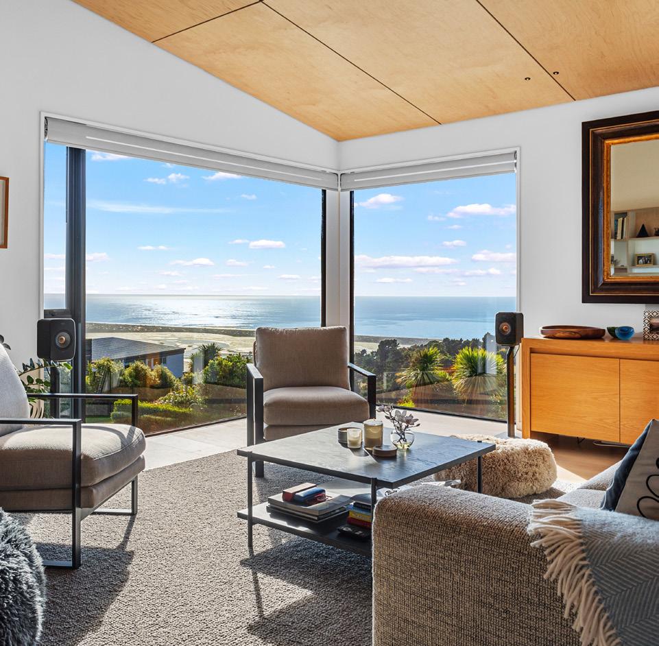 To the west, the living areas open out to a generous deck and unobstructed views over South Shore to Kaikōura. To the east, a media room and primary bedroom suite occupy the upper level with three additional bedrooms and services below.