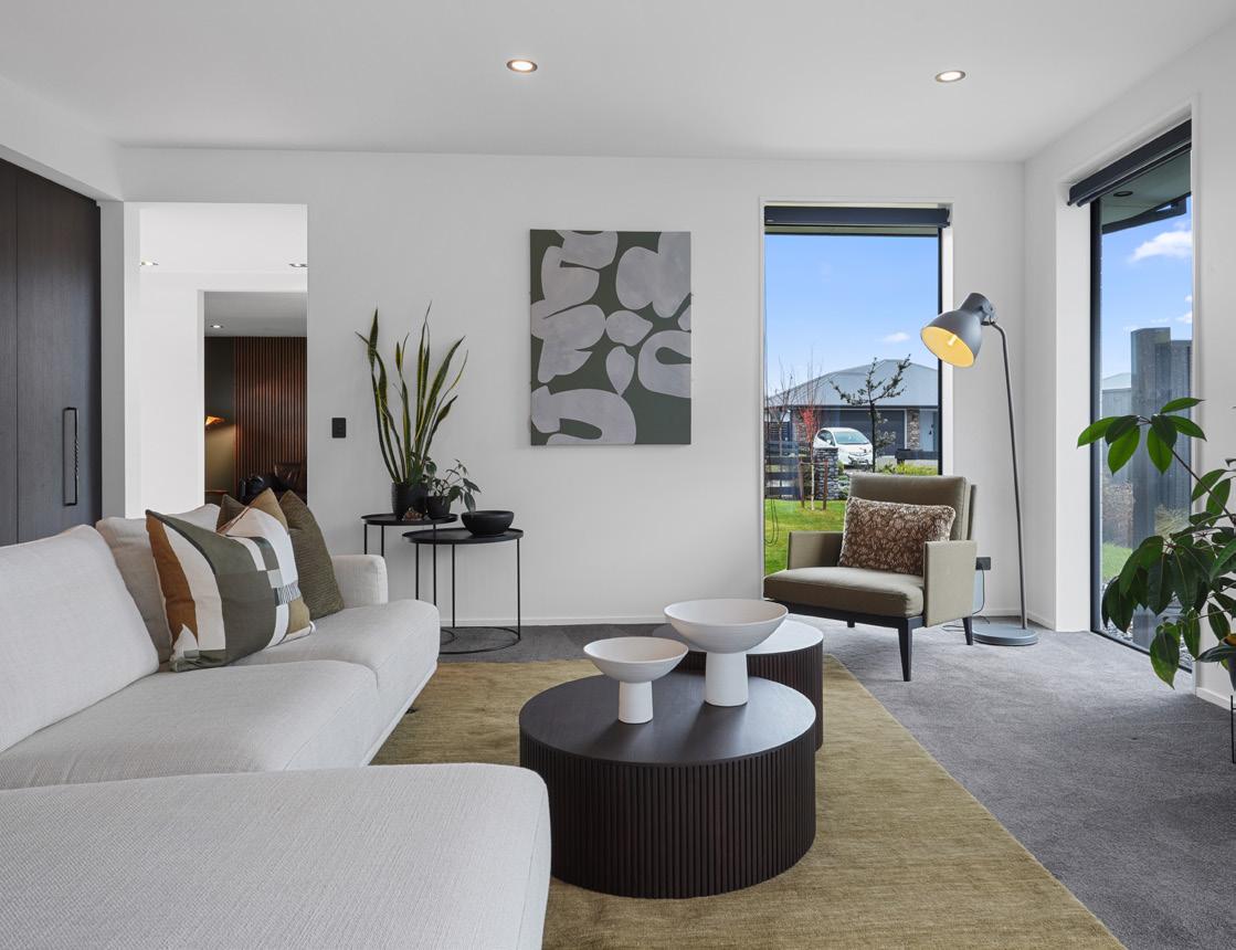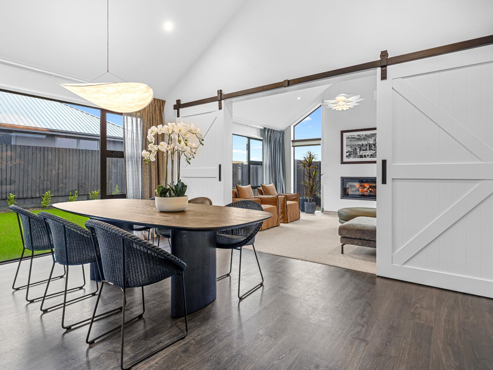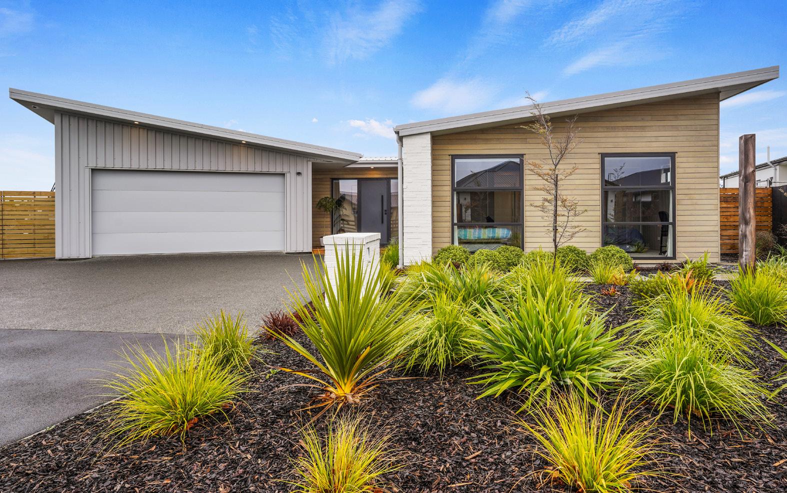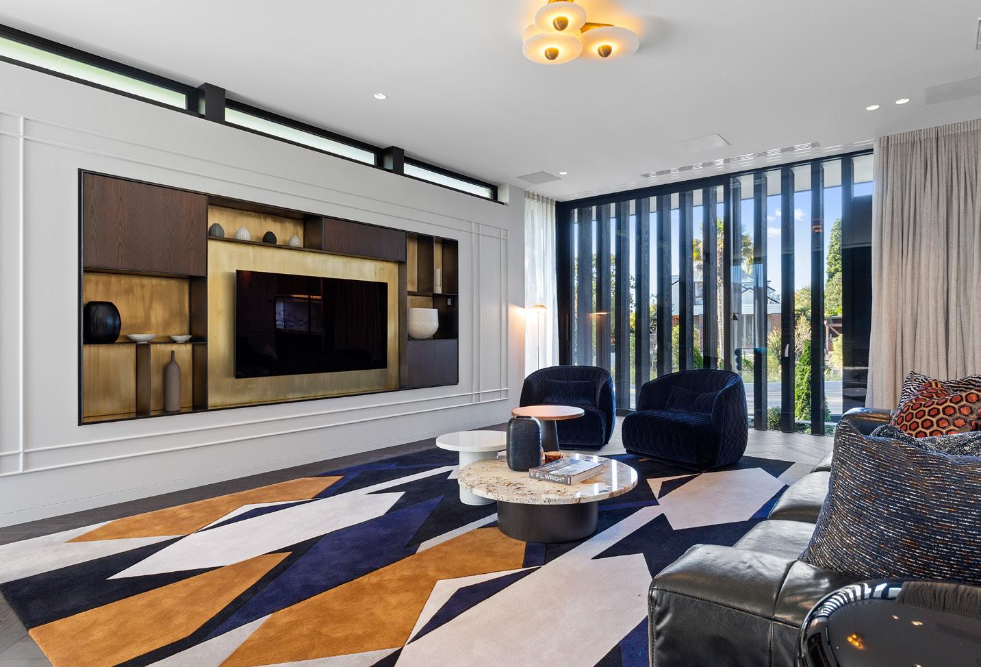 To the west, the living areas open out to a generous deck and unobstructed views over South Shore to Kaikōura. To the east, a media room and primary bedroom suite occupy the upper level with three additional bedrooms and services below.
