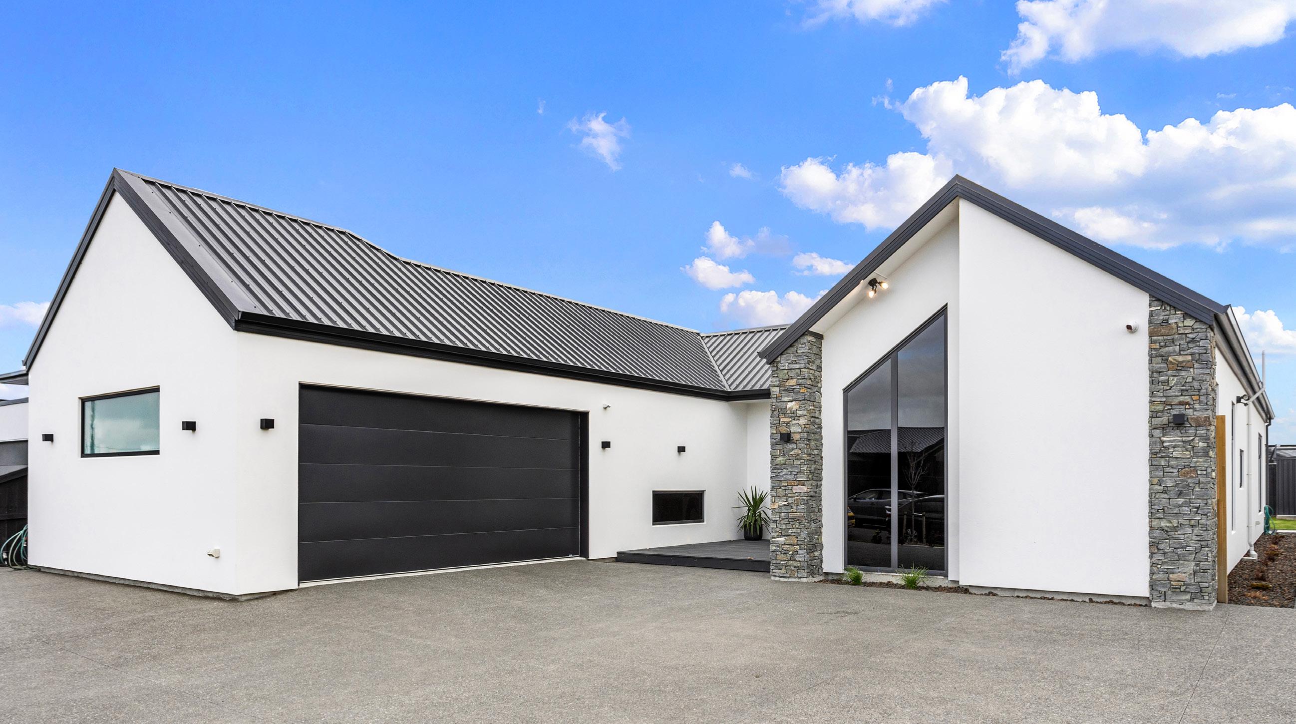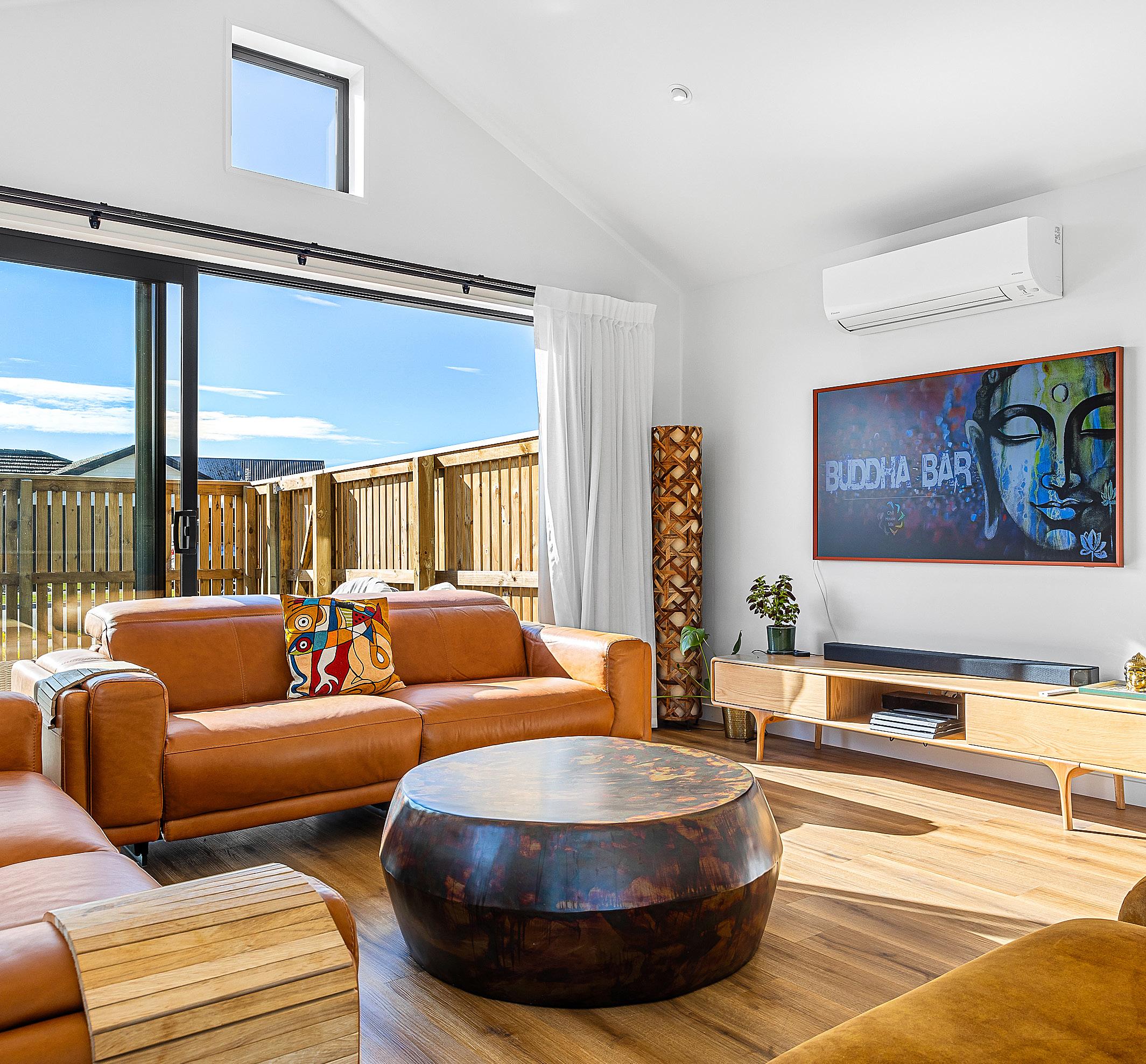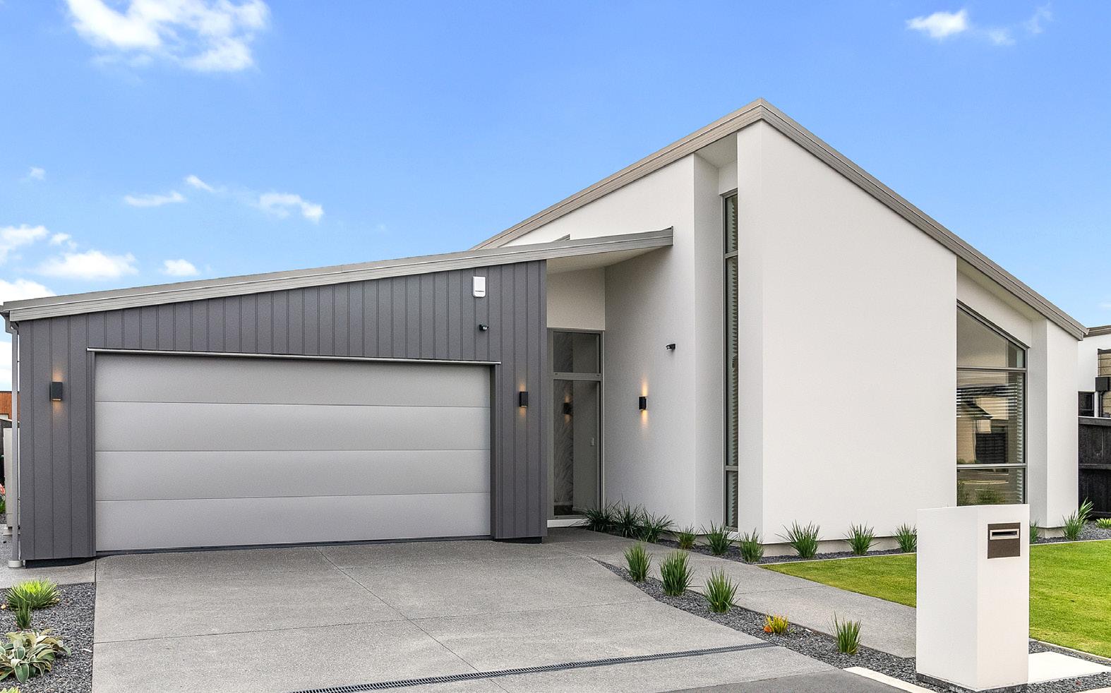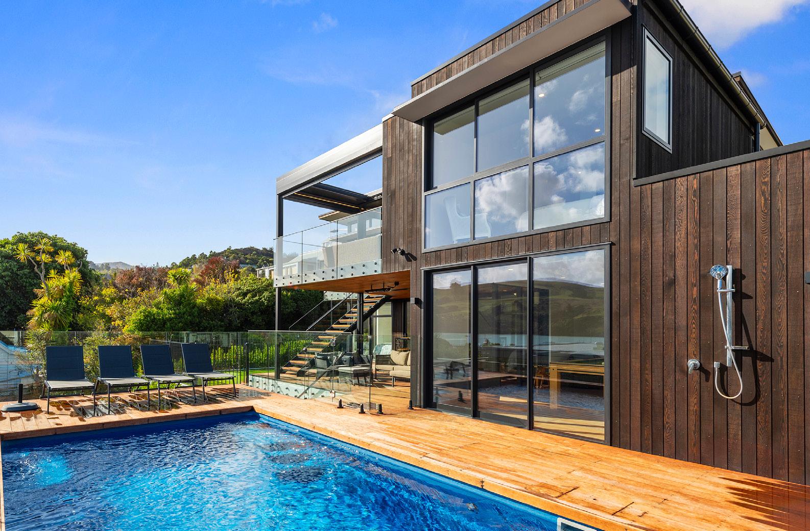To the west, the living areas open out to a generous deck and unobstructed views over South Shore to Kaikōura. To the east, a media room and primary bedroom suite occupy the upper level with three additional bedrooms and services below.