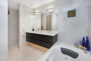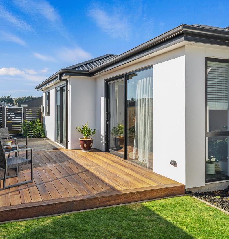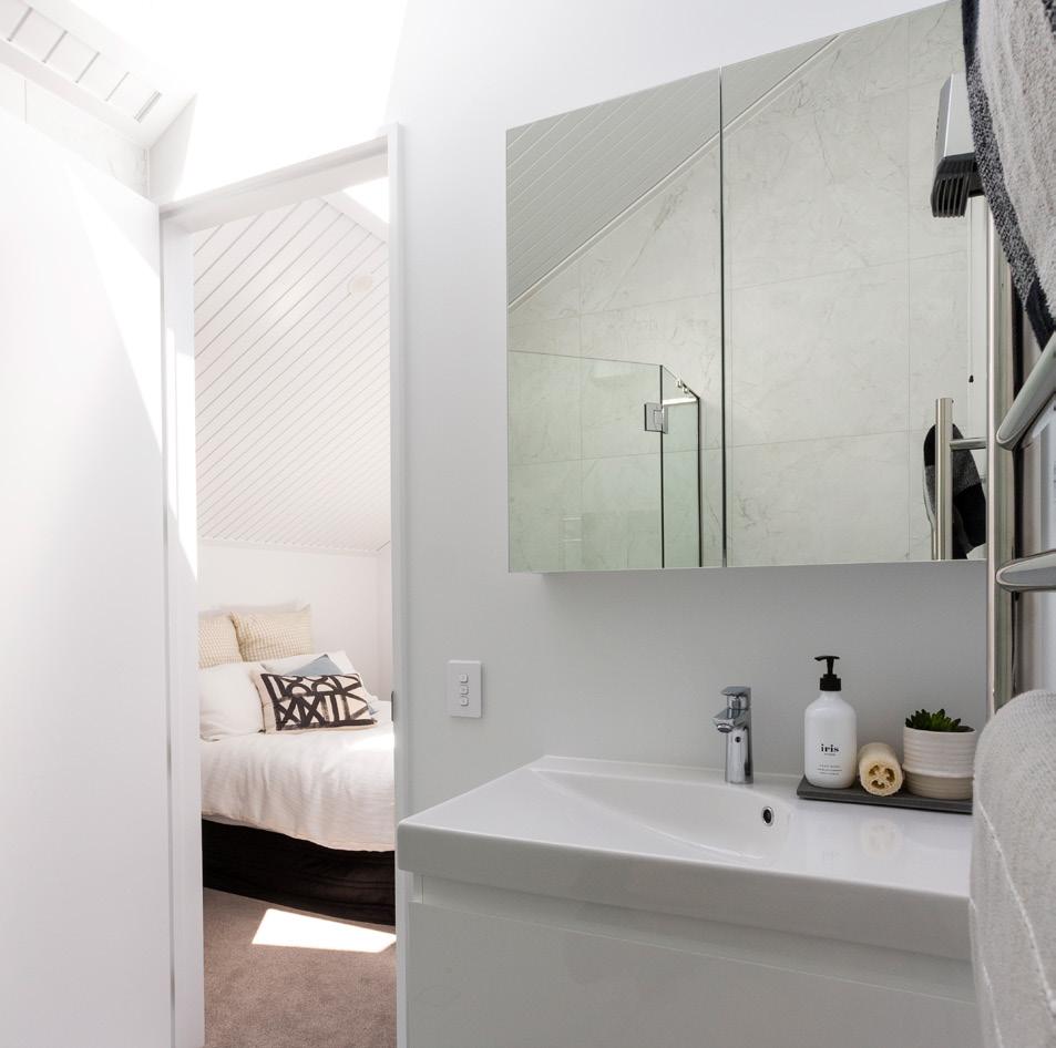 The clean lines of the kitchen joinery, bathroom fixtures and lighting create a bright, welcoming interior while on the exterior, a new dark colour scheme encompassing the roof, windows and cladding is an attractive contrast to the lighter exterior plastering and timber deck.