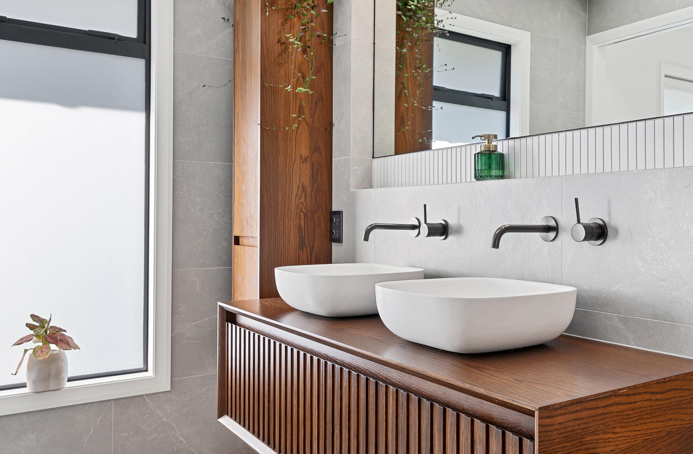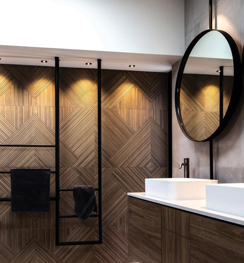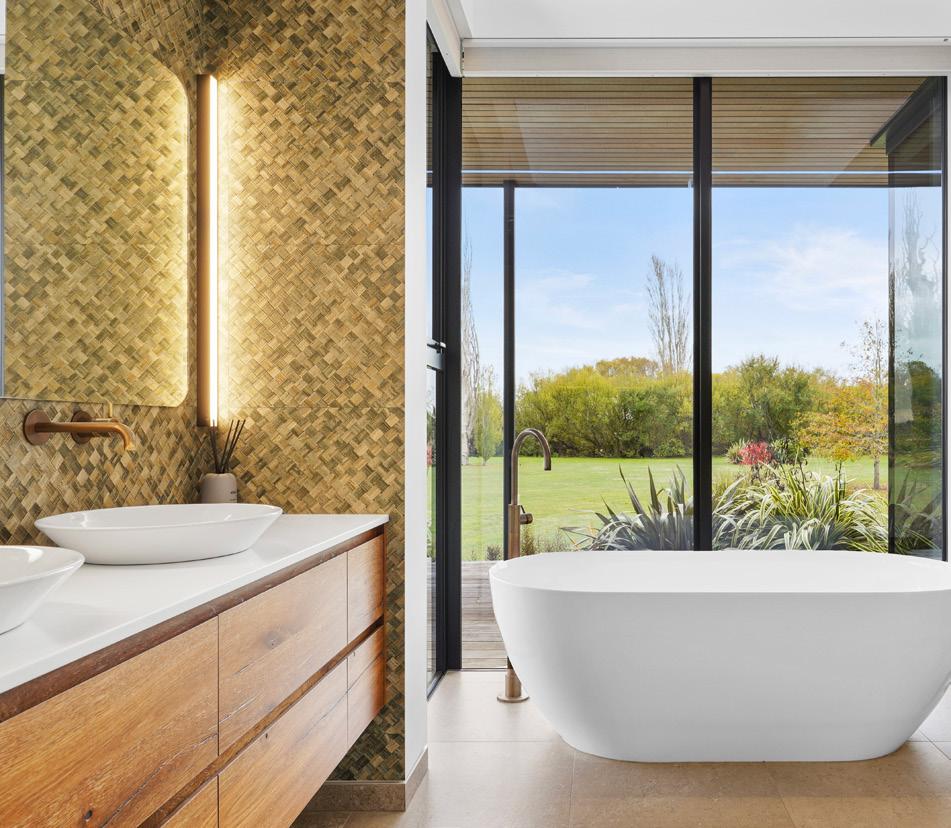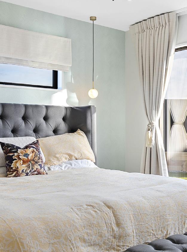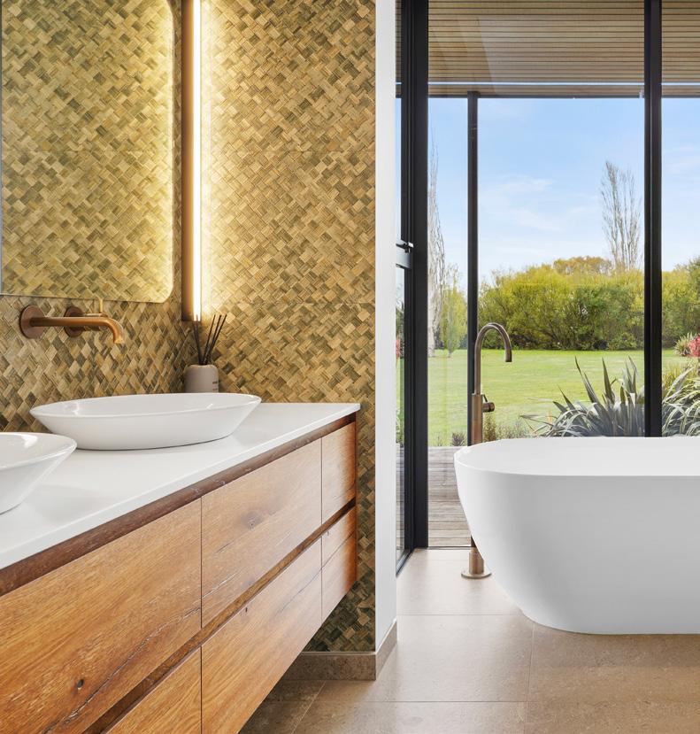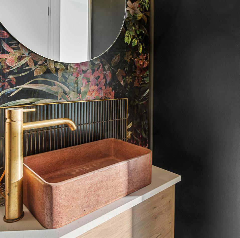 With floor-to-ceiling windows providing a 180-degree view across the expansive lawns and garden, this bathroom was designed to stop and linger in. It’s easy to imagine whiling away a few hours soaking in the deep freestanding tub. Subtle lighting and designer wallpaper with a woven pattern add glamorous texture and interest above the wall-mounted floating vanity. For more on this home, turn to page 120.