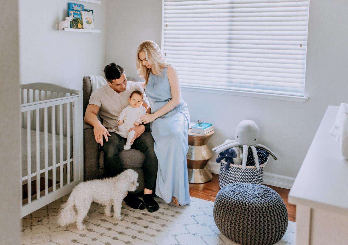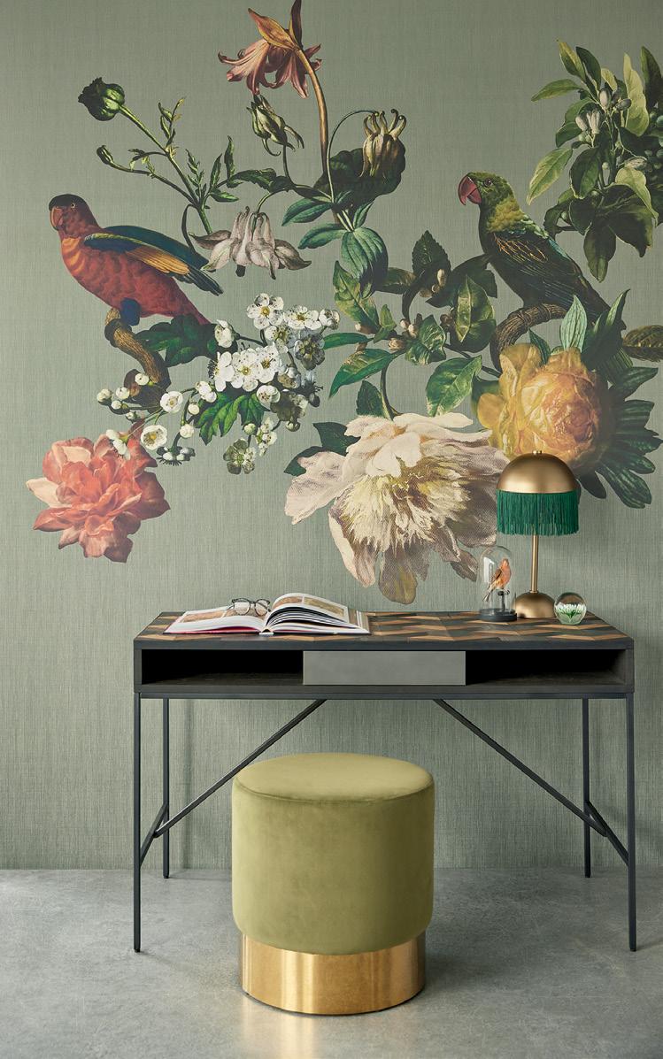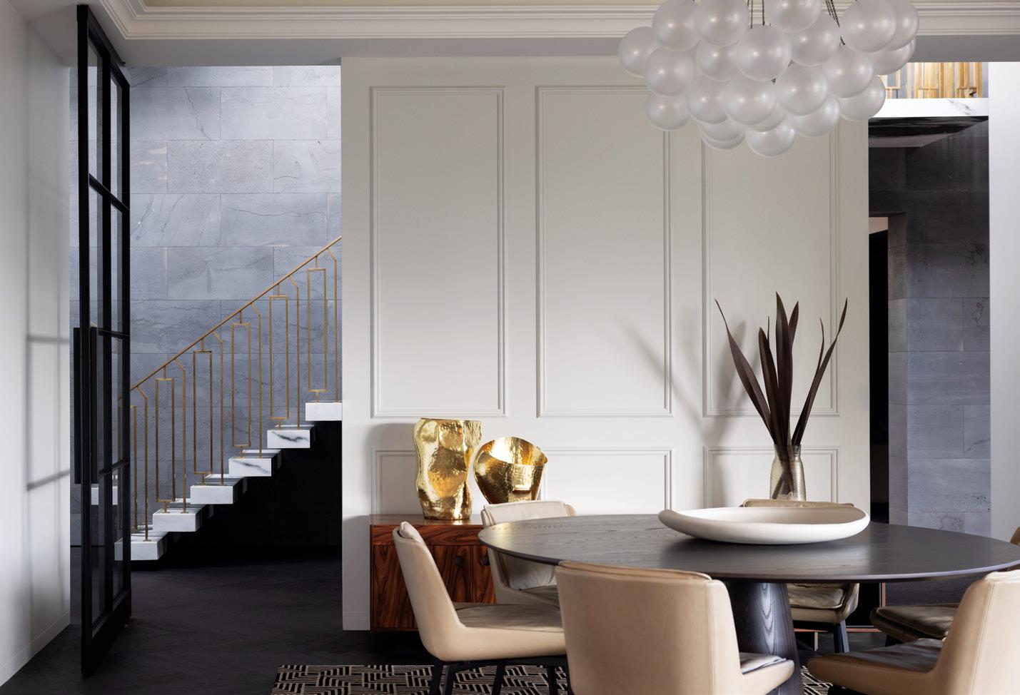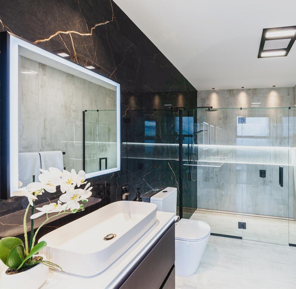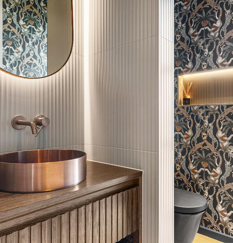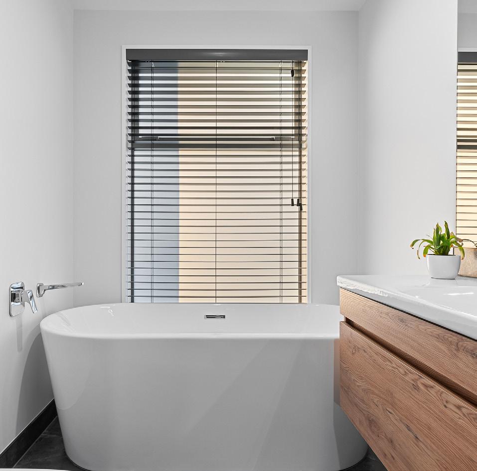 With floor-to-ceiling windows providing a 180-degree view across the expansive lawns and garden, this bathroom was designed to stop and linger in. It’s easy to imagine whiling away a few hours soaking in the deep freestanding tub. Subtle lighting and designer wallpaper with a woven pattern add glamorous texture and interest above the wall-mounted floating vanity. For more on this home, turn to page 120.