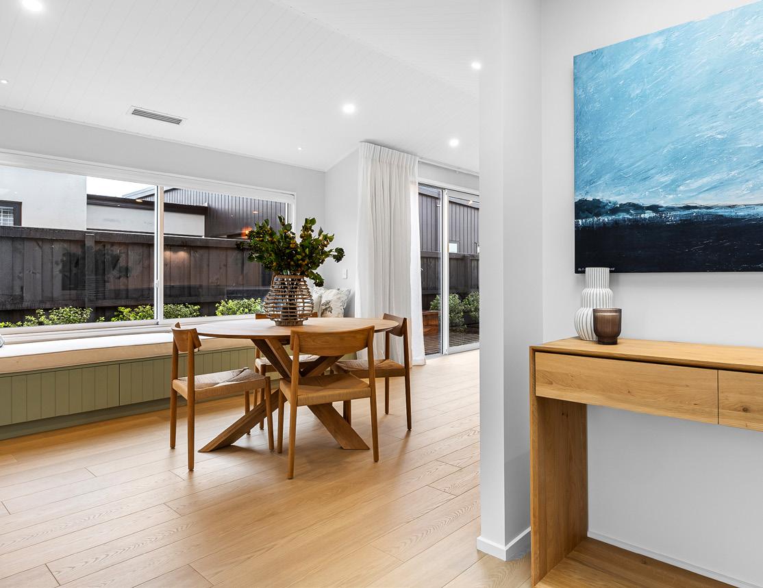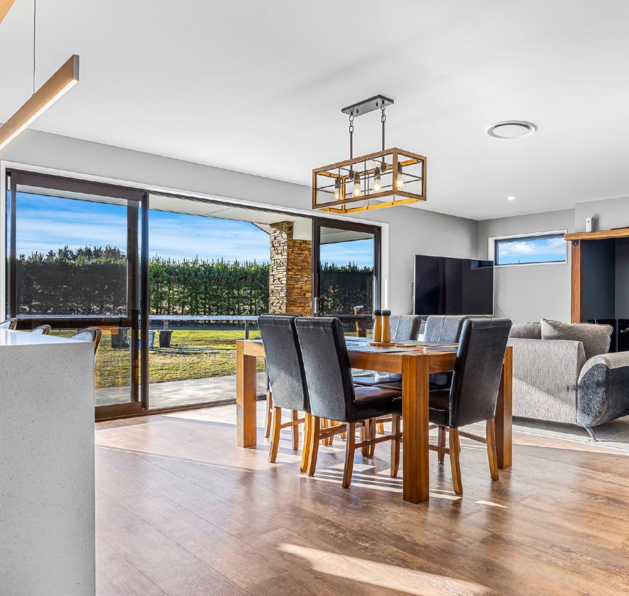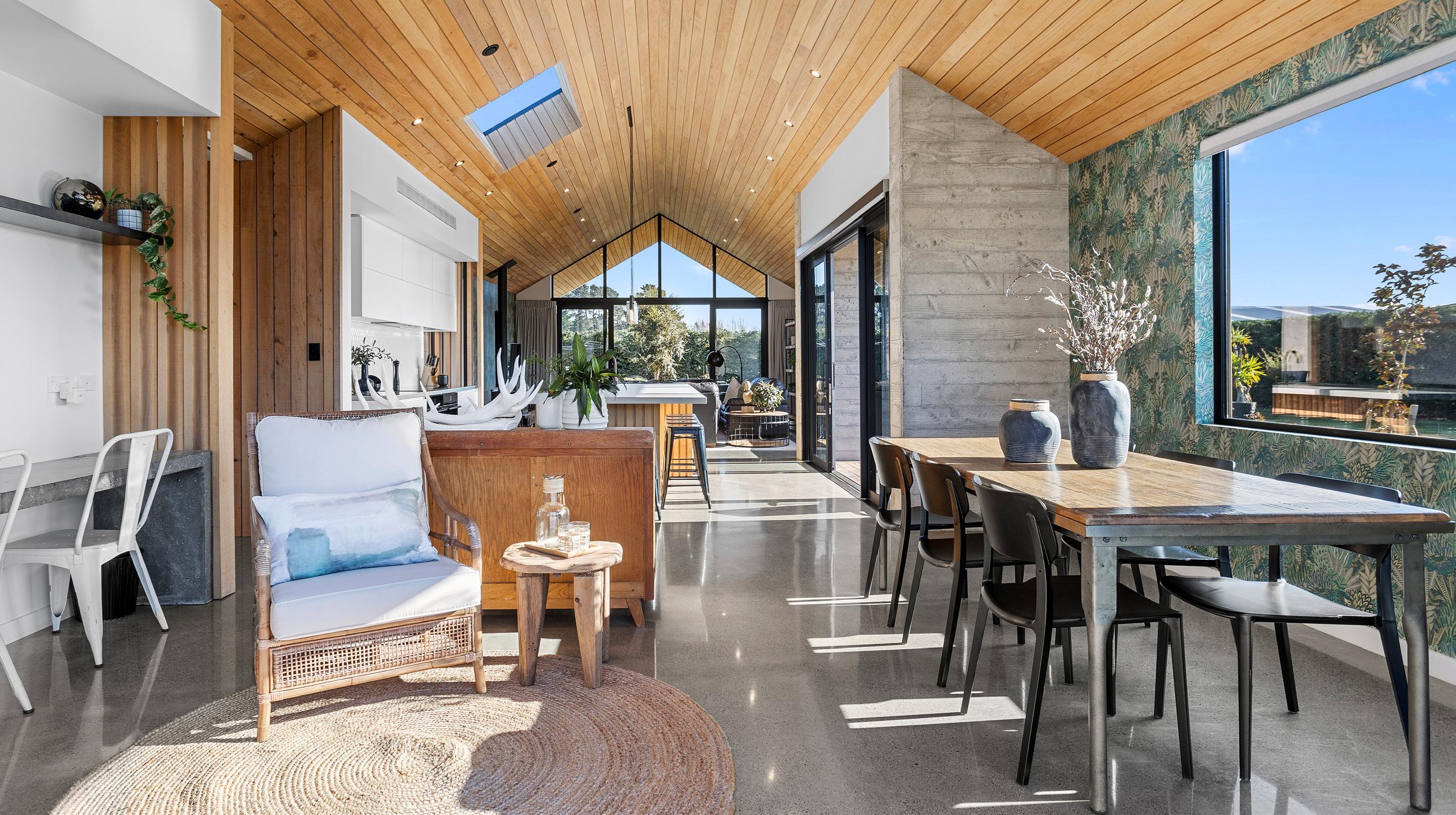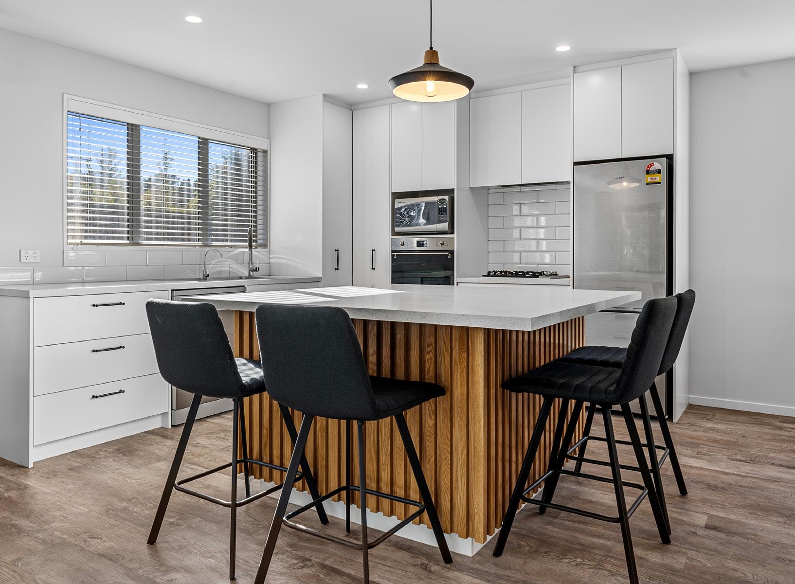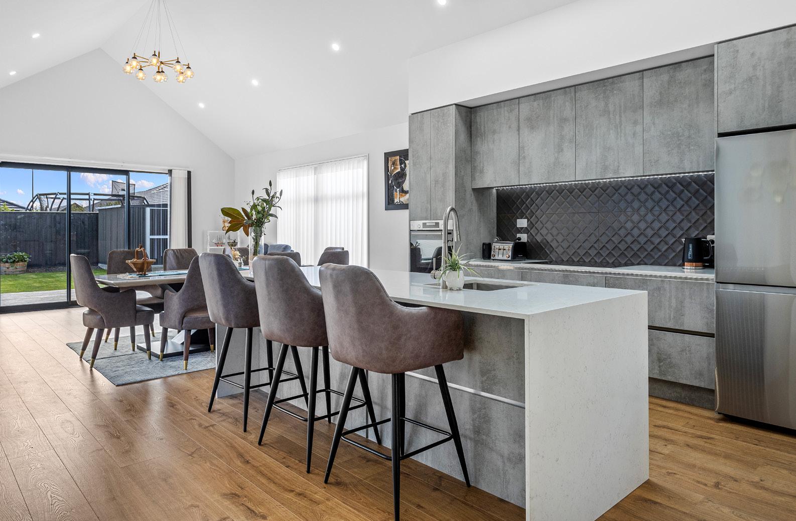 next to the dining table. A large island bench provides another spot to sit and divides kitchen from living with plenty of breathing space between each zone.