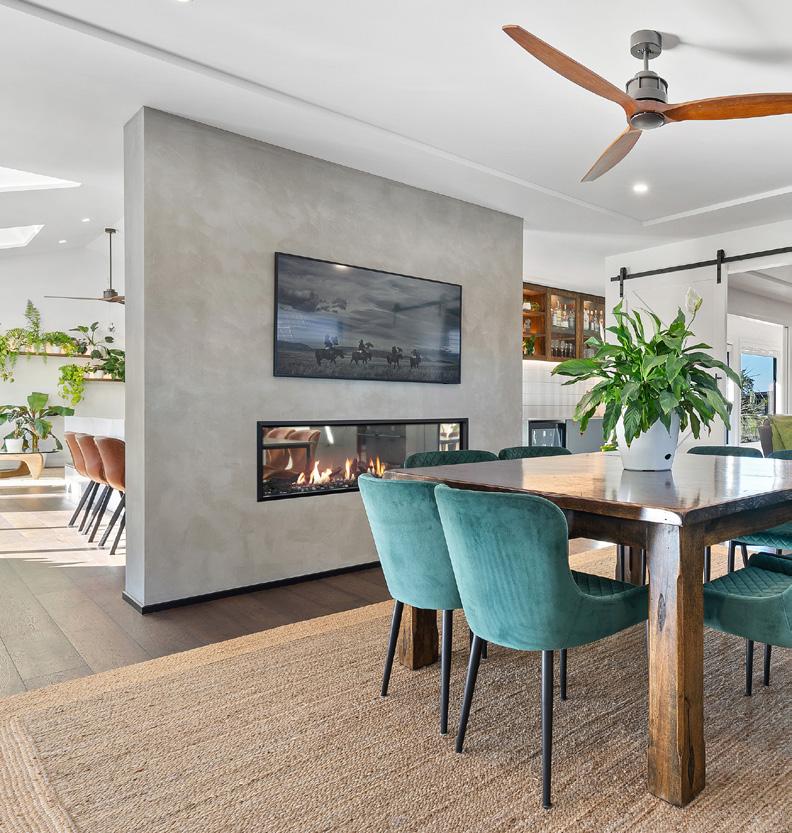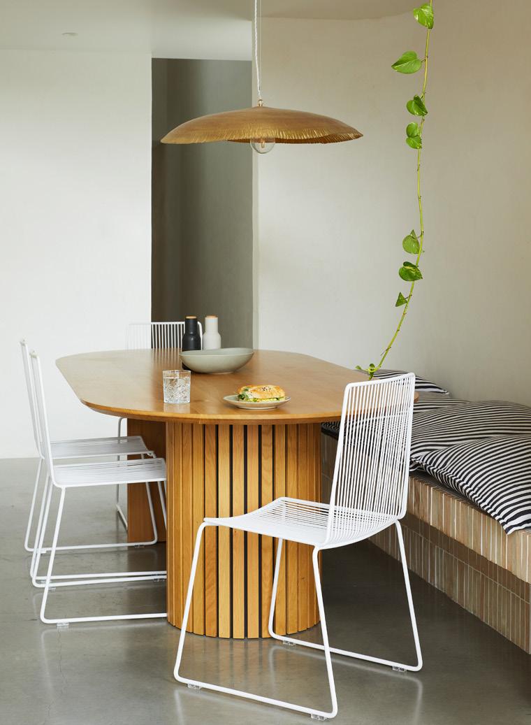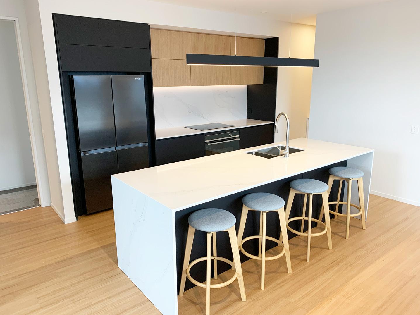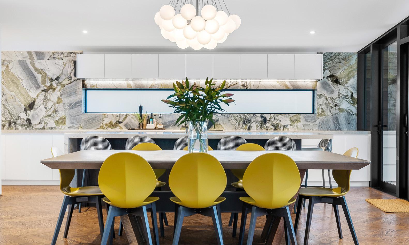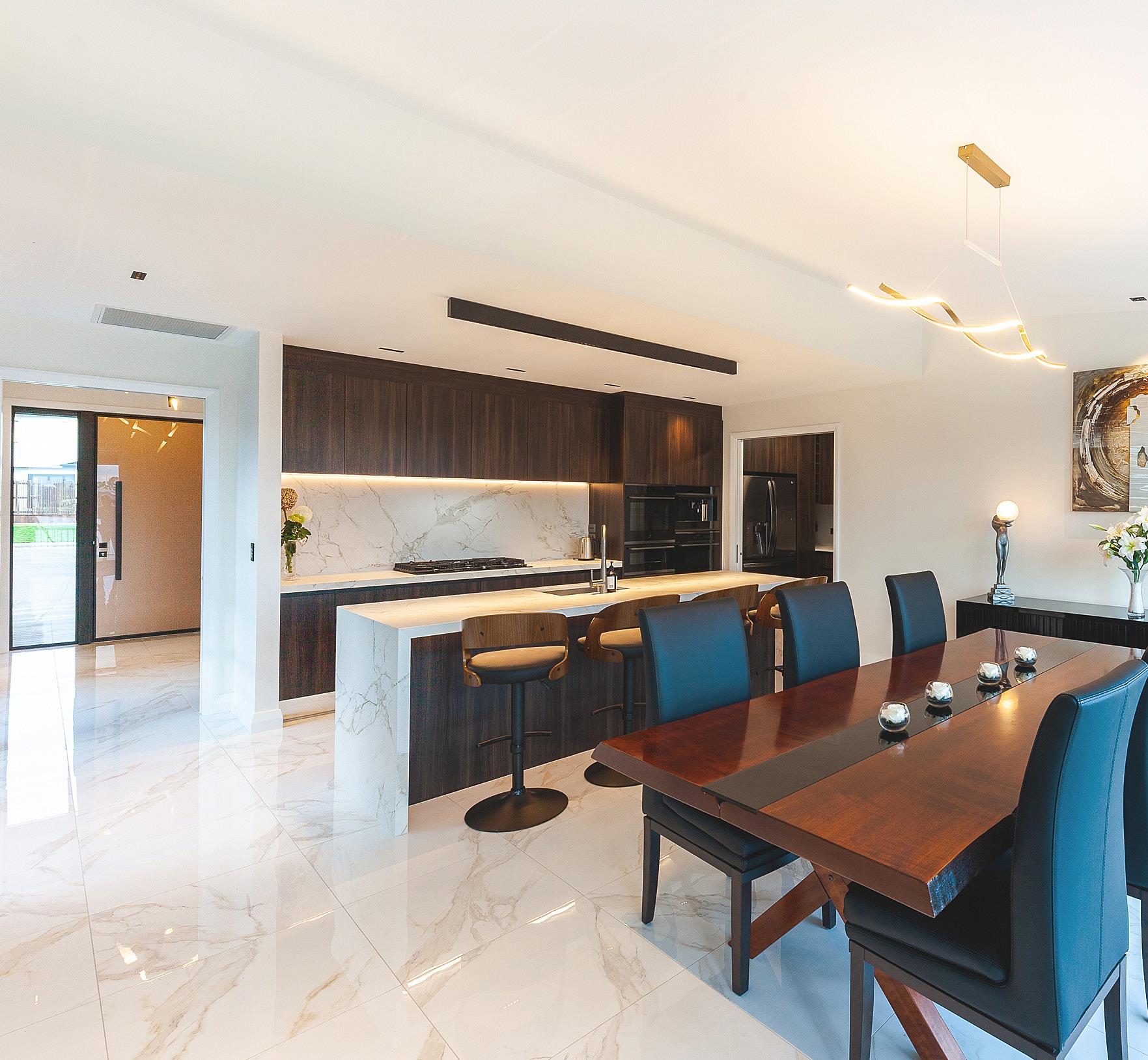 next to the dining table. A large island bench provides another spot to sit and divides kitchen from living with plenty of breathing space between each zone.