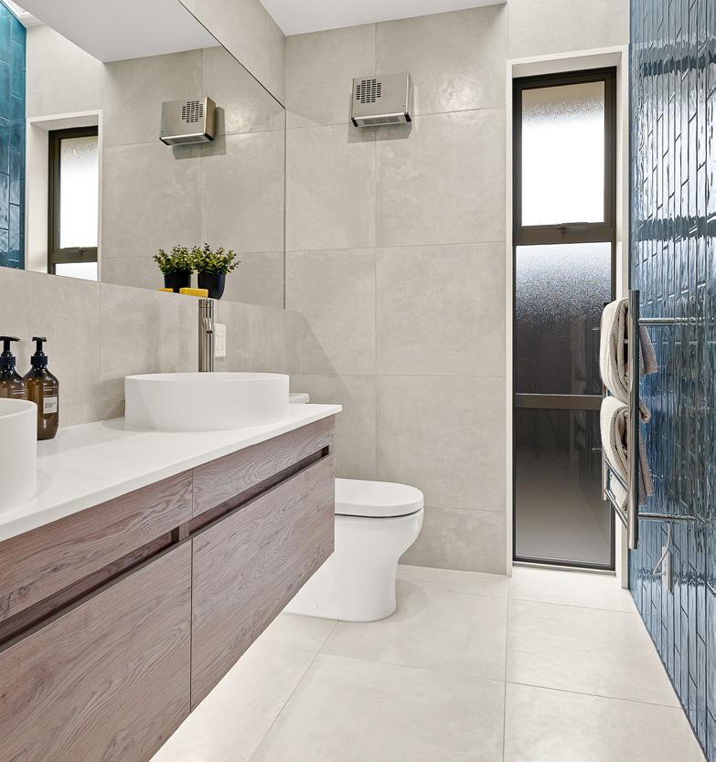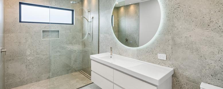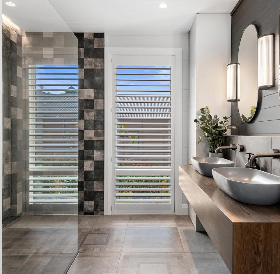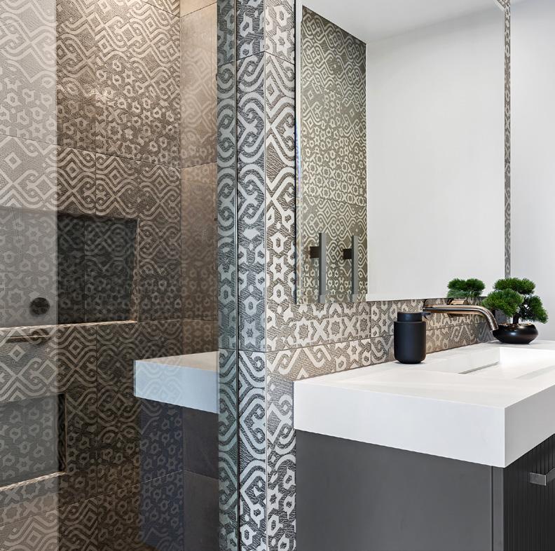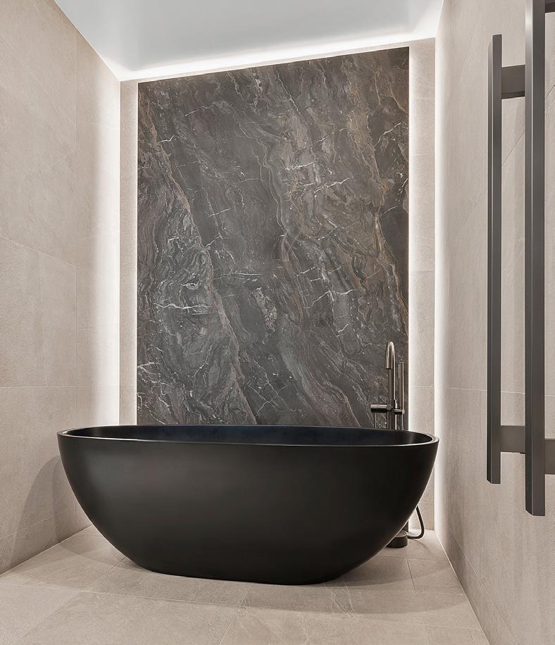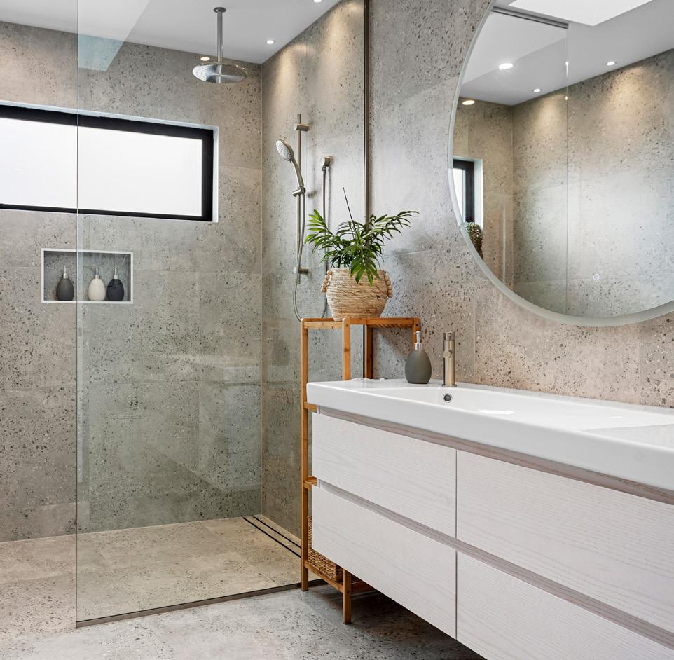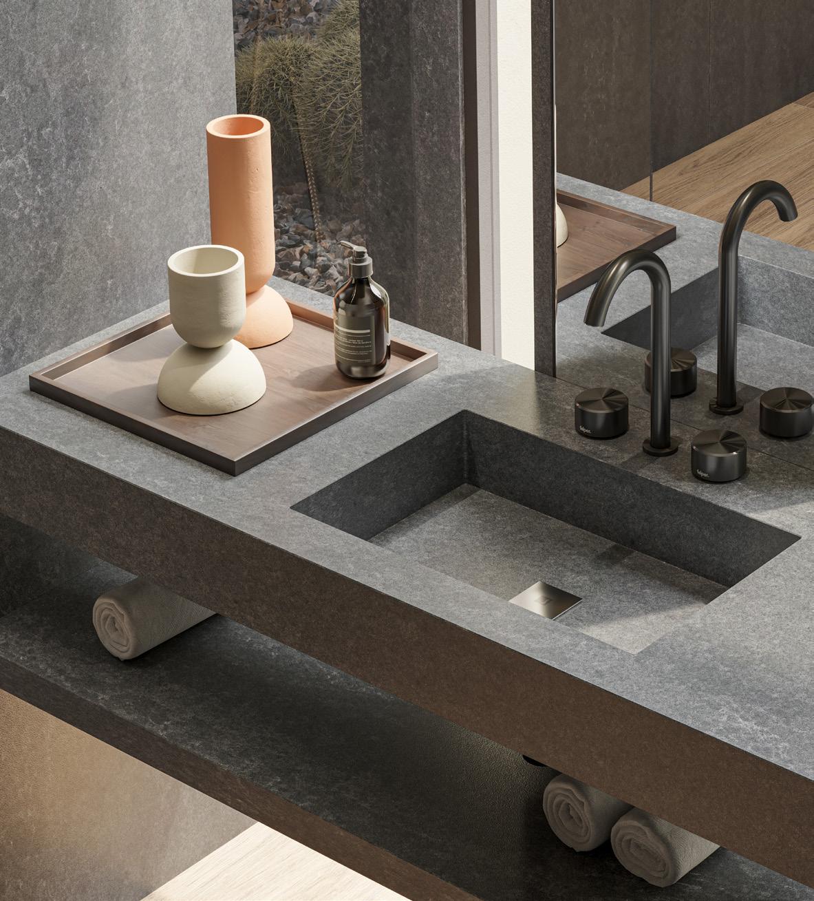 Earthic, released at the Milan Furniture Fair, is a sustainable surface material that works beautifully in bathrooms. From grey with white recycled PET fragments that creates a subtle pattern through to darker tones punctuated with white accents, this finish is modern yet minimal. consentino.com/en-nz