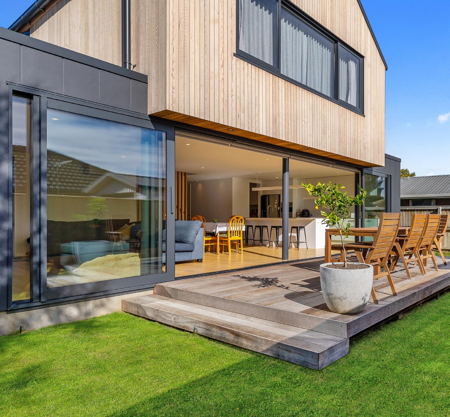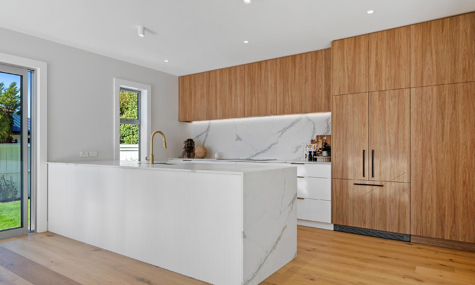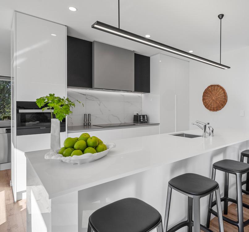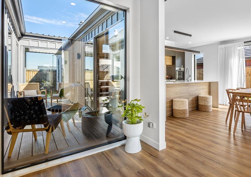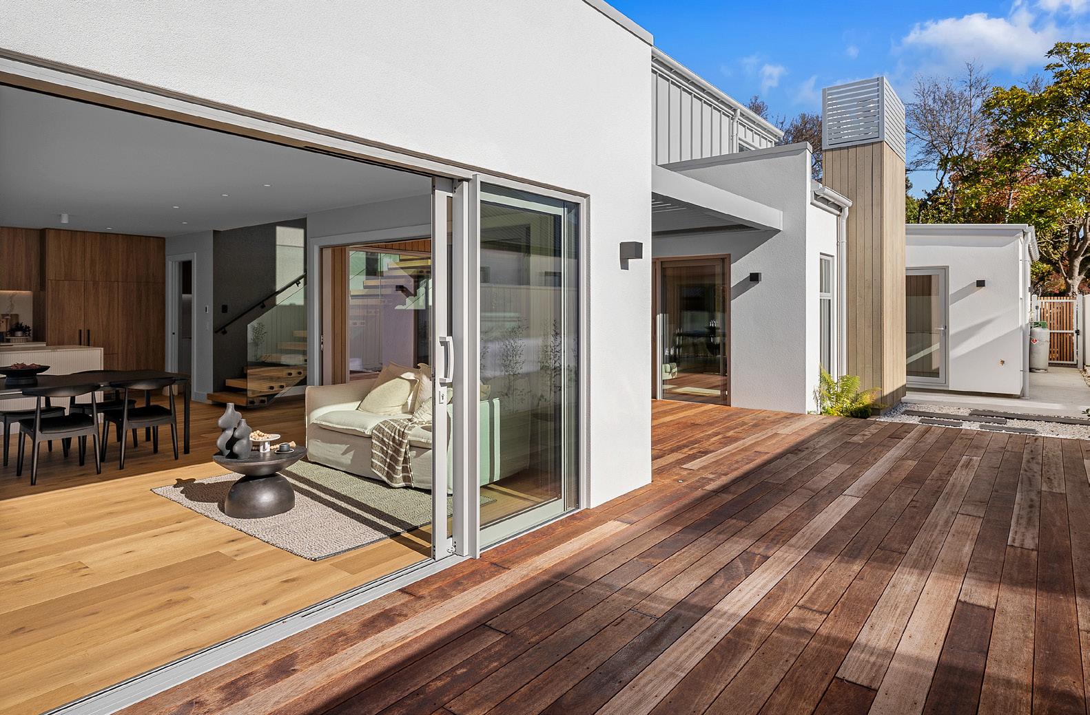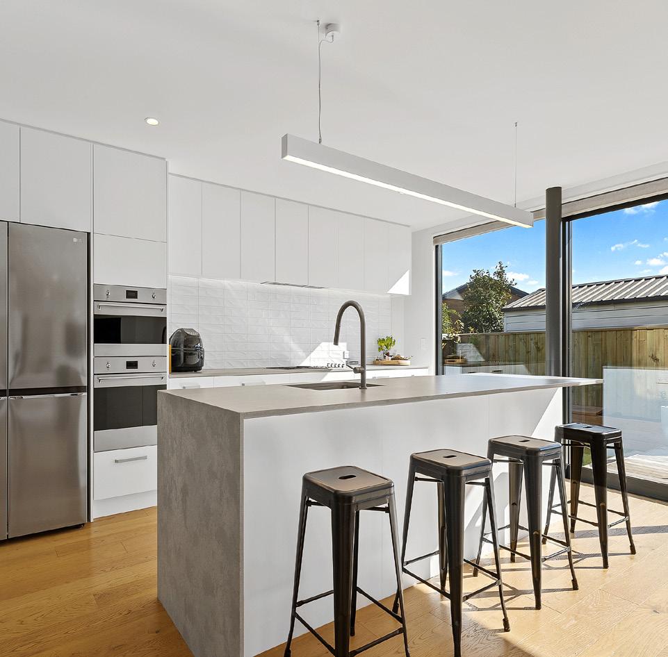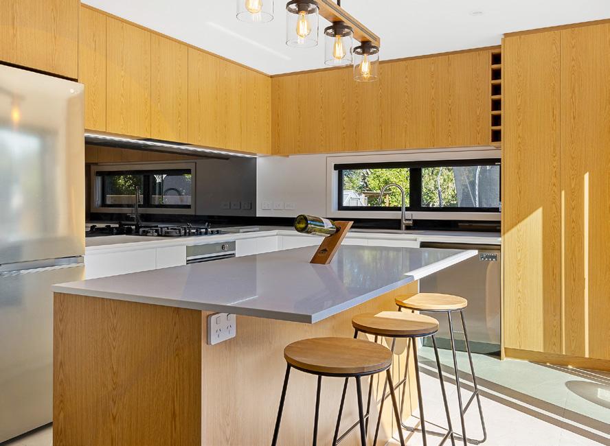 thanks to the back wall, which is made entirely of glass stacker doors. These open out to an expansive kwila deck, seamlessly merging the indoor and outdoor spaces, ideal for entertaining year-round. The kitchen boasts ample bench space with a butler’s pantry to hide away all the clutter. The result is a home that’s the epitome of modern, functional family living – without the large footprint.