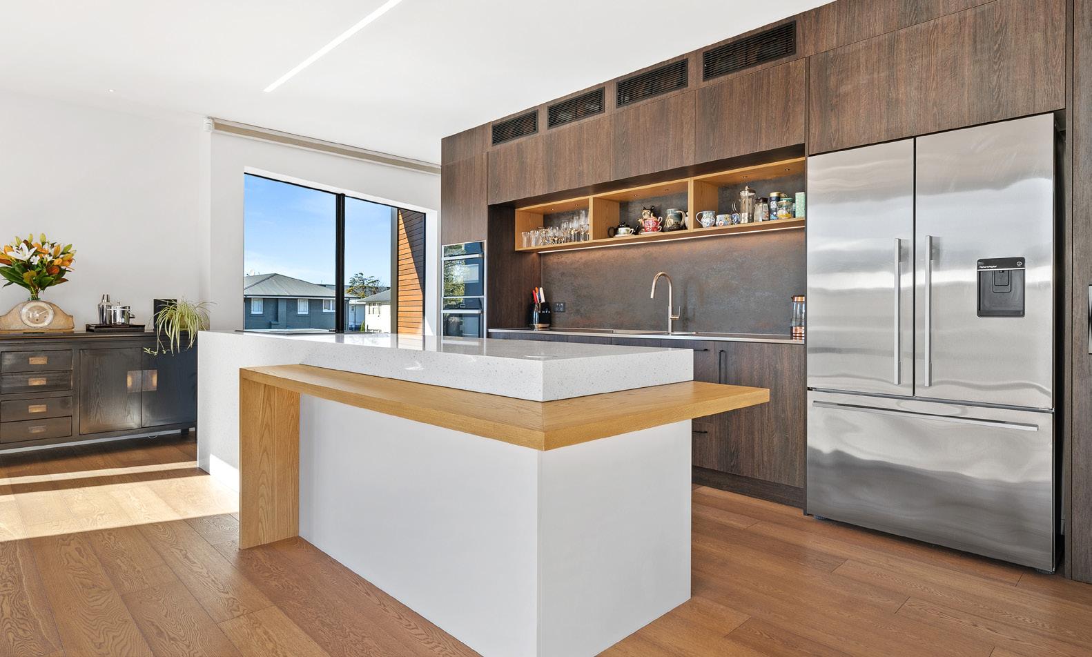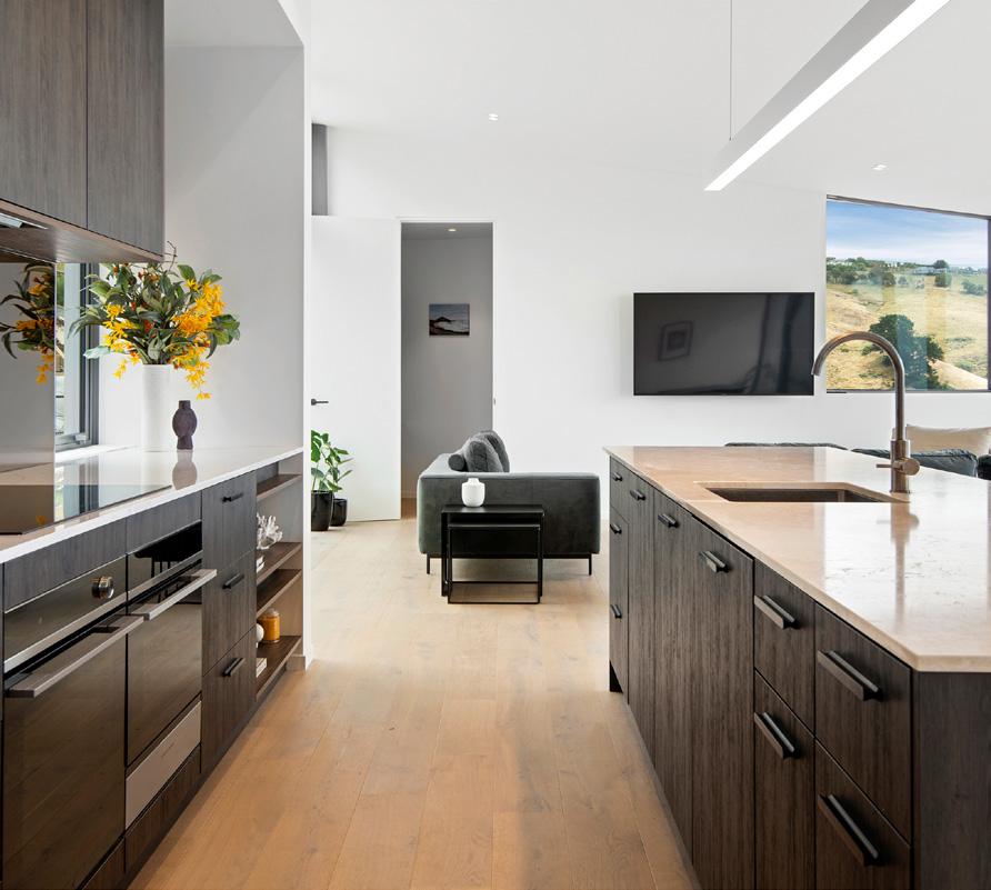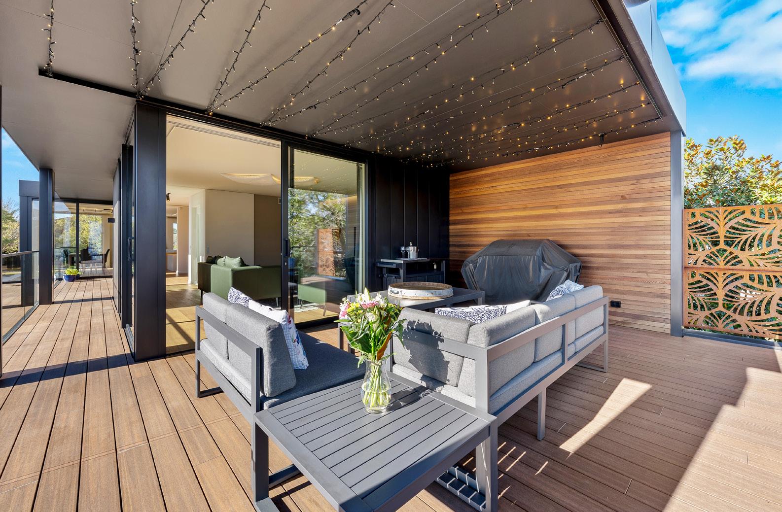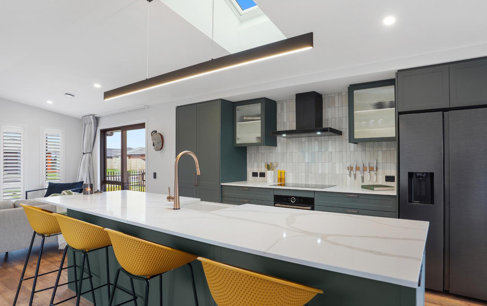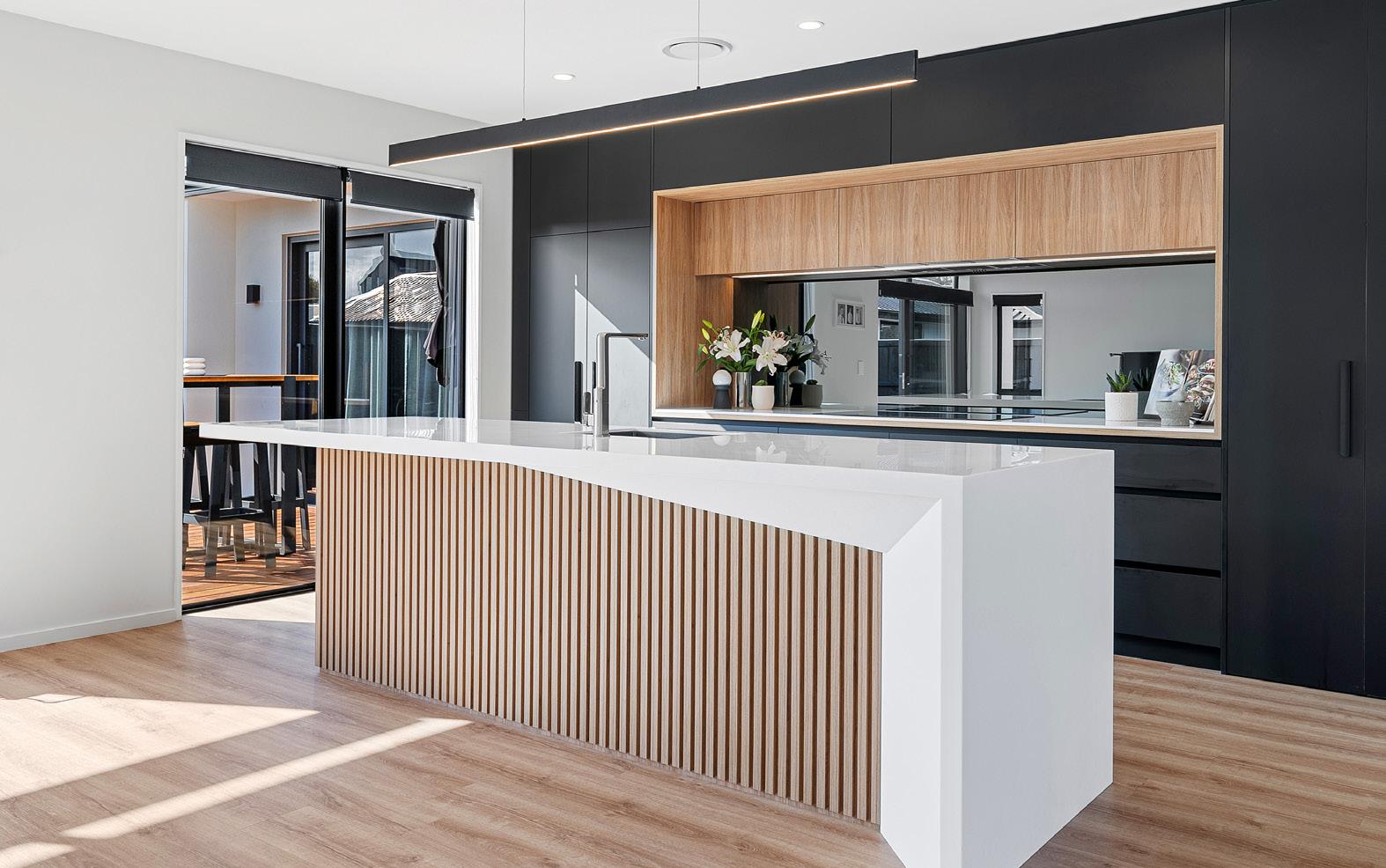 thanks to the back wall, which is made entirely of glass stacker doors. These open out to an expansive kwila deck, seamlessly merging the indoor and outdoor spaces, ideal for entertaining year-round. The kitchen boasts ample bench space with a butler’s pantry to hide away all the clutter. The result is a home that’s the epitome of modern, functional family living – without the large footprint.