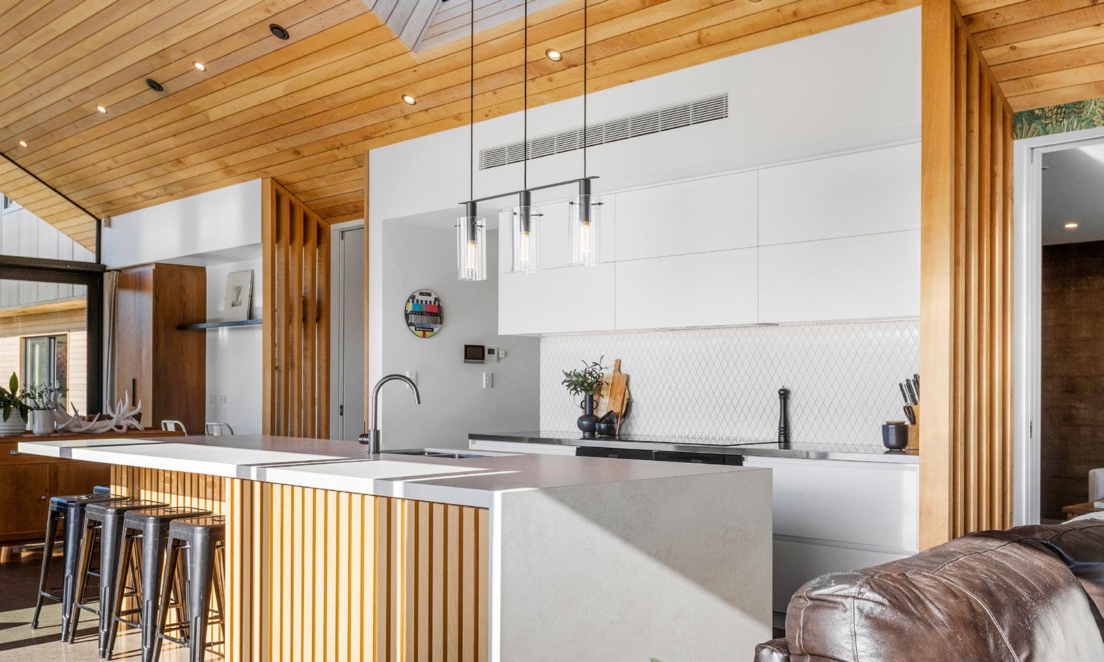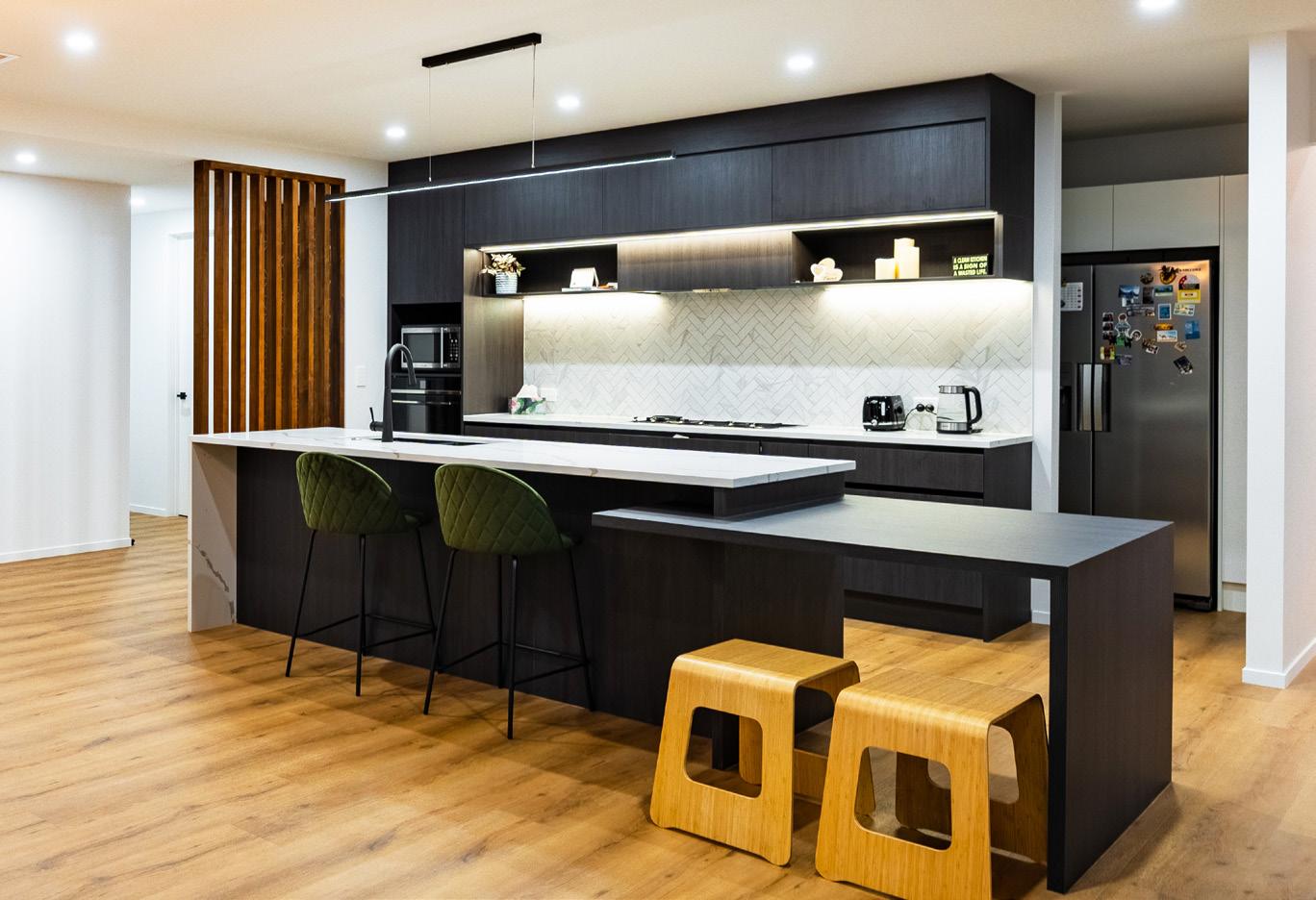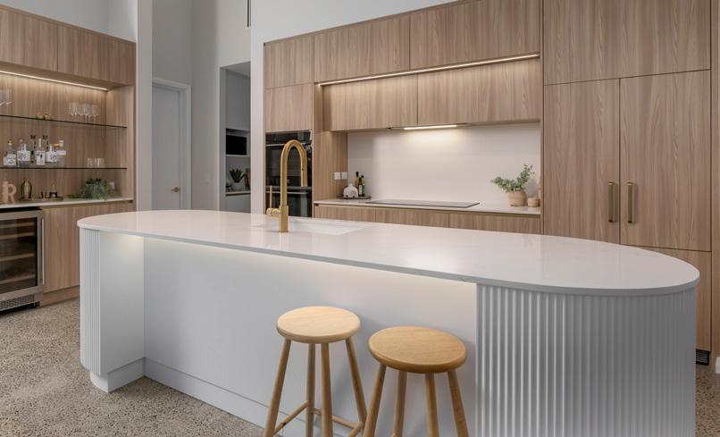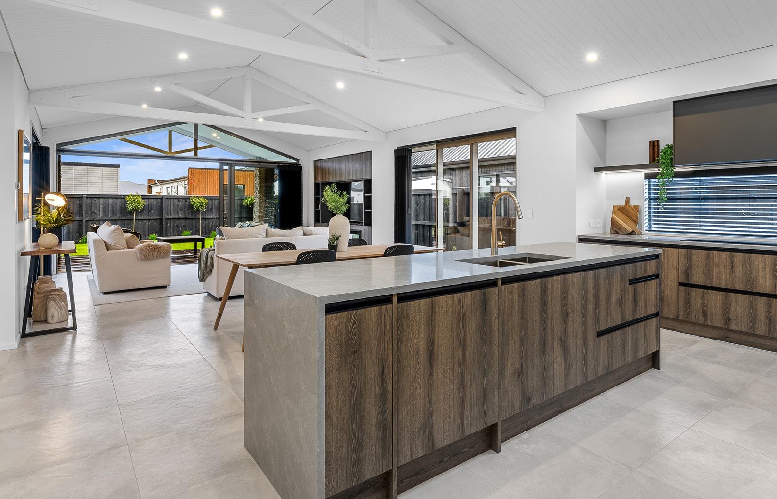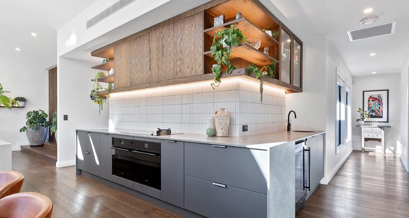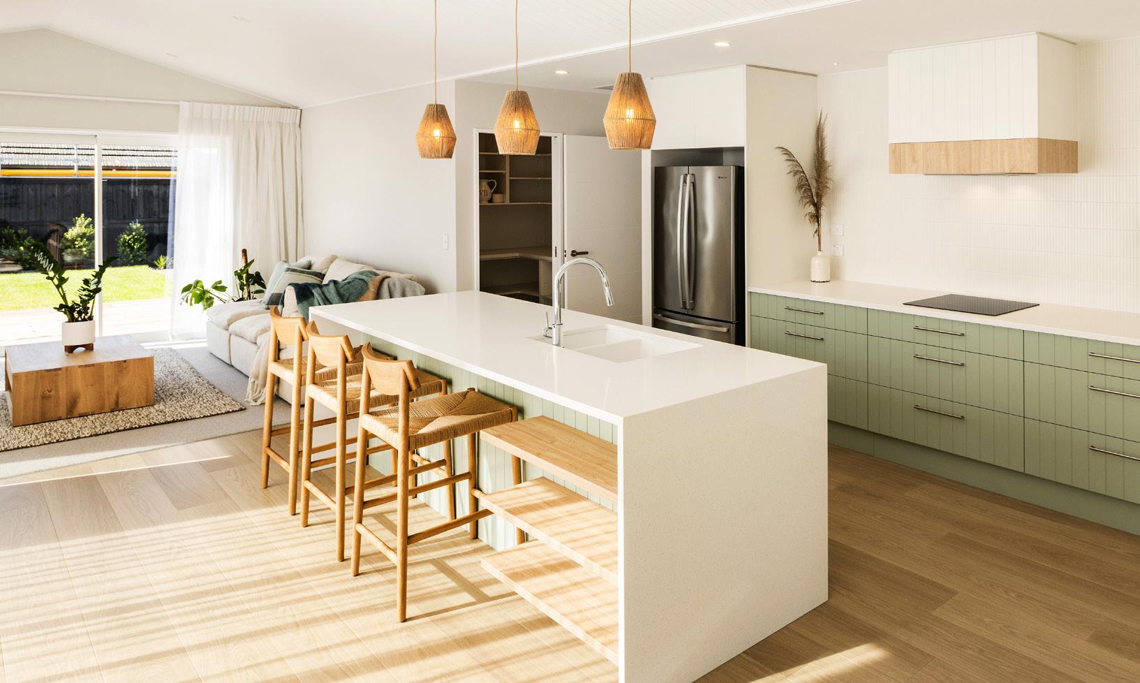thanks to the back wall, which is made entirely of glass stacker doors. These open out to an expansive kwila deck, seamlessly merging the indoor and outdoor spaces, ideal for entertaining year-round. The kitchen boasts ample bench space with a butler’s pantry to hide away all the clutter. The result is a home that’s the epitome of modern, functional family living – without the large footprint.