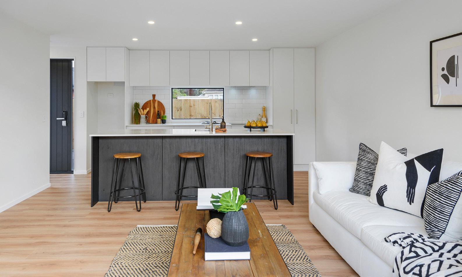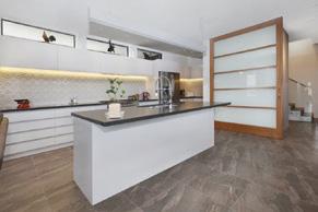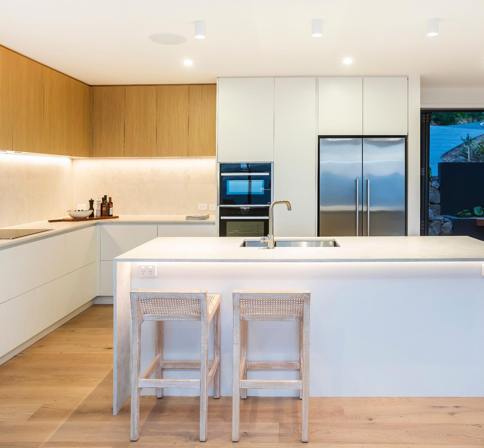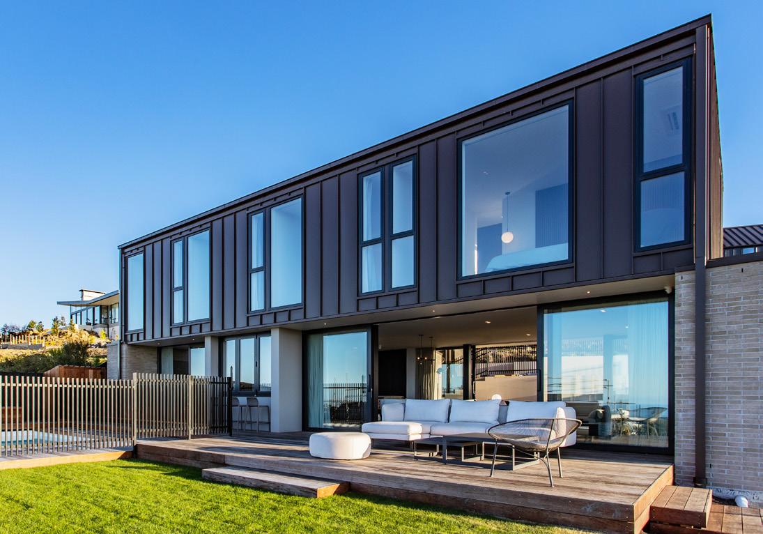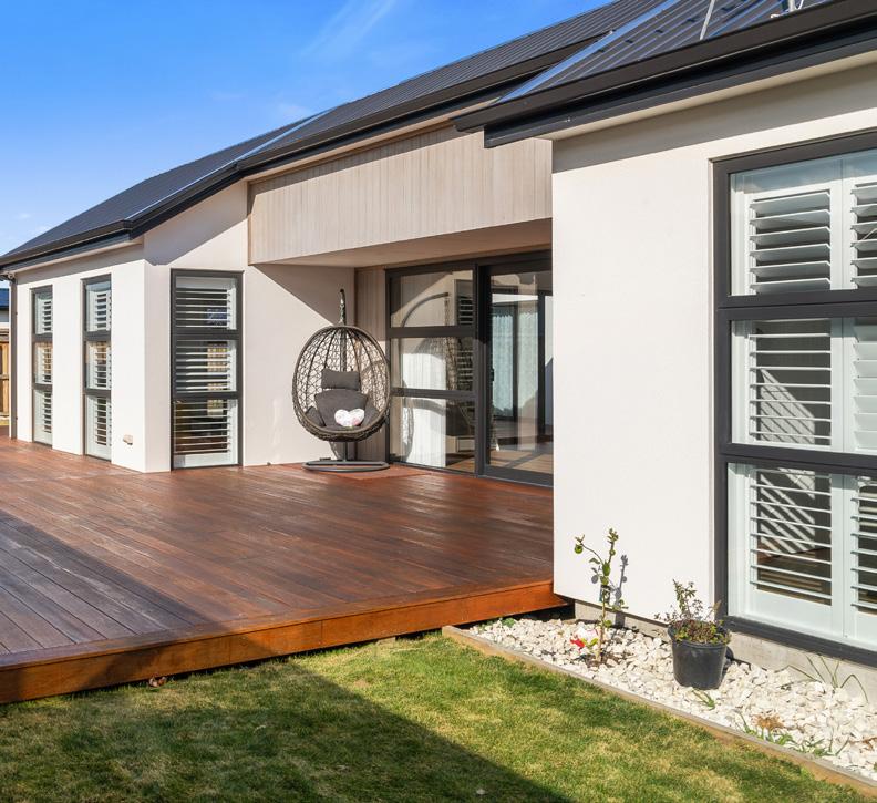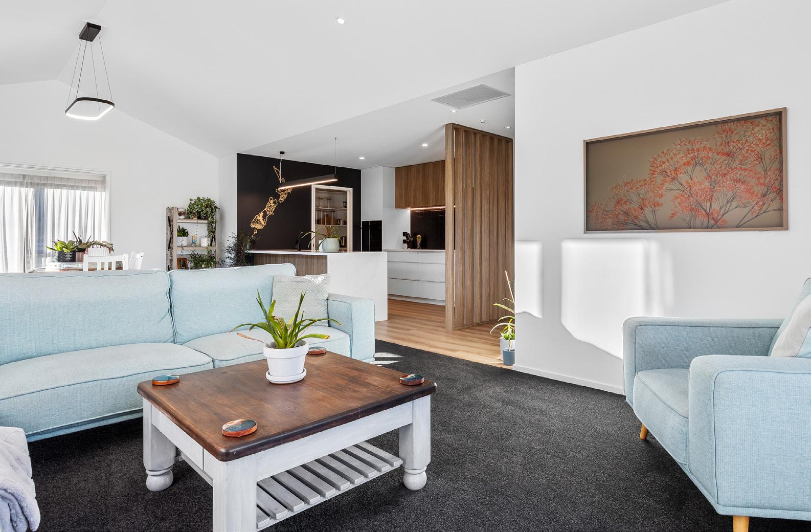 thanks to the back wall, which is made entirely of glass stacker doors. These open out to an expansive kwila deck, seamlessly merging the indoor and outdoor spaces, ideal for entertaining year-round. The kitchen boasts ample bench space with a butler’s pantry to hide away all the clutter. The result is a home that’s the epitome of modern, functional family living – without the large footprint.