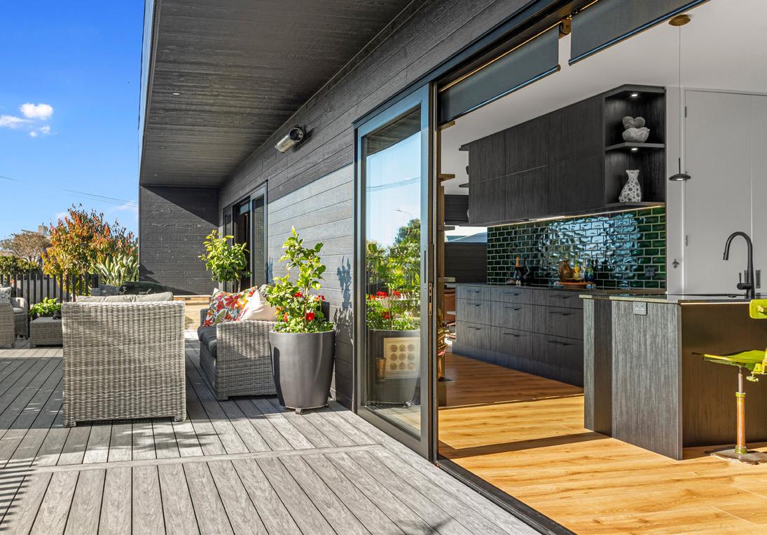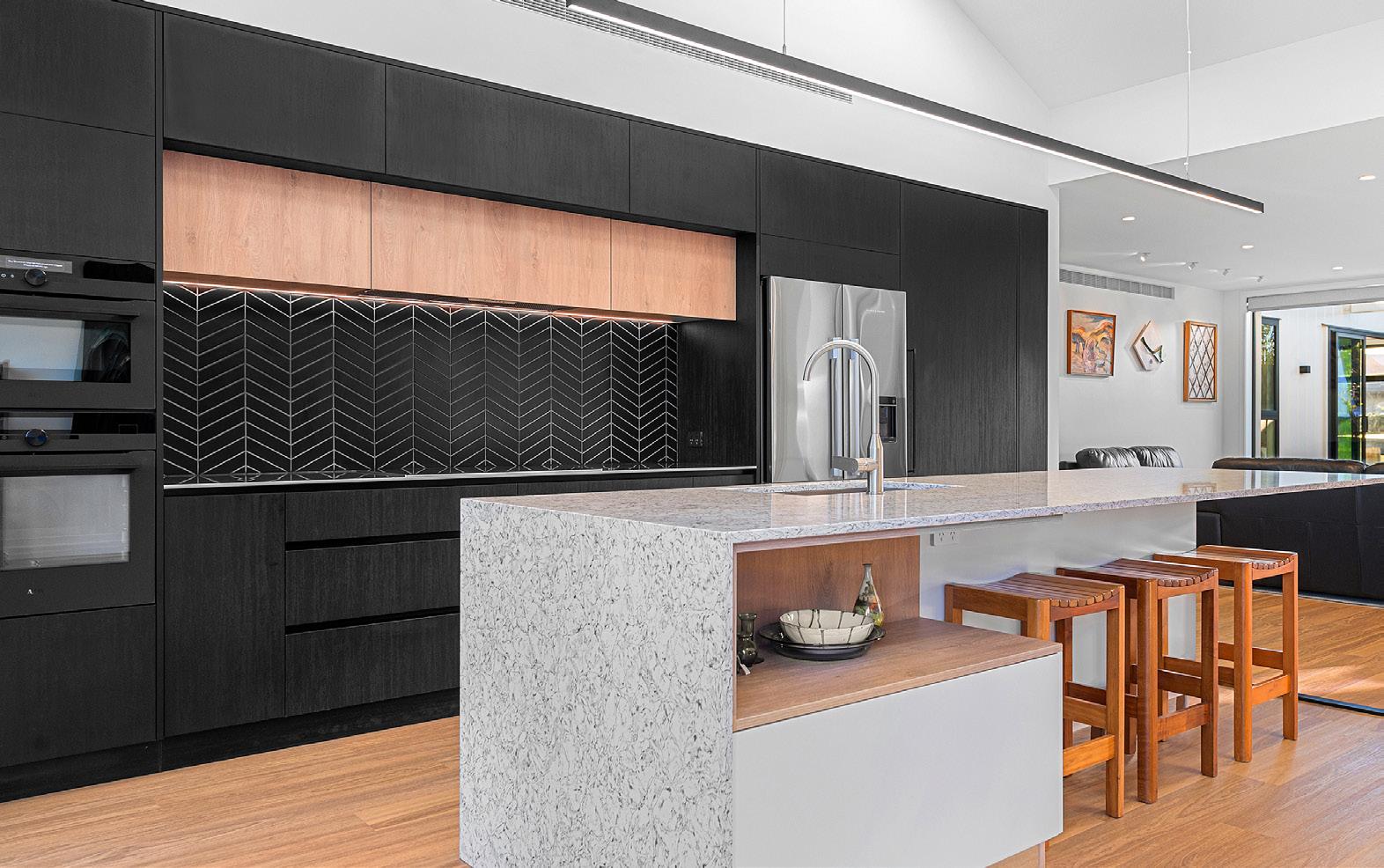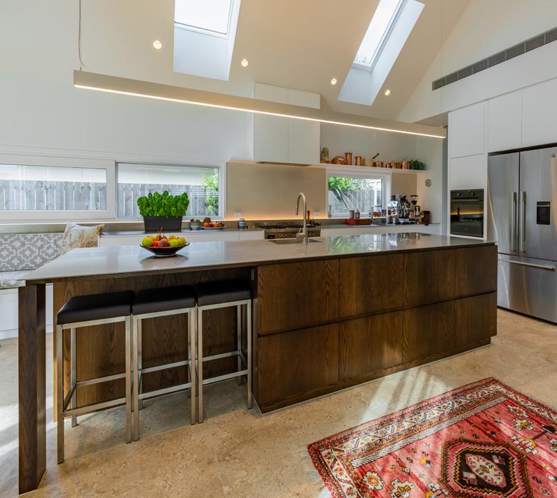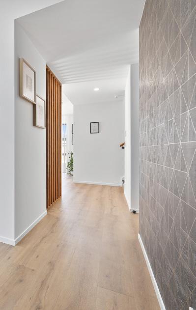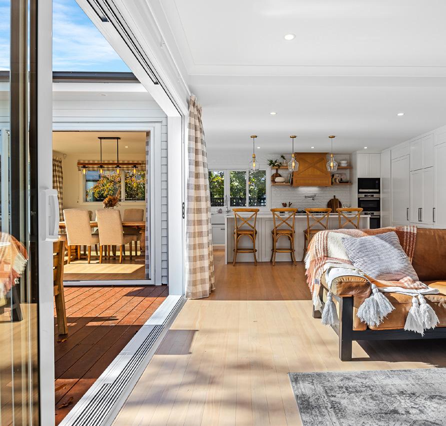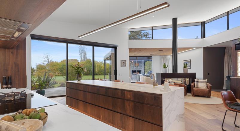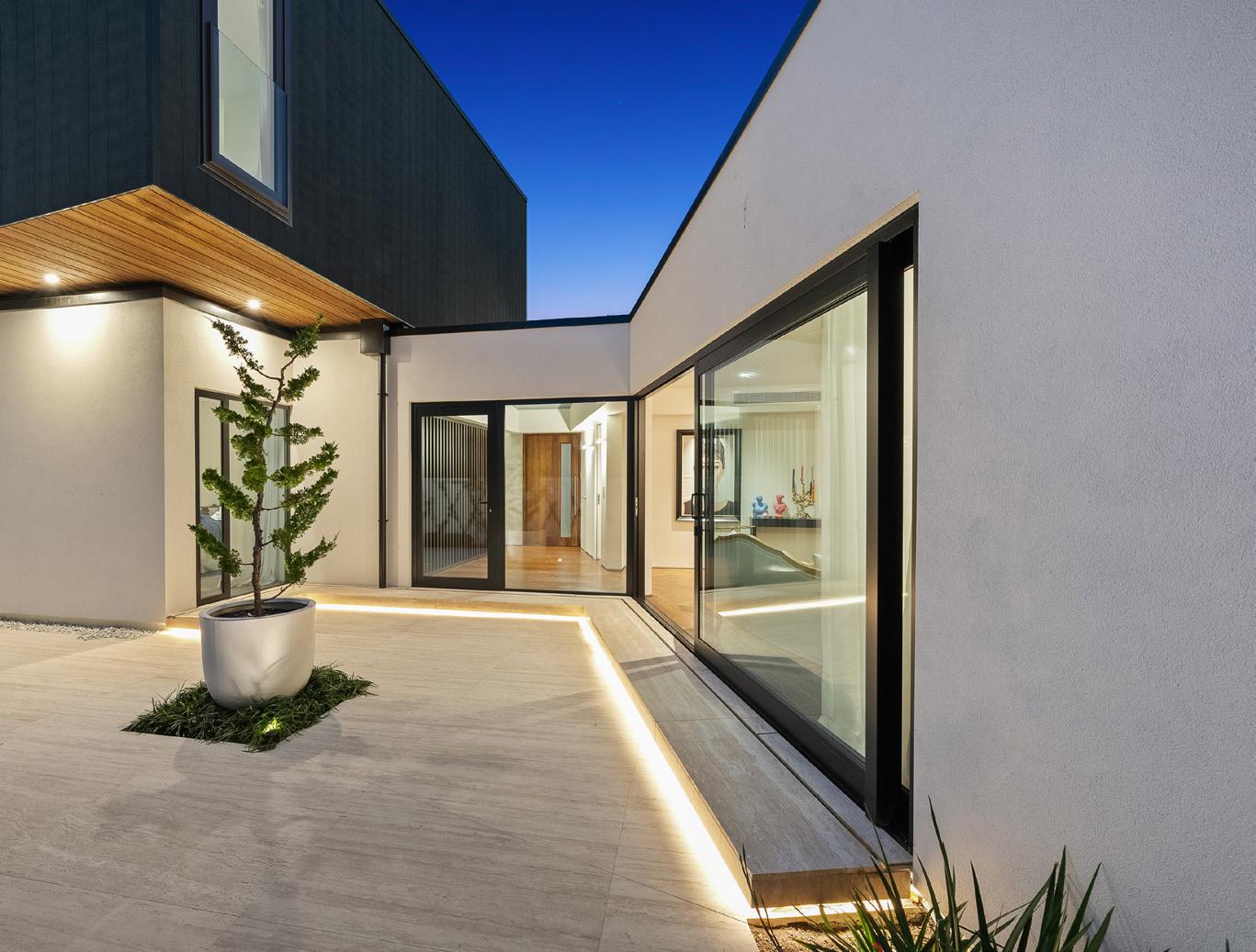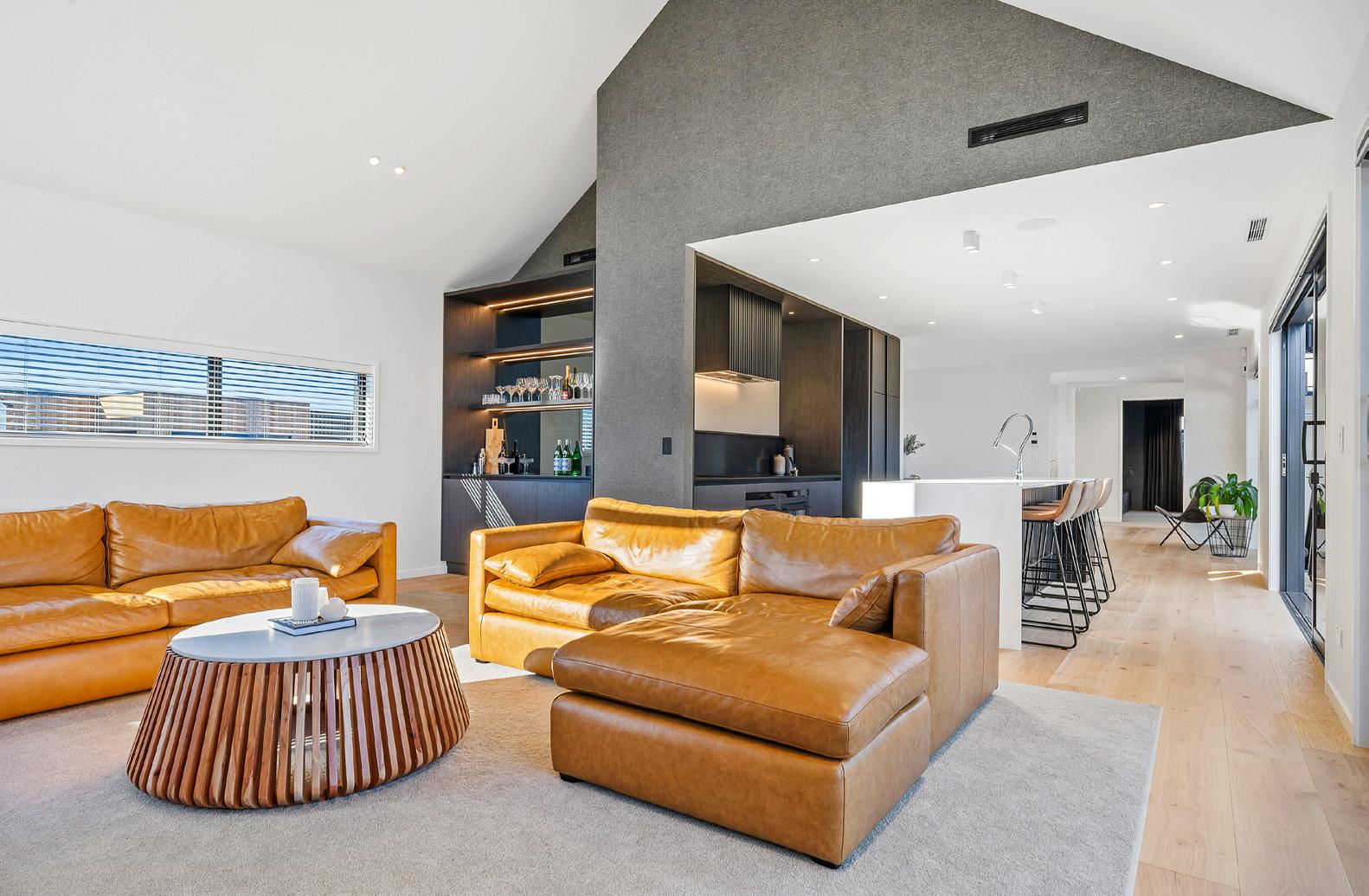 thanks to the back wall, which is made entirely of glass stacker doors. These open out to an expansive kwila deck, seamlessly merging the indoor and outdoor spaces, ideal for entertaining year-round. The kitchen boasts ample bench space with a butler’s pantry to hide away all the clutter. The result is a home that’s the epitome of modern, functional family living – without the large footprint.