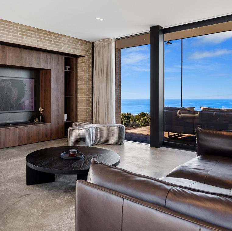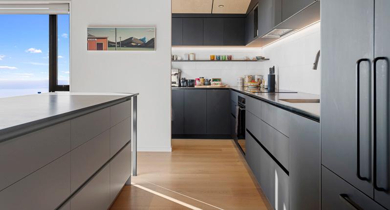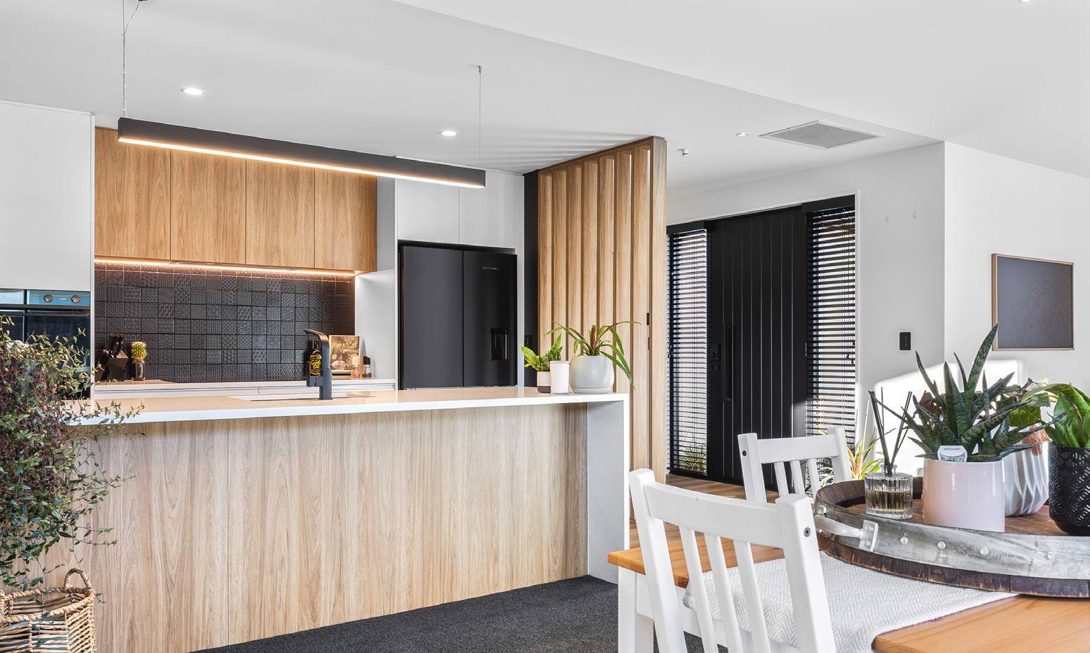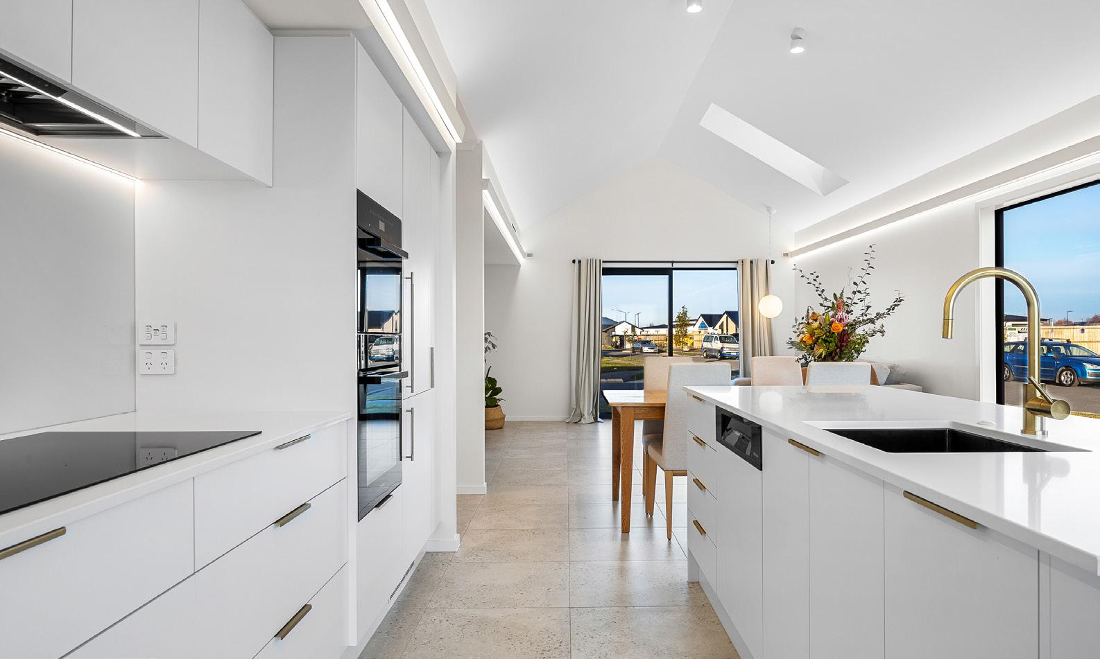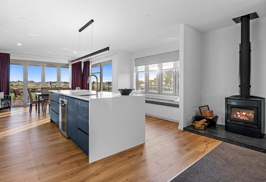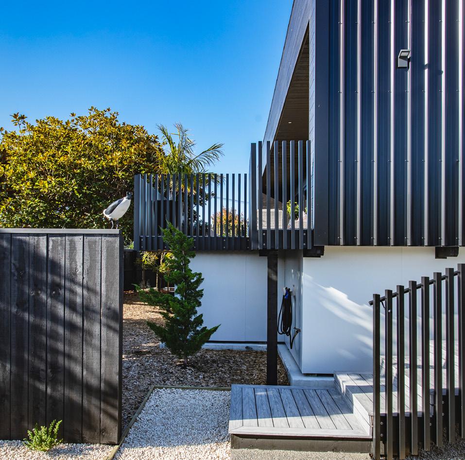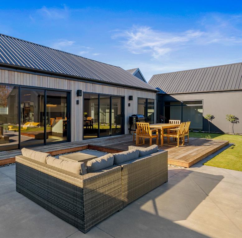 thanks to the back wall, which is made entirely of glass stacker doors. These open out to an expansive kwila deck, seamlessly merging the indoor and outdoor spaces, ideal for entertaining year-round. The kitchen boasts ample bench space with a butler’s pantry to hide away all the clutter. The result is a home that’s the epitome of modern, functional family living – without the large footprint.