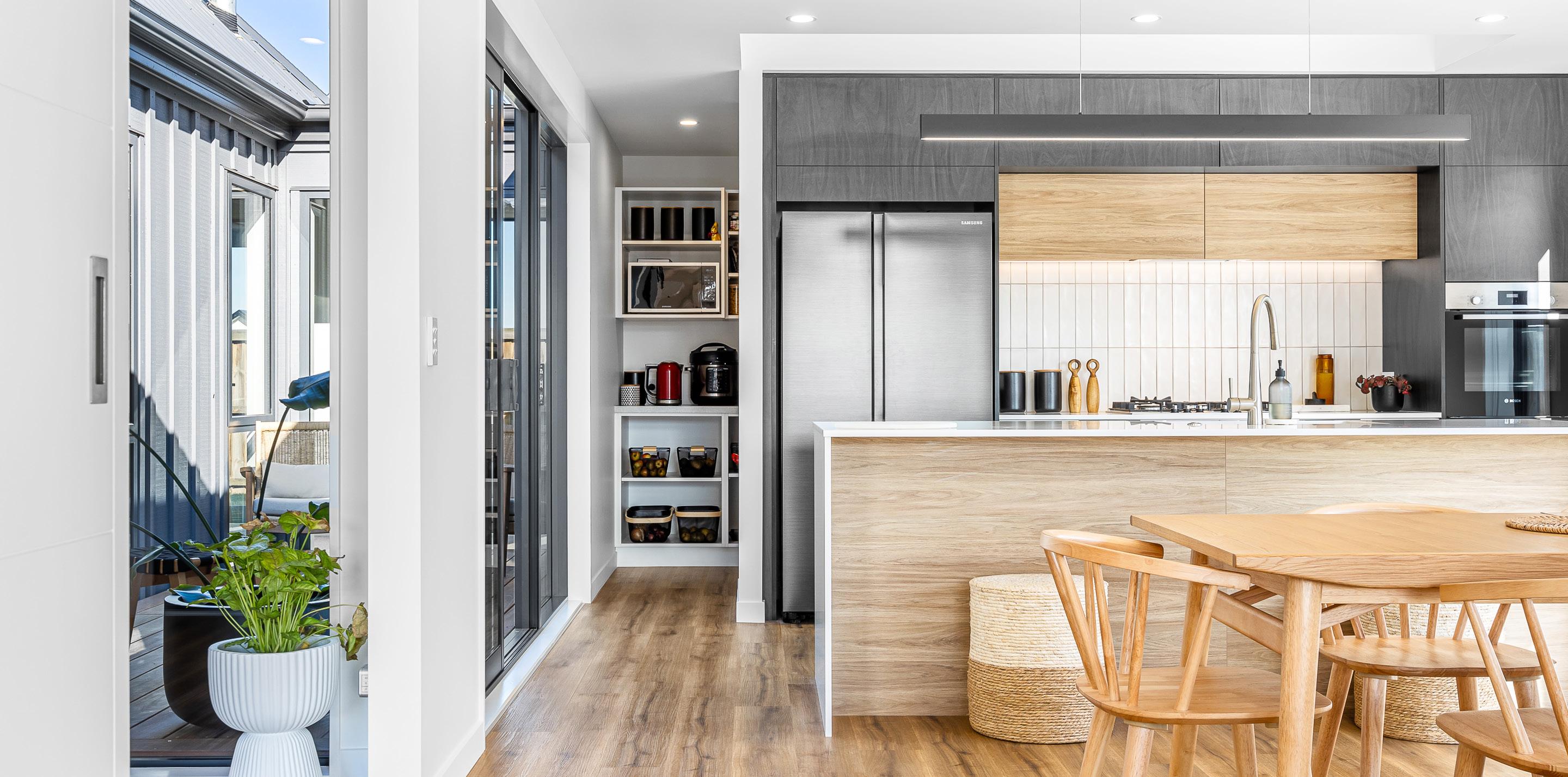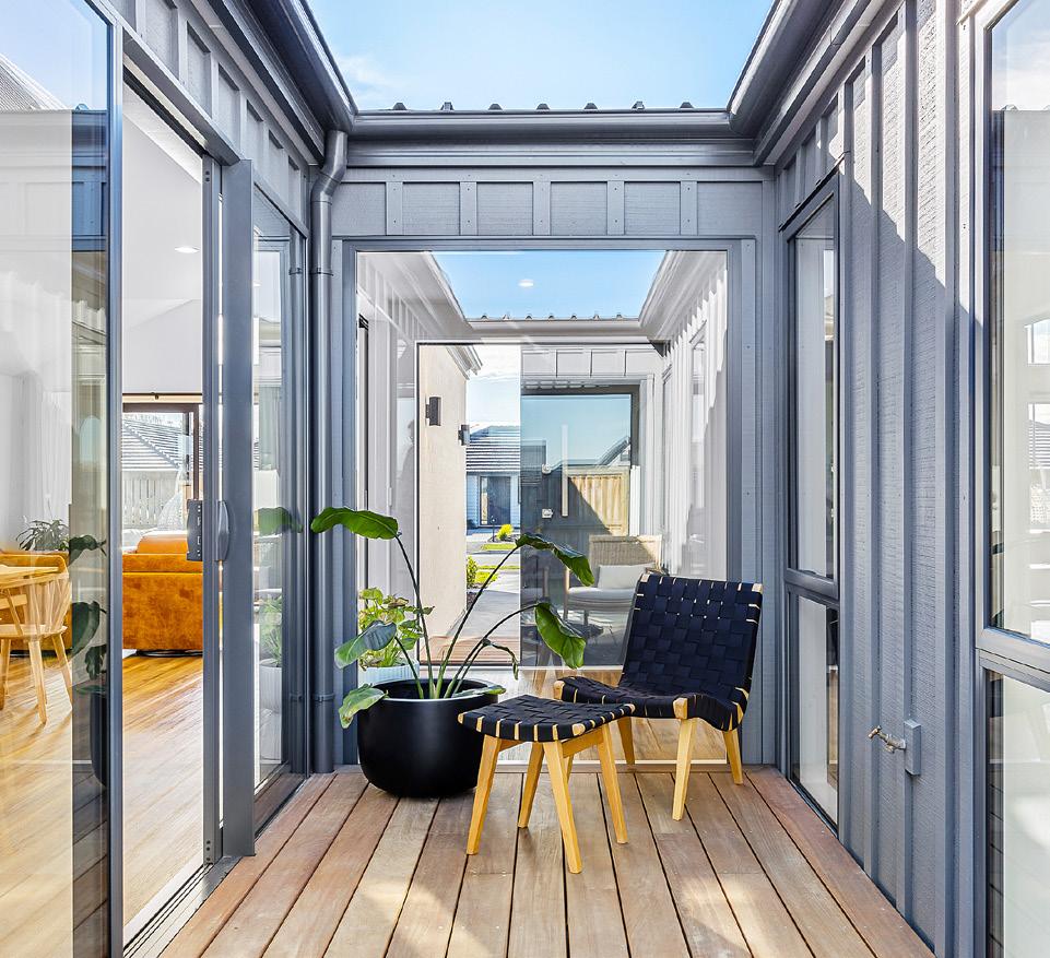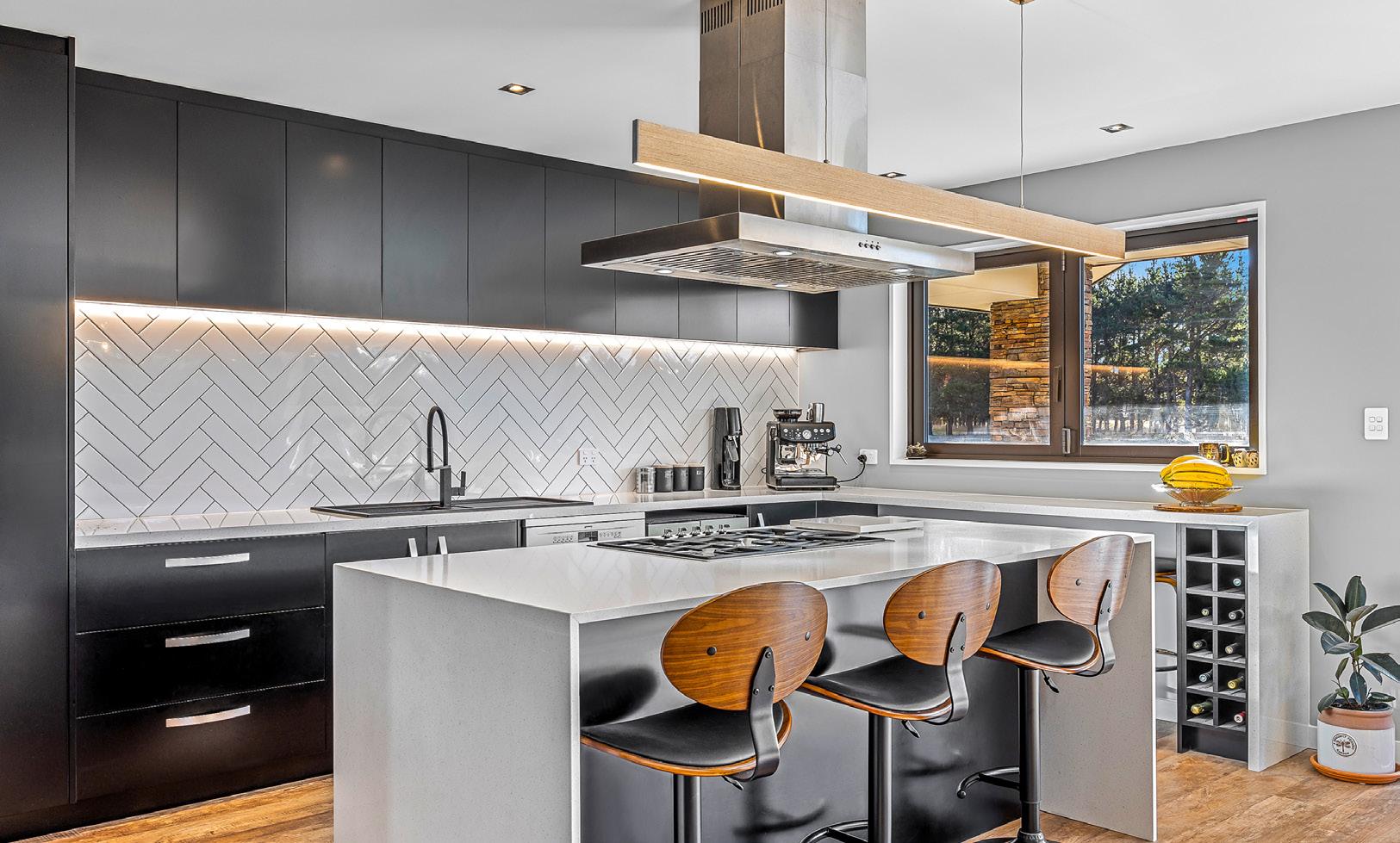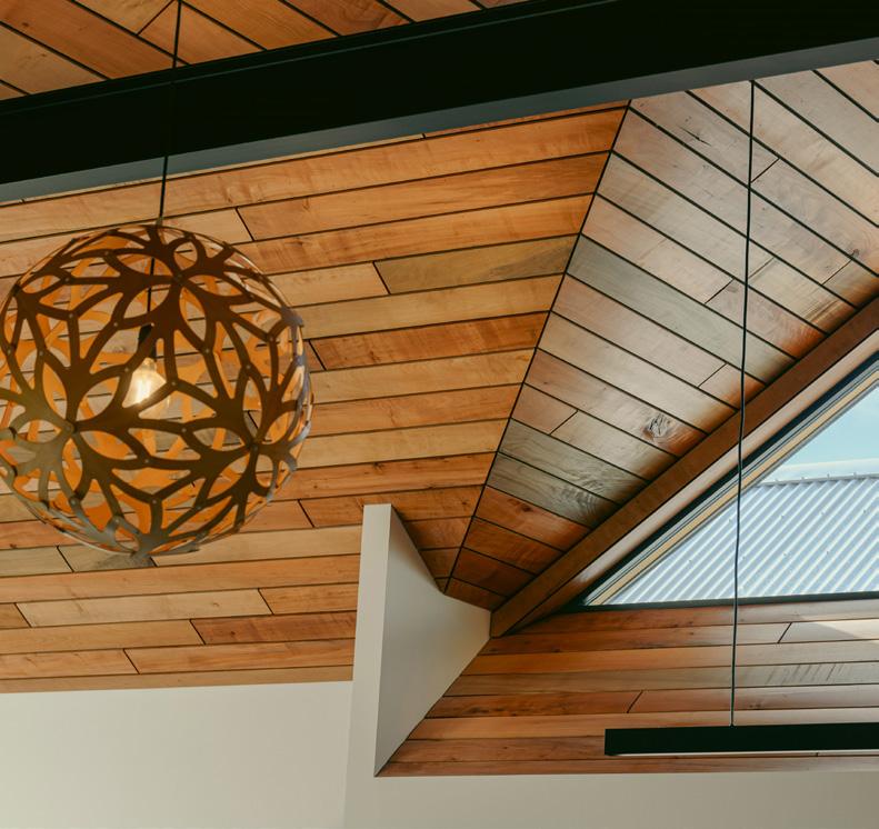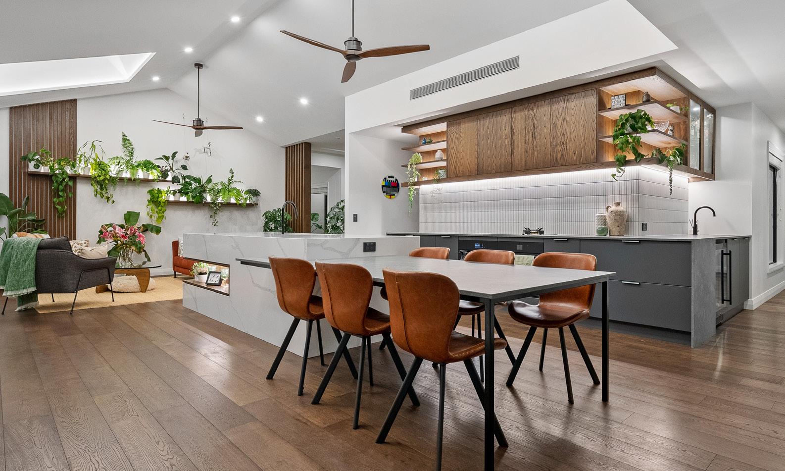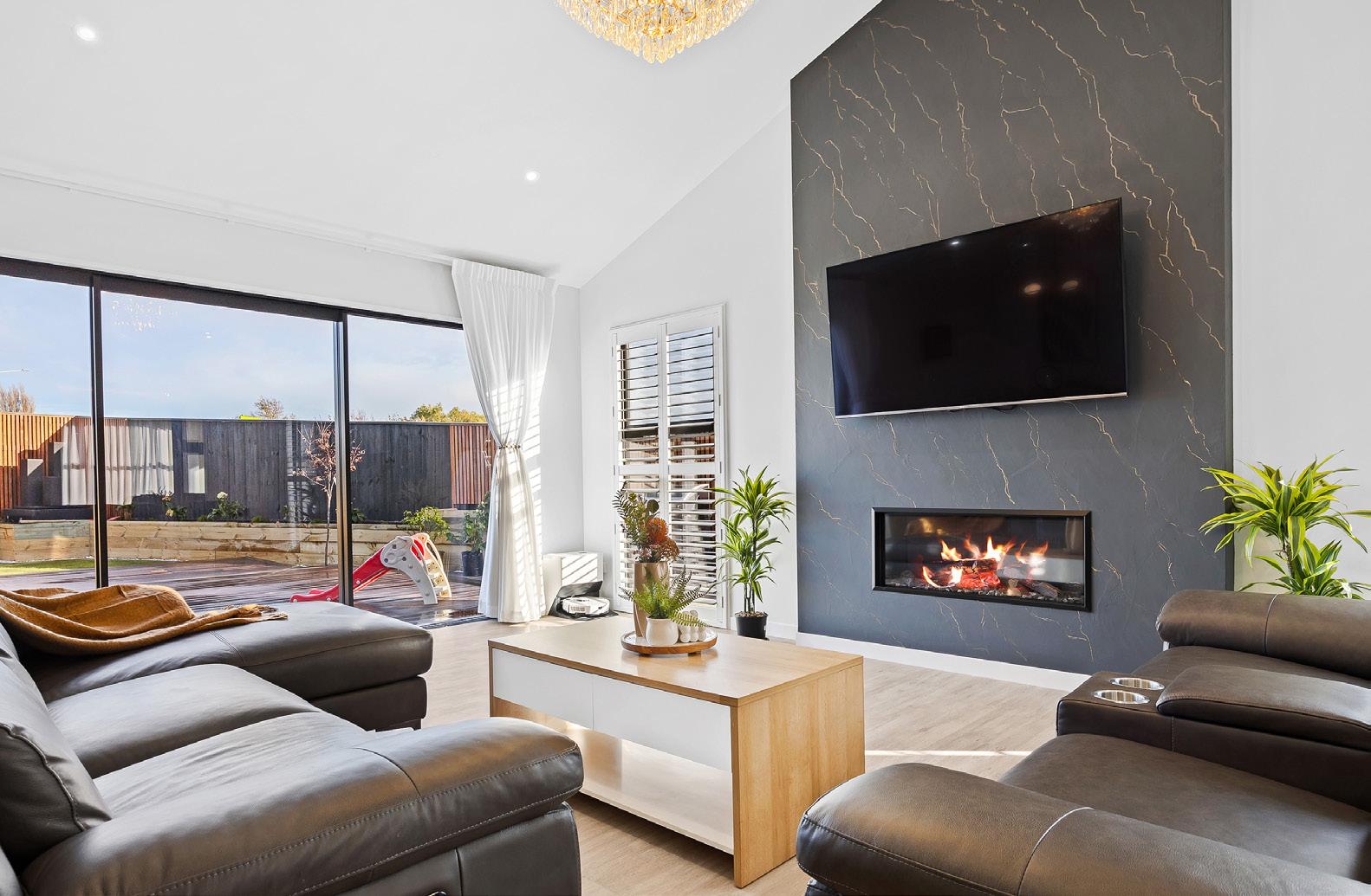 thanks to the back wall, which is made entirely of glass stacker doors. These open out to an expansive kwila deck, seamlessly merging the indoor and outdoor spaces, ideal for entertaining year-round. The kitchen boasts ample bench space with a butler’s pantry to hide away all the clutter. The result is a home that’s the epitome of modern, functional family living – without the large footprint.