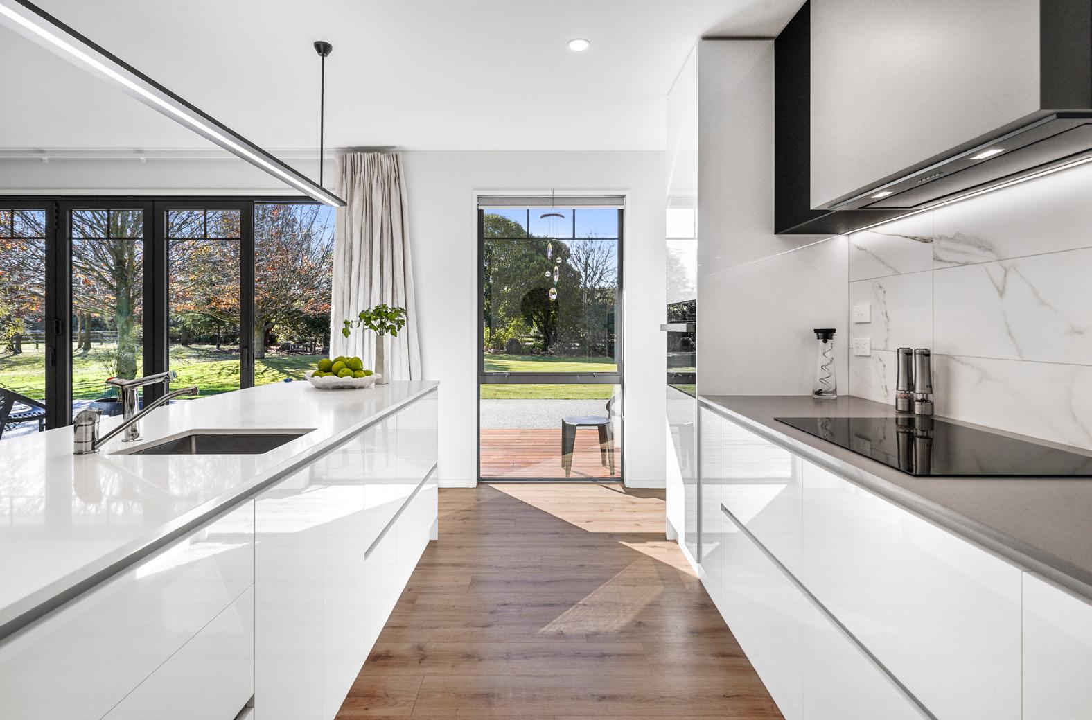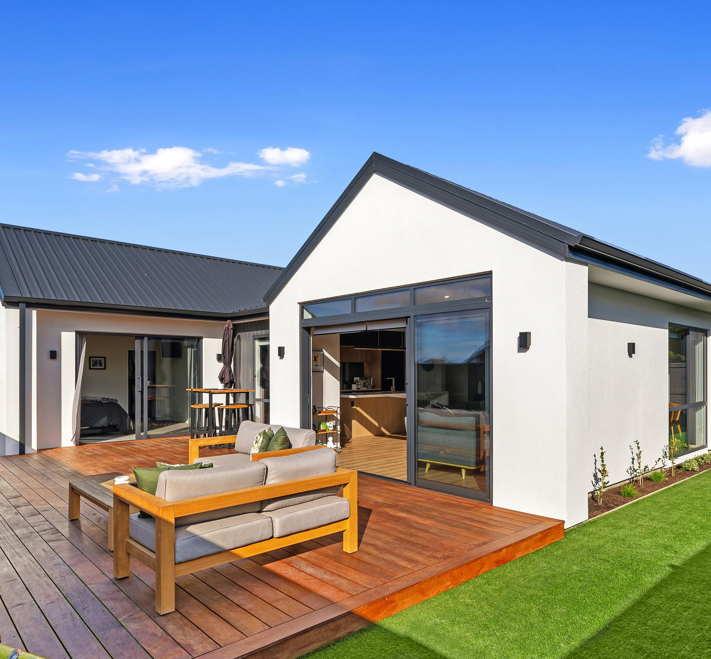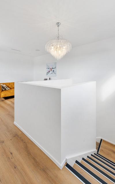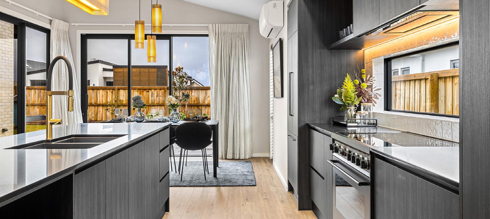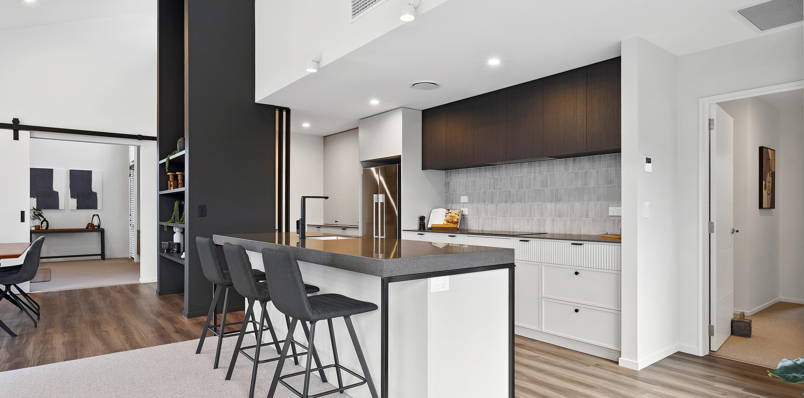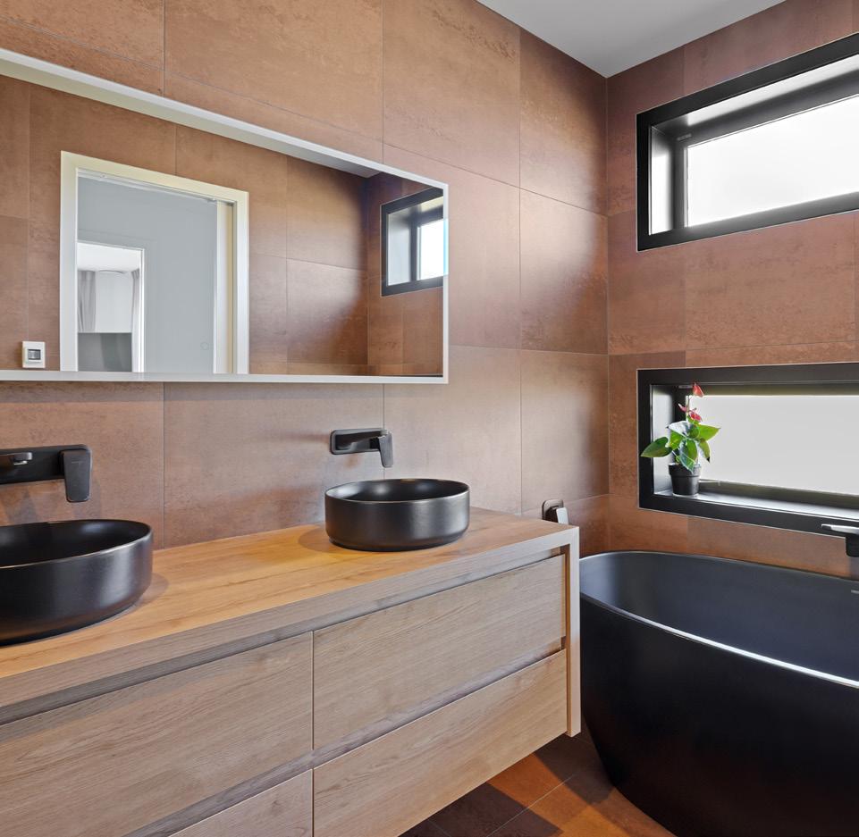 thanks to the back wall, which is made entirely of glass stacker doors. These open out to an expansive kwila deck, seamlessly merging the indoor and outdoor spaces, ideal for entertaining year-round. The kitchen boasts ample bench space with a butler’s pantry to hide away all the clutter. The result is a home that’s the epitome of modern, functional family living – without the large footprint.