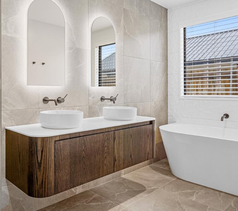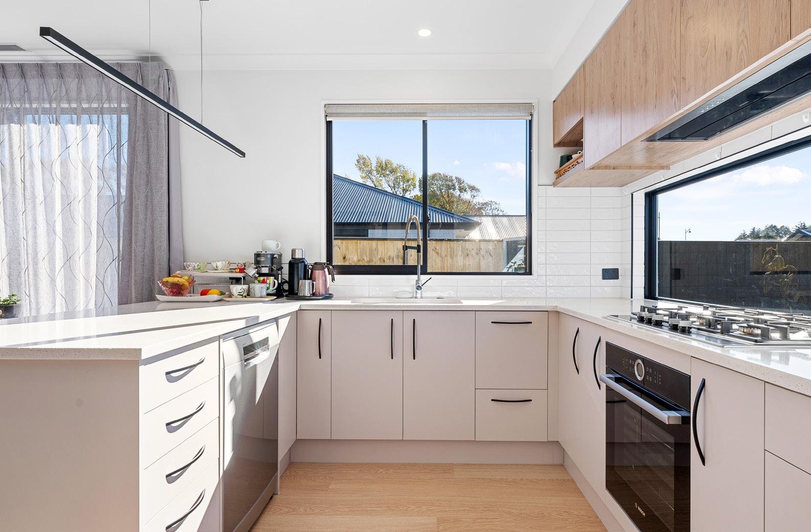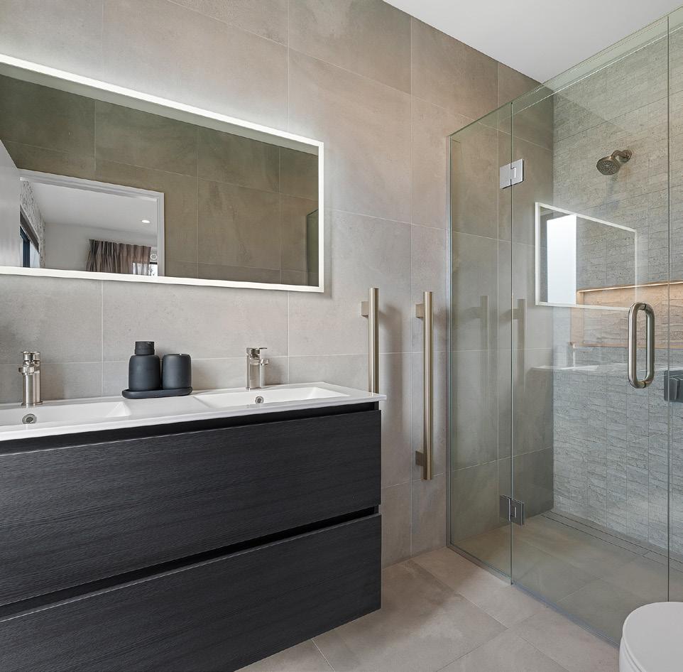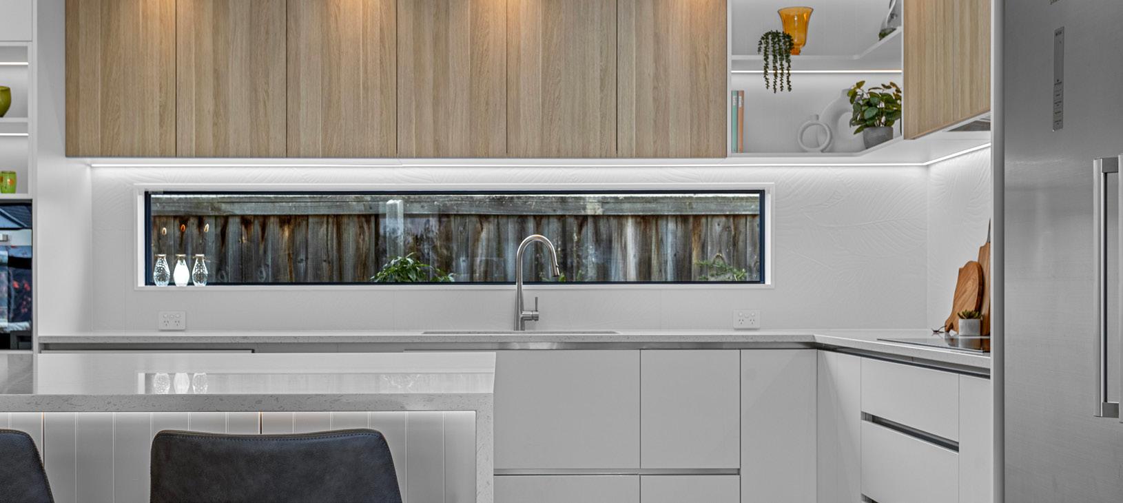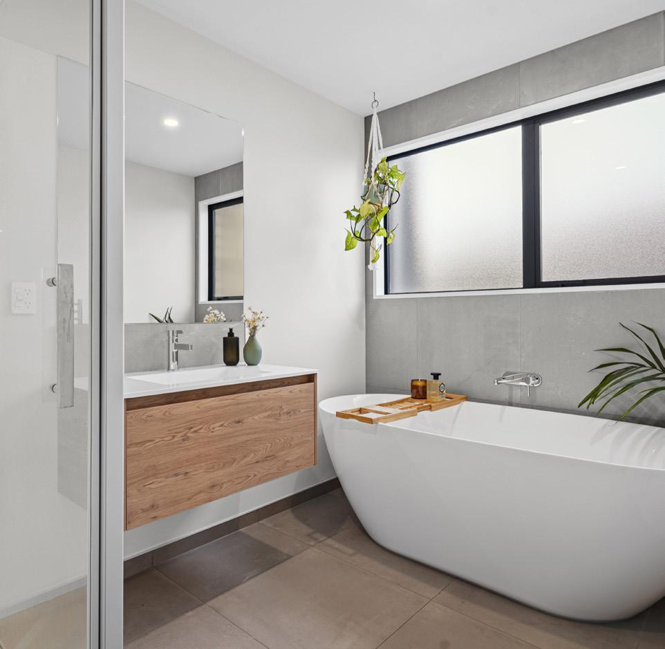 thanks to the back wall, which is made entirely of glass stacker doors. These open out to an expansive kwila deck, seamlessly merging the indoor and outdoor spaces, ideal for entertaining year-round. The kitchen boasts ample bench space with a butler’s pantry to hide away all the clutter. The result is a home that’s the epitome of modern, functional family living – without the large footprint.