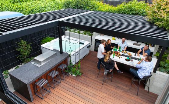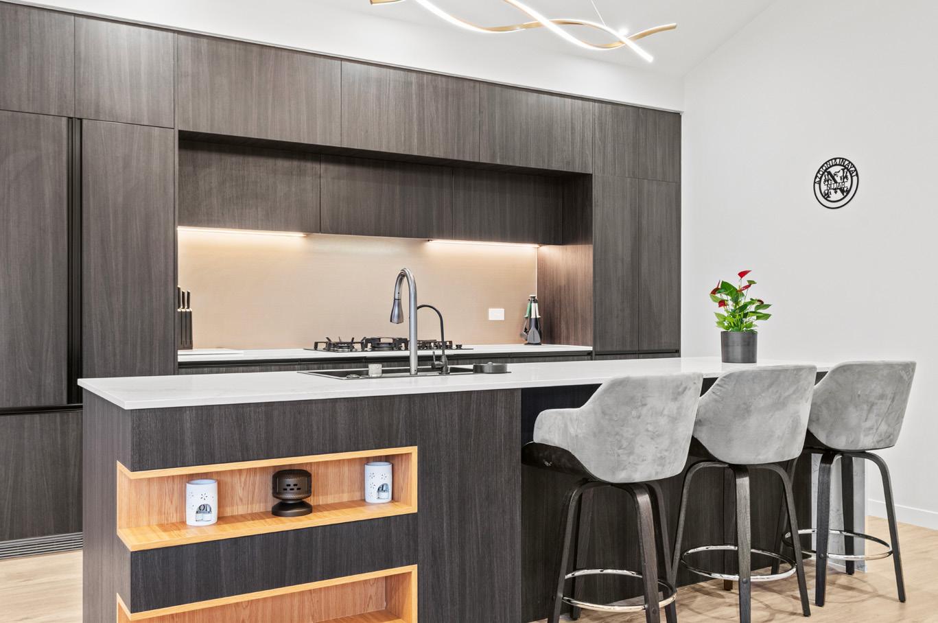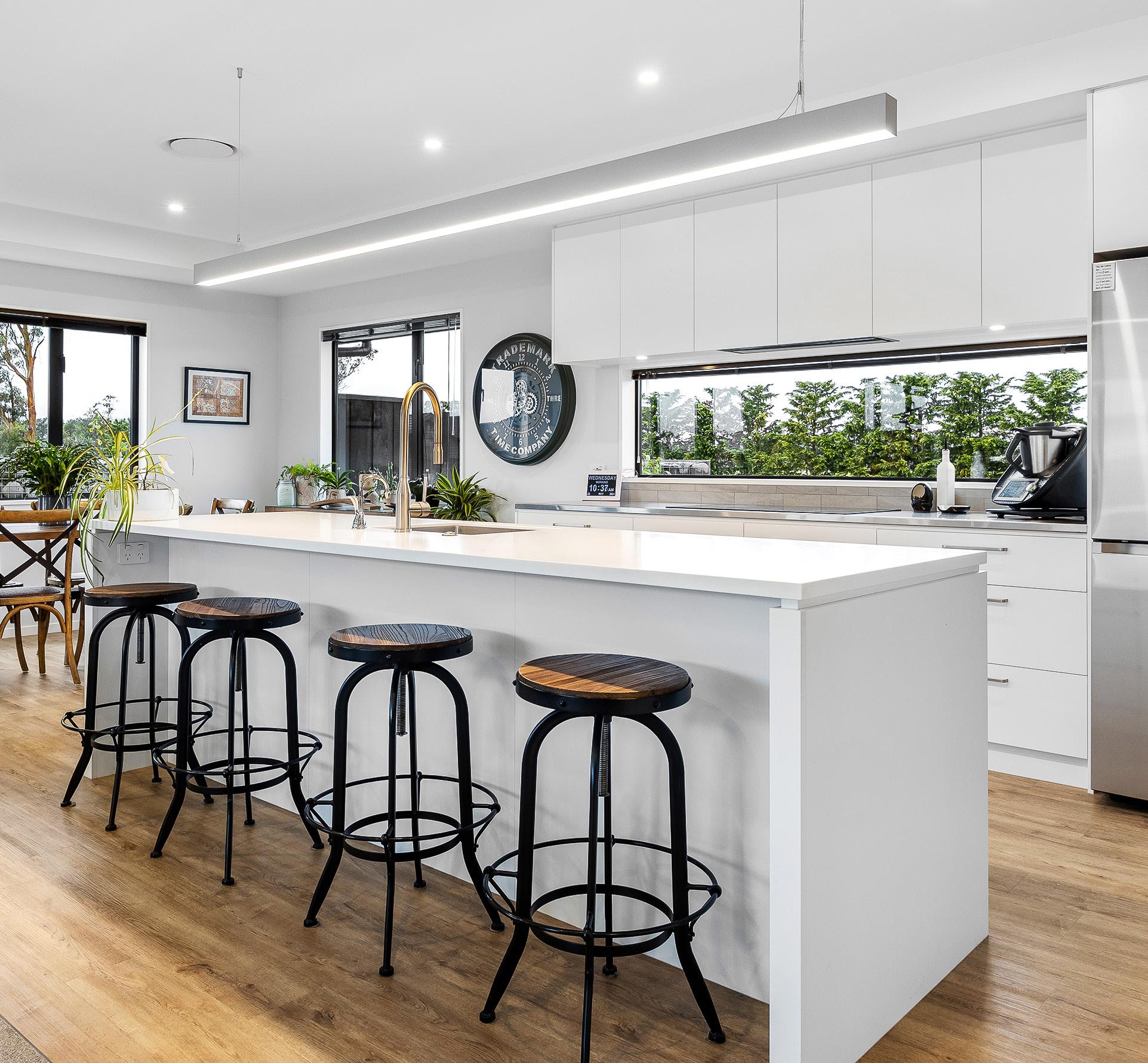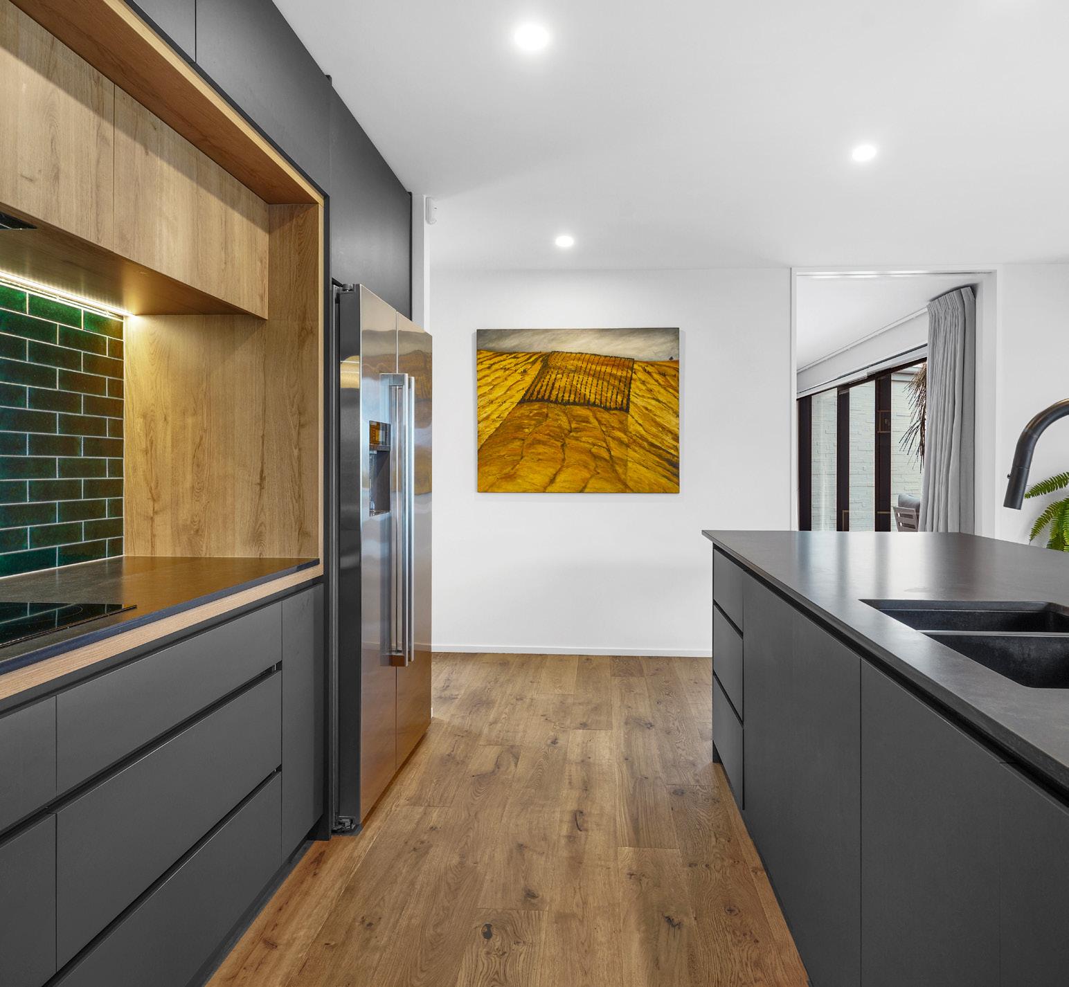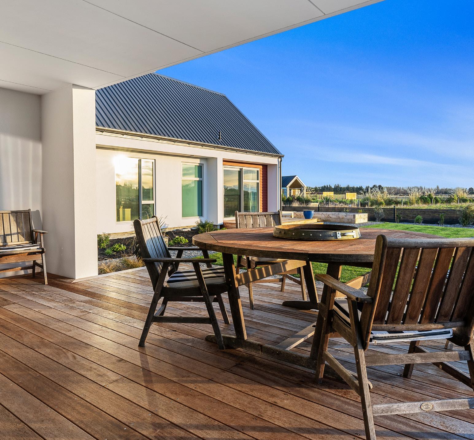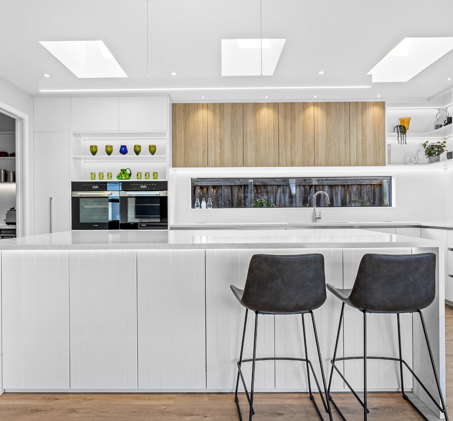 thanks to the back wall, which is made entirely of glass stacker doors. These open out to an expansive kwila deck, seamlessly merging the indoor and outdoor spaces, ideal for entertaining year-round. The kitchen boasts ample bench space with a butler’s pantry to hide away all the clutter. The result is a home that’s the epitome of modern, functional family living – without the large footprint.