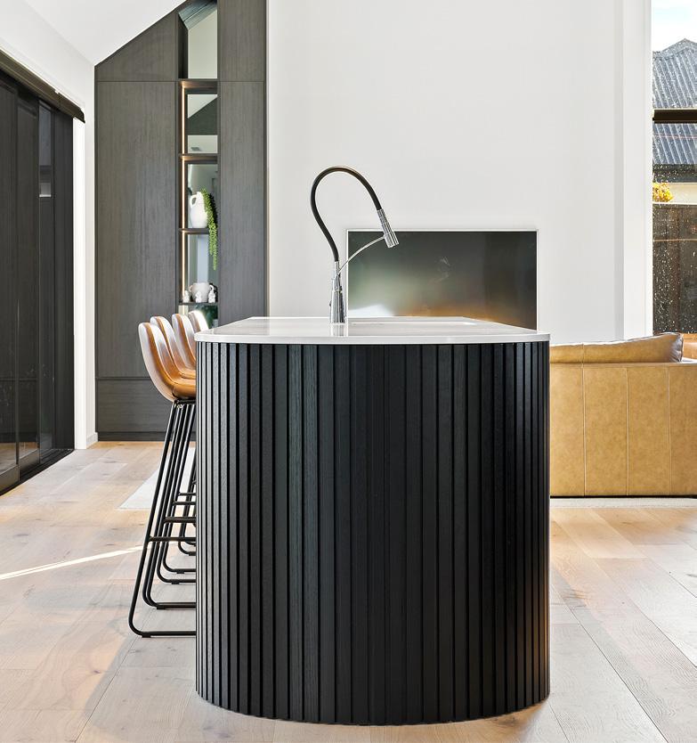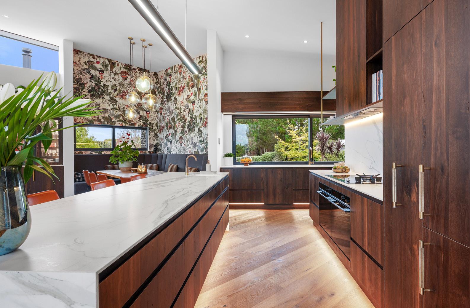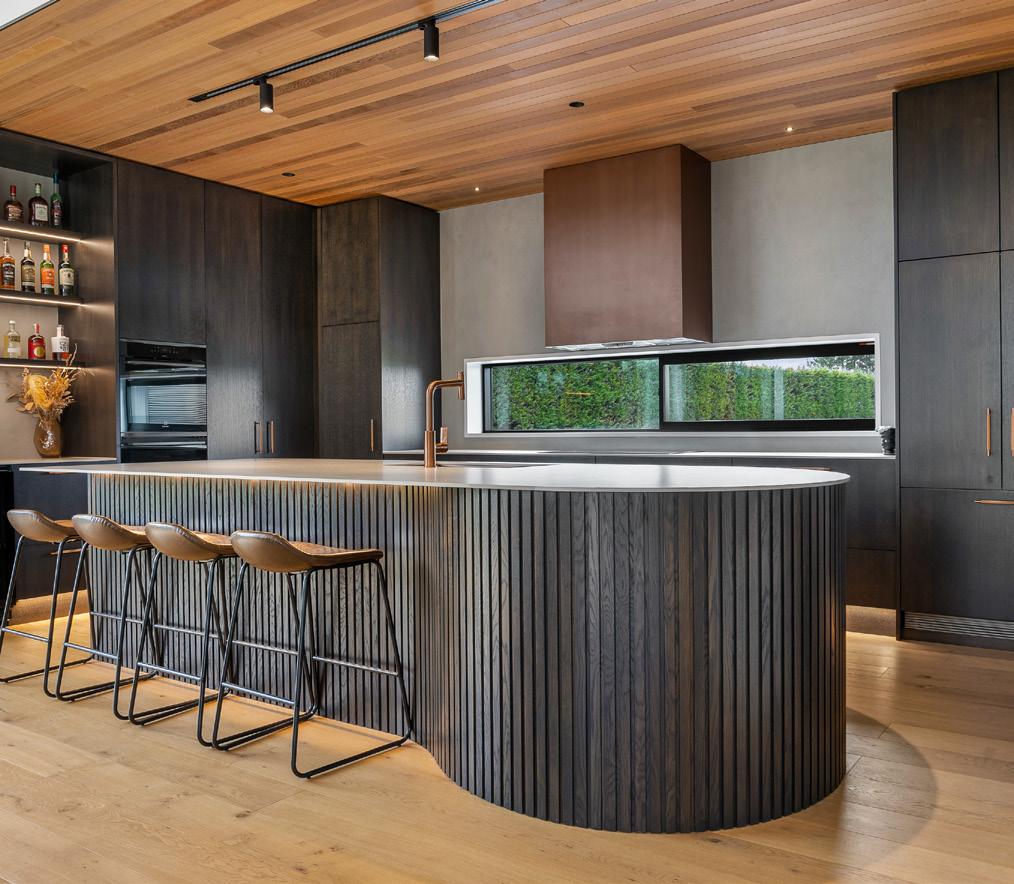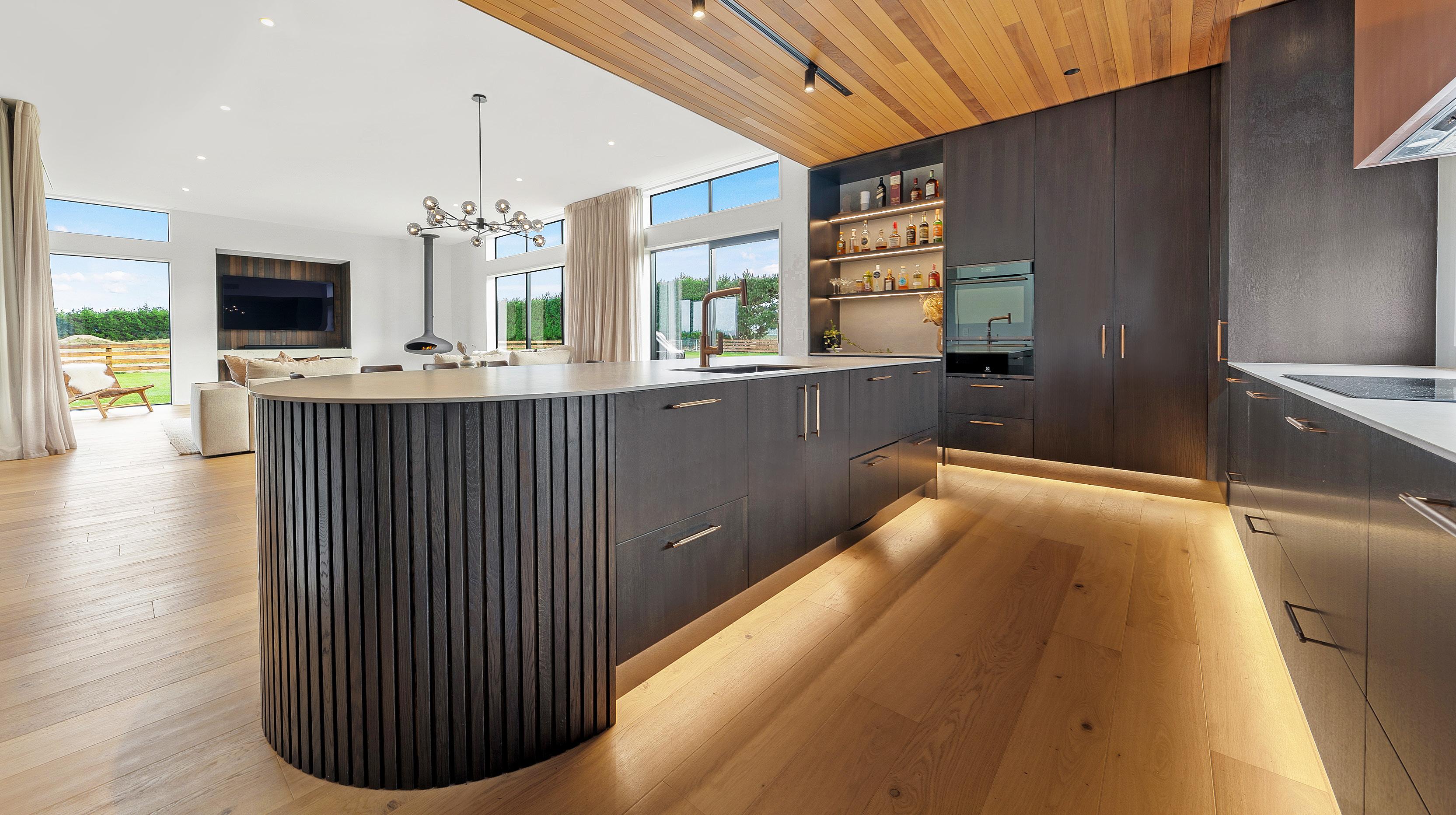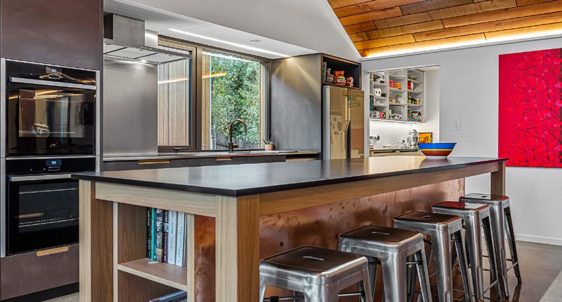 Our love affair with dark cabinetry in kitchens continues in 2024 but with elements that soften the impact. Here the clean, sharp lines of floor-to-ceiling cupboards are teamed with other earthy tones and warm metallic accents. The curve of the central island provides a pleasing organic softness to the overall design, as does the warmth created by the honey-hued cedar ceiling and wooden floor. Open shelves are equally welcoming and a splash of greenery through the low, slot window keeps it real. For more on this home, turn to page 124.