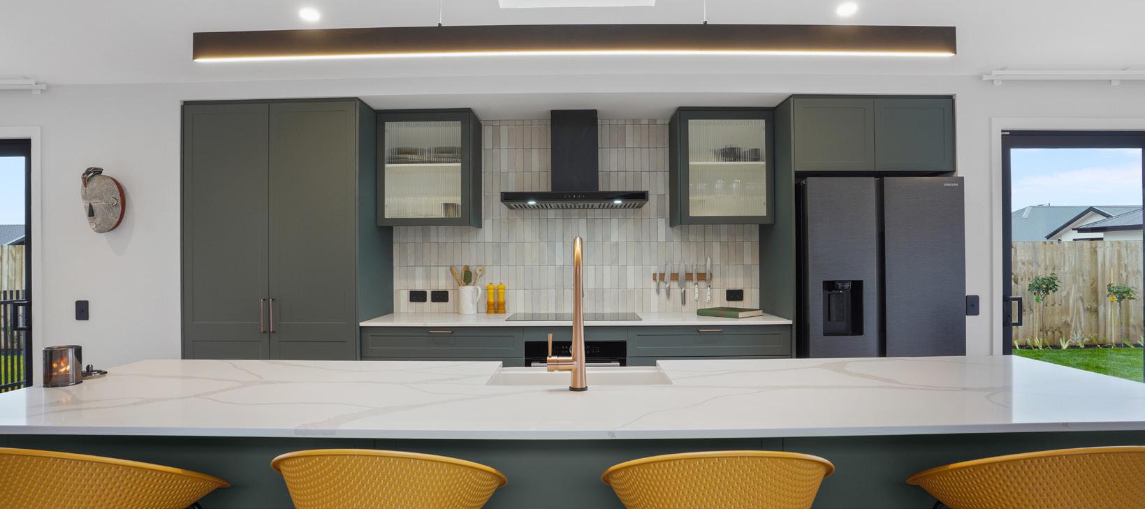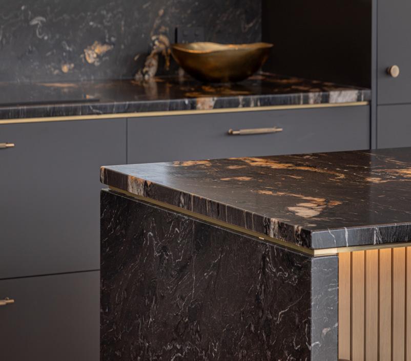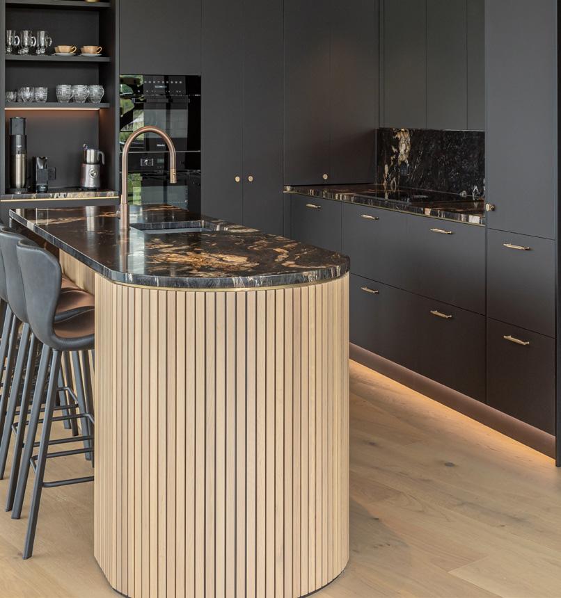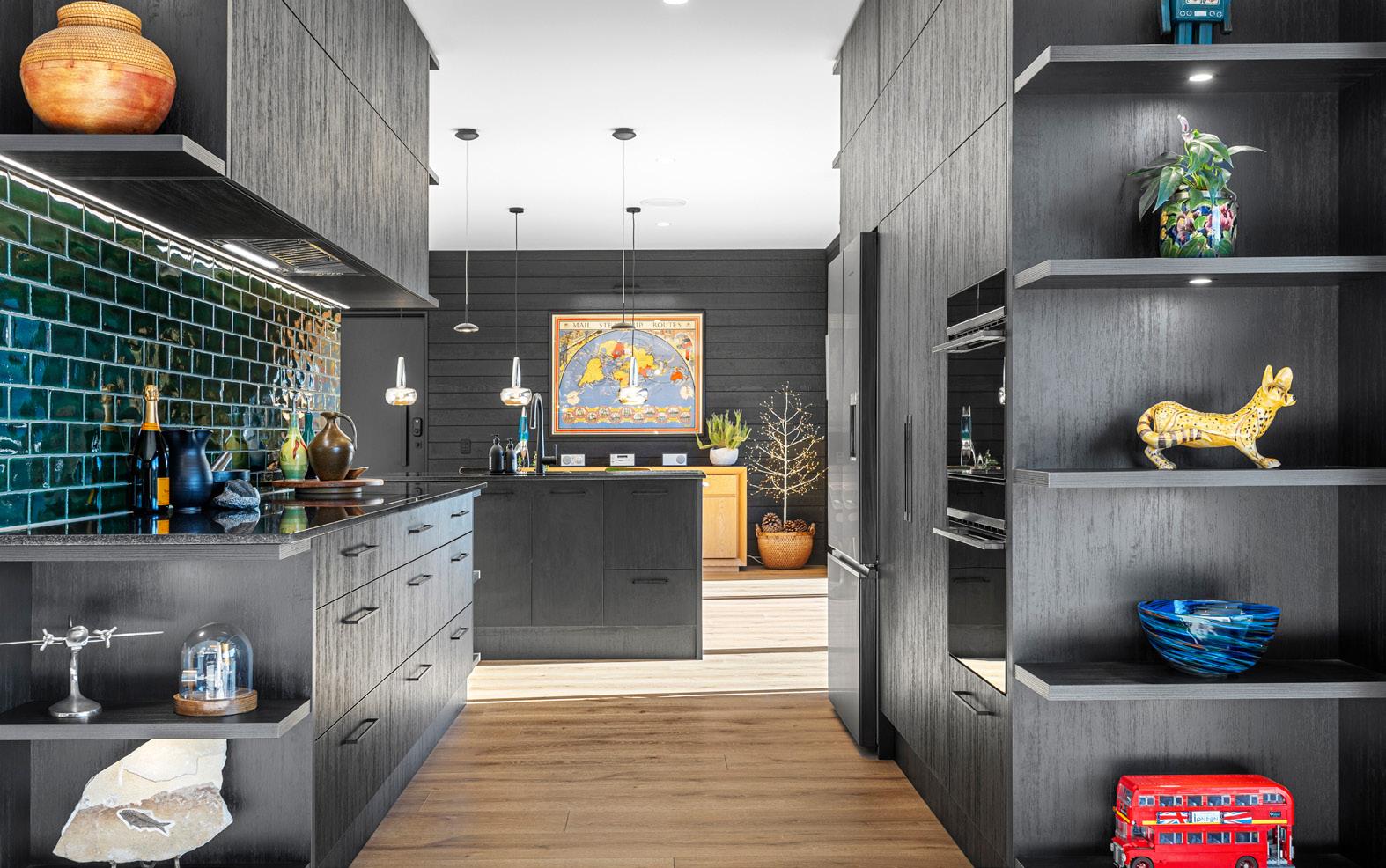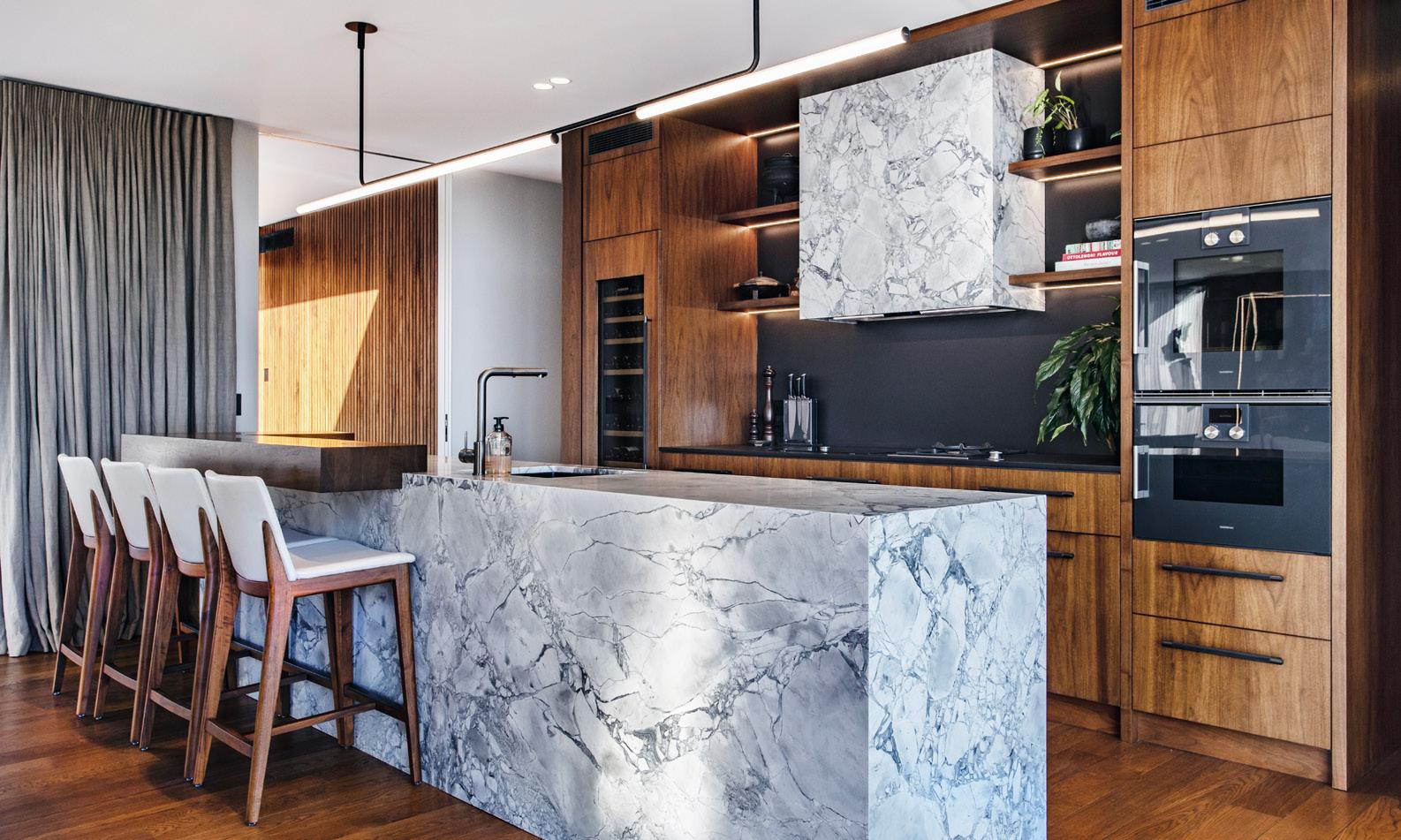 Our love affair with dark cabinetry in kitchens continues in 2024 but with elements that soften the impact. Here the clean, sharp lines of floor-to-ceiling cupboards are teamed with other earthy tones and warm metallic accents. The curve of the central island provides a pleasing organic softness to the overall design, as does the warmth created by the honey-hued cedar ceiling and wooden floor. Open shelves are equally welcoming and a splash of greenery through the low, slot window keeps it real. For more on this home, turn to page 124.