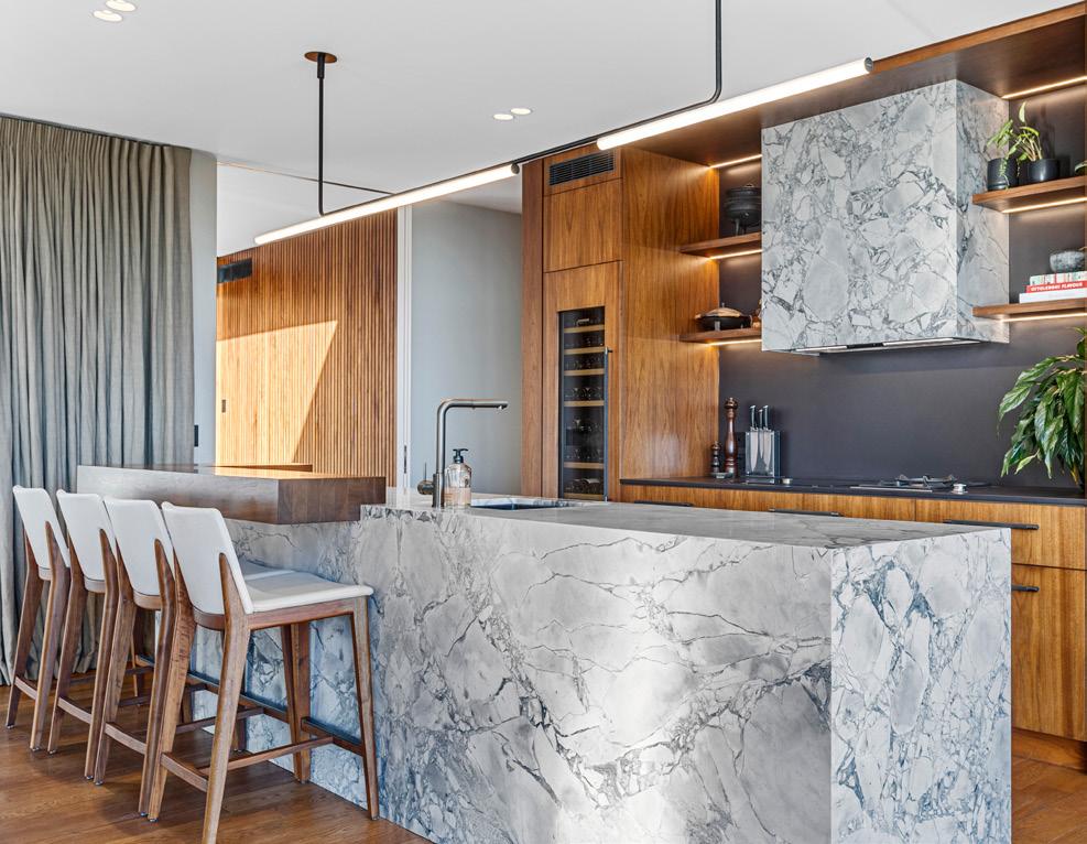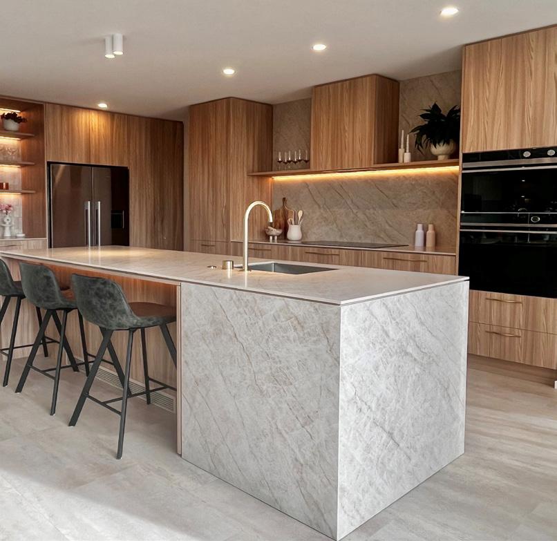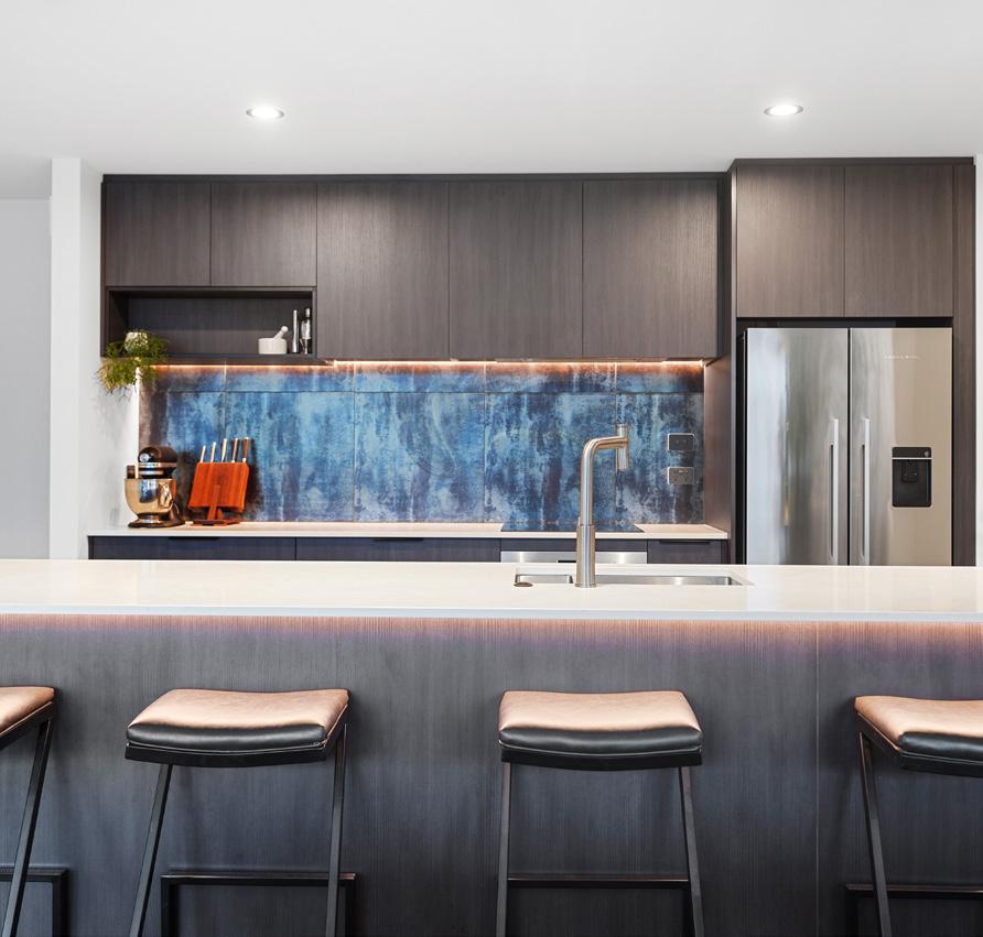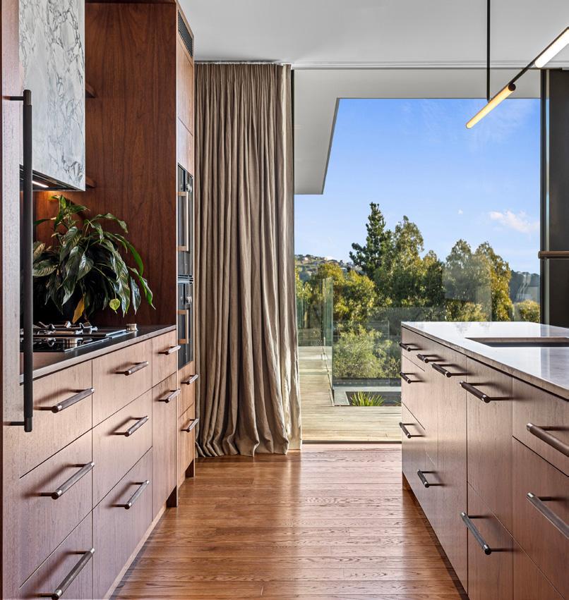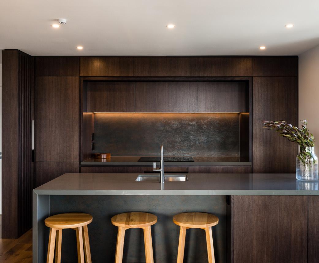 Our love affair with dark cabinetry in kitchens continues in 2024 but with elements that soften the impact. Here the clean, sharp lines of floor-to-ceiling cupboards are teamed with other earthy tones and warm metallic accents. The curve of the central island provides a pleasing organic softness to the overall design, as does the warmth created by the honey-hued cedar ceiling and wooden floor. Open shelves are equally welcoming and a splash of greenery through the low, slot window keeps it real. For more on this home, turn to page 124.