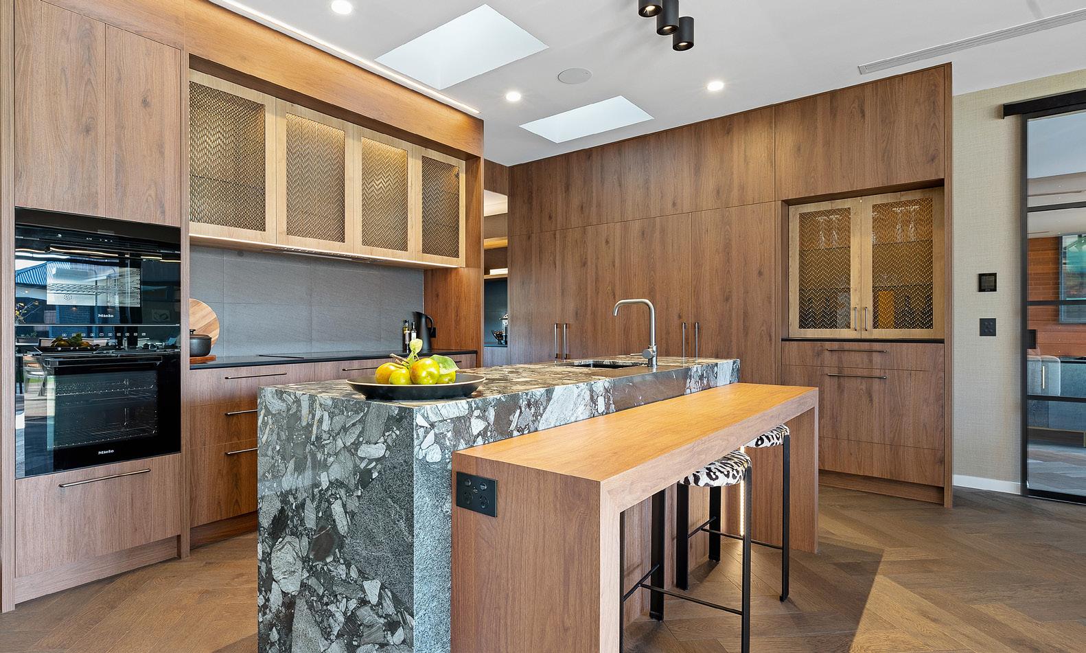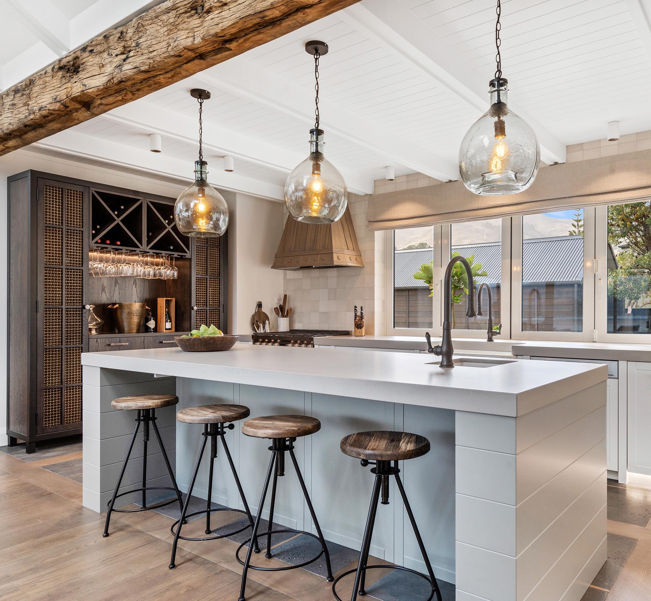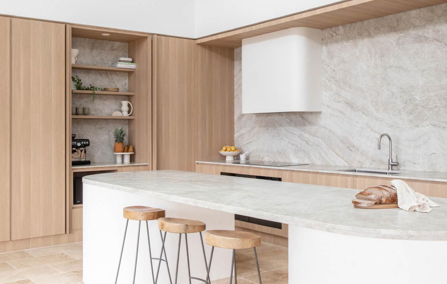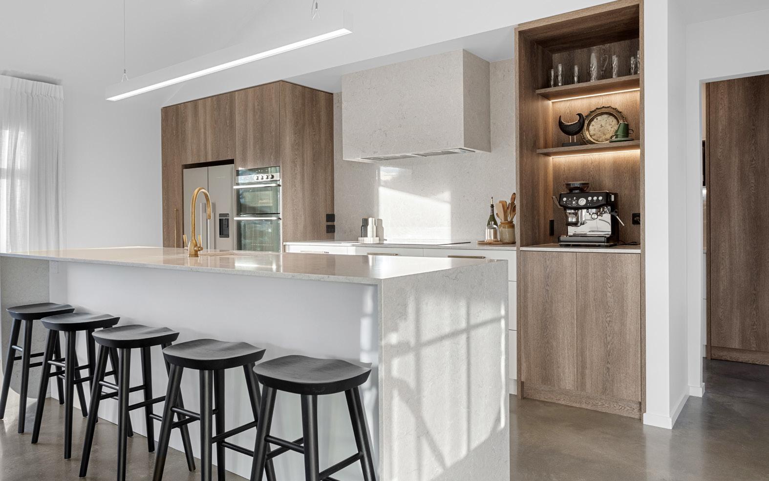 When it comes to how you start your day, take inspiration from this stylish kitchen from ABI Interiors. Not only do we love the calm ambience created by combining textured white surfaces with the warmth of wood, we also love the clean lines of the floor-to-ceiling cupboards. The highlight? Doors that open to reveal an elegant coffee bar complete with coffee machine and spacious shelving. From abiinteriors.co.nz