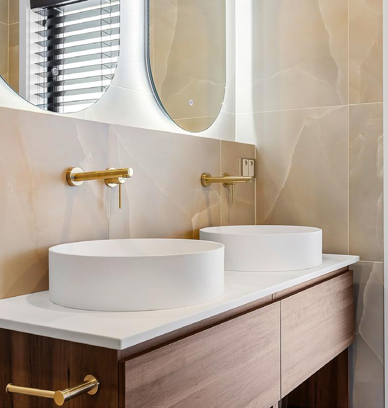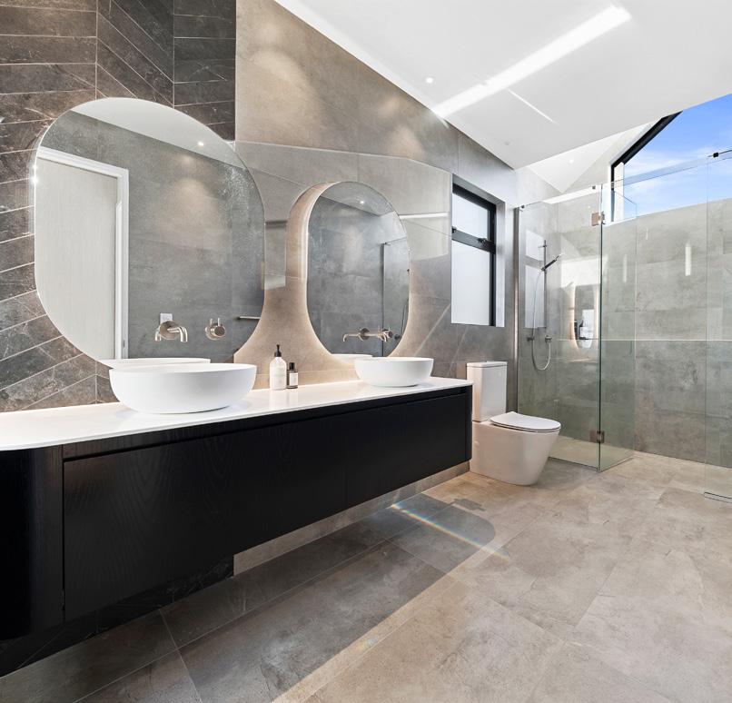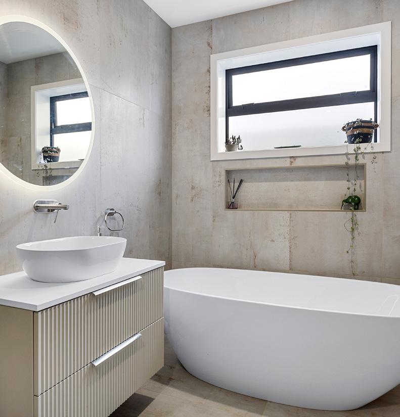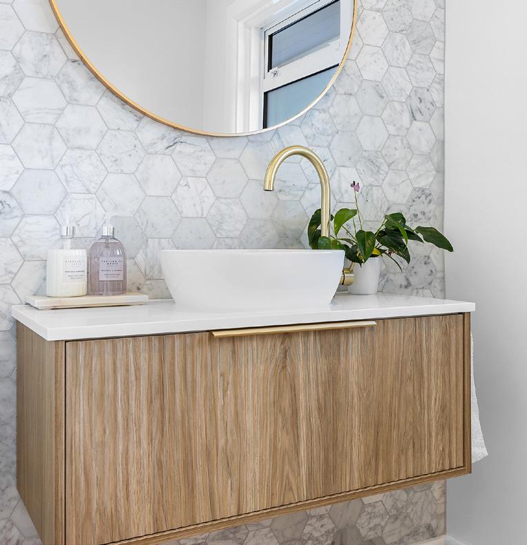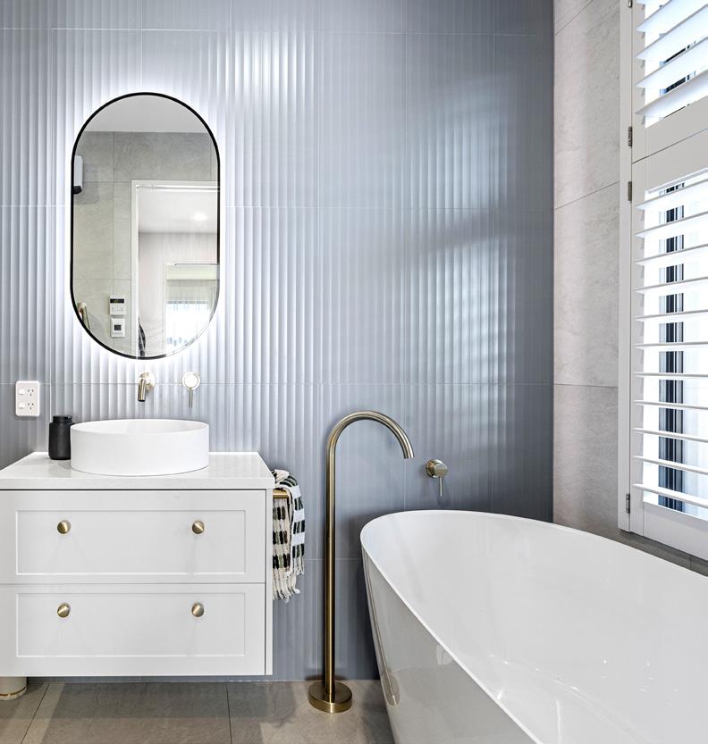 Think big when it comes to mirrors in the bathroom: they work to add light and a greater sense of space. They also offer an opportunity to add personality, so look for something different such as this bold, curving Arc mirror available in blackened, aged and brushed brass, $2190, from powersurge.co.nz