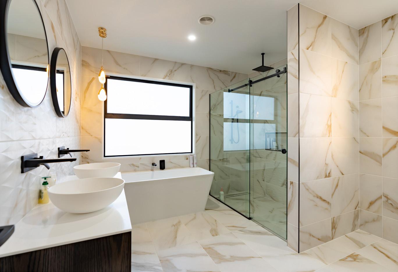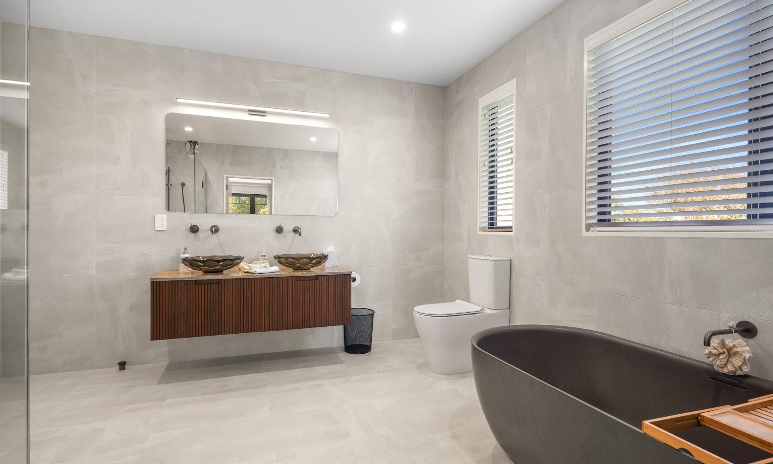 The upstairs reveals a sanctuary of bedrooms, including the main suite which comes with a luxurious bathroom with floor-to-ceiling tiling and a deep standalone bath.