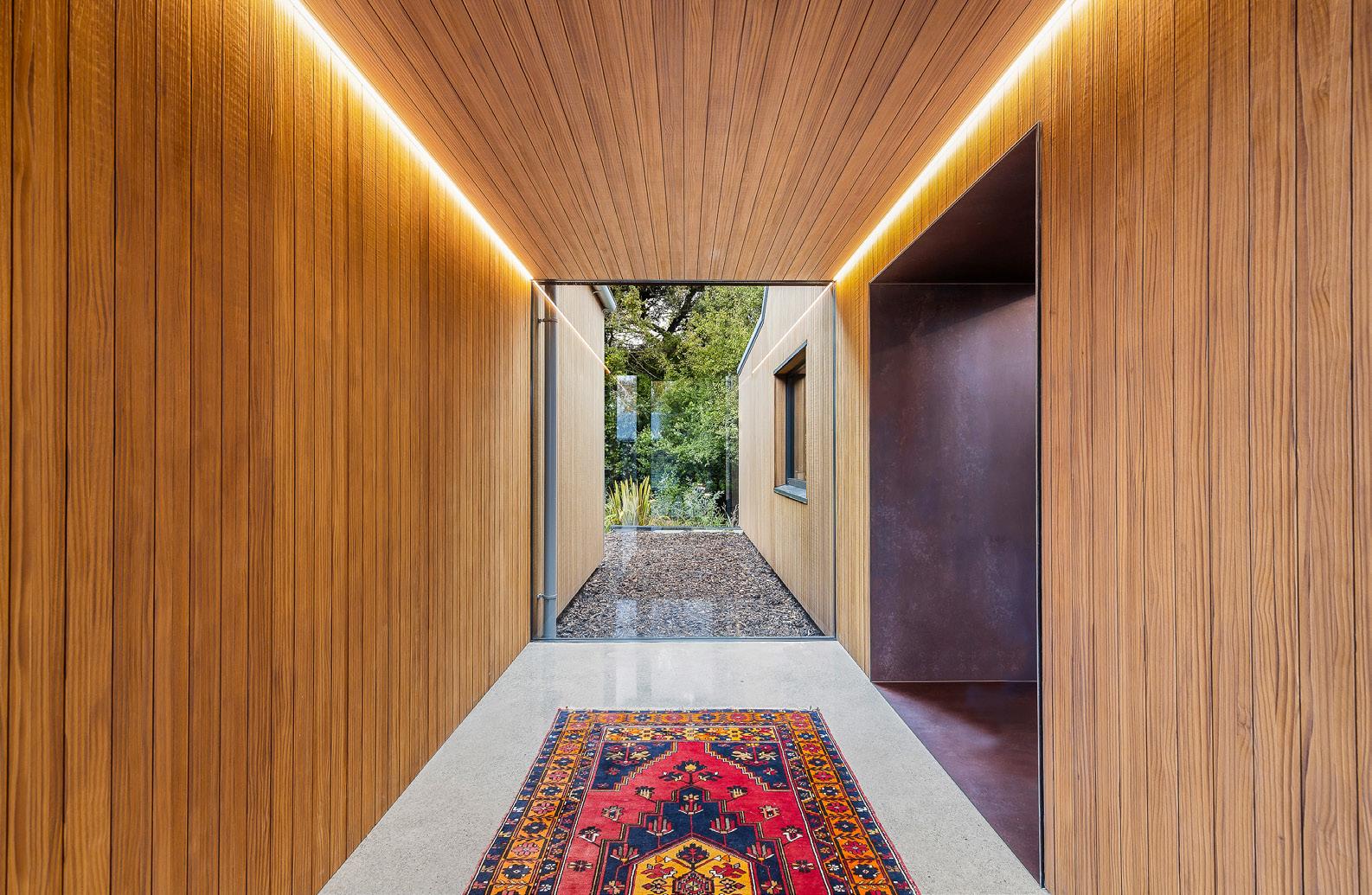 A centrally located, double-height entryway pivots the 283sqm floorplan by 28 degrees and acts to separate the ‘private’ and ‘public’ spaces within the house.