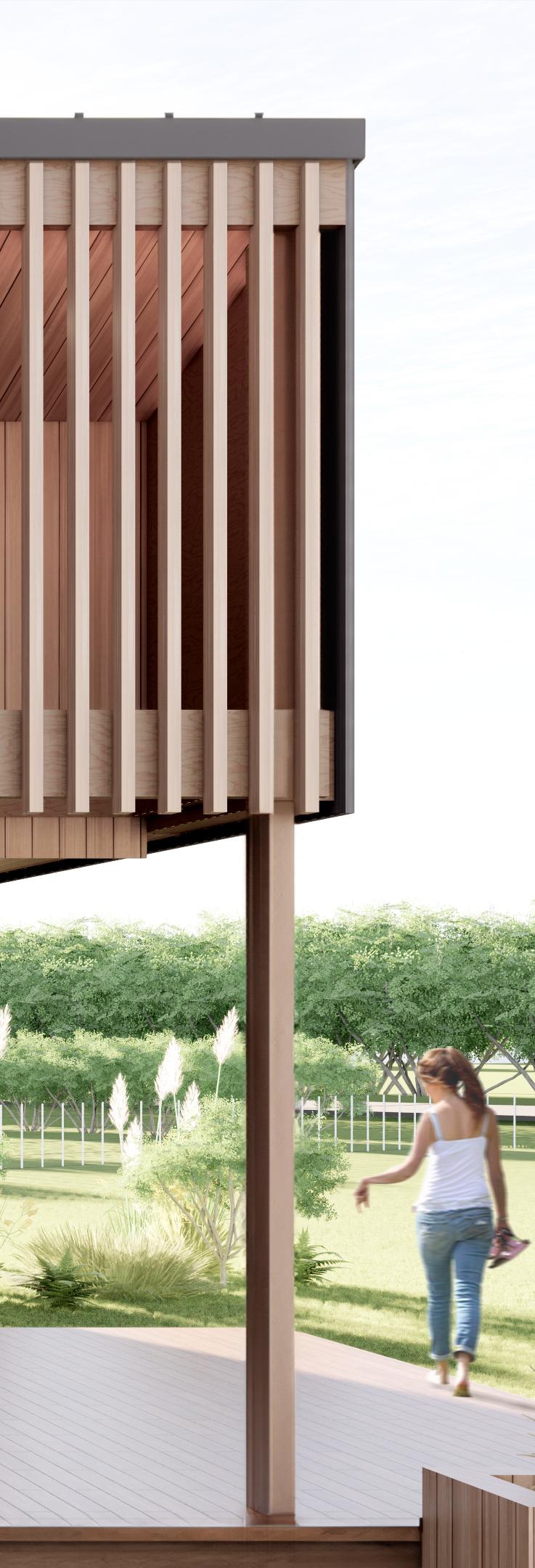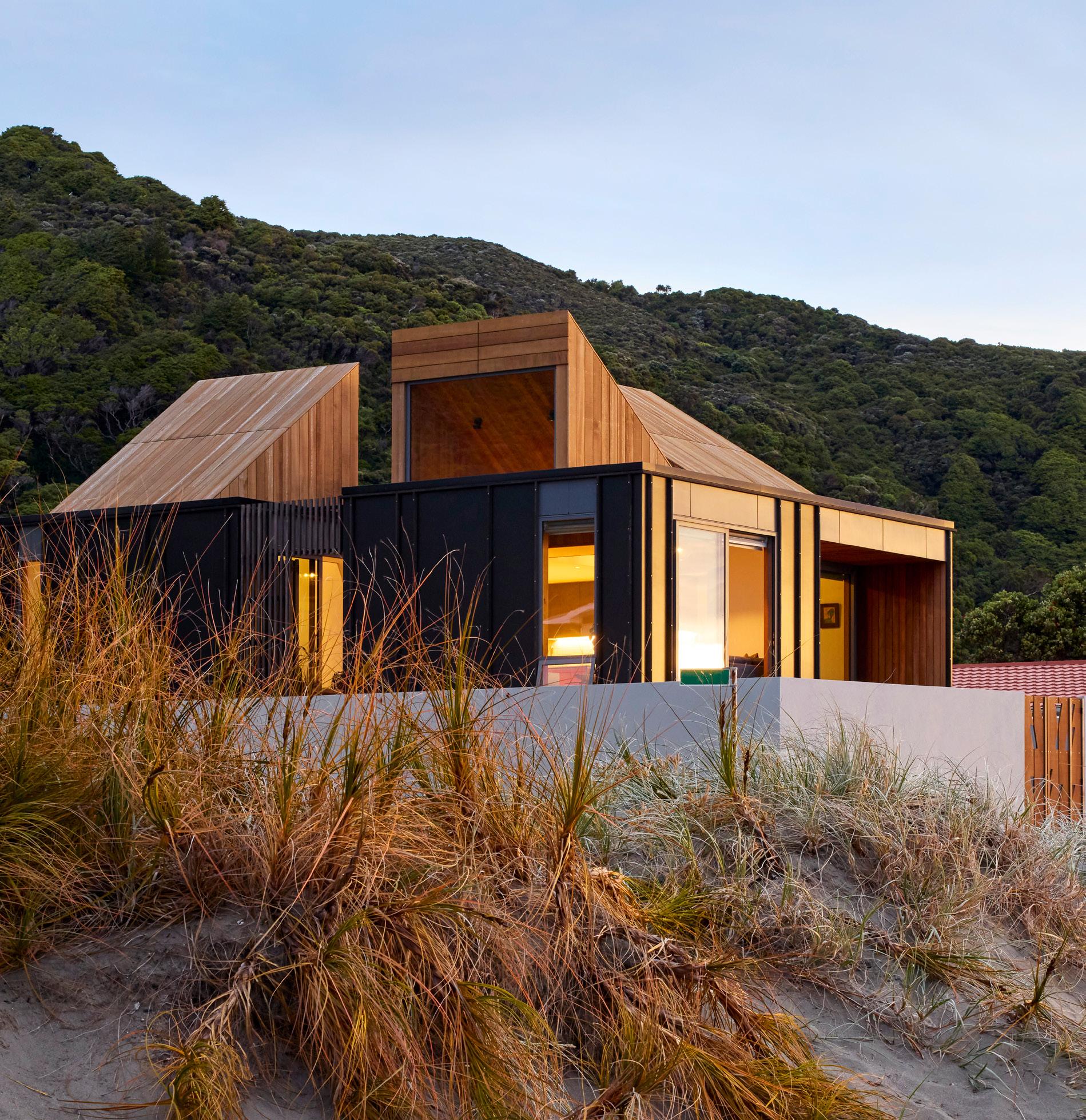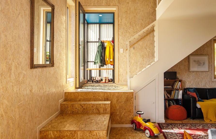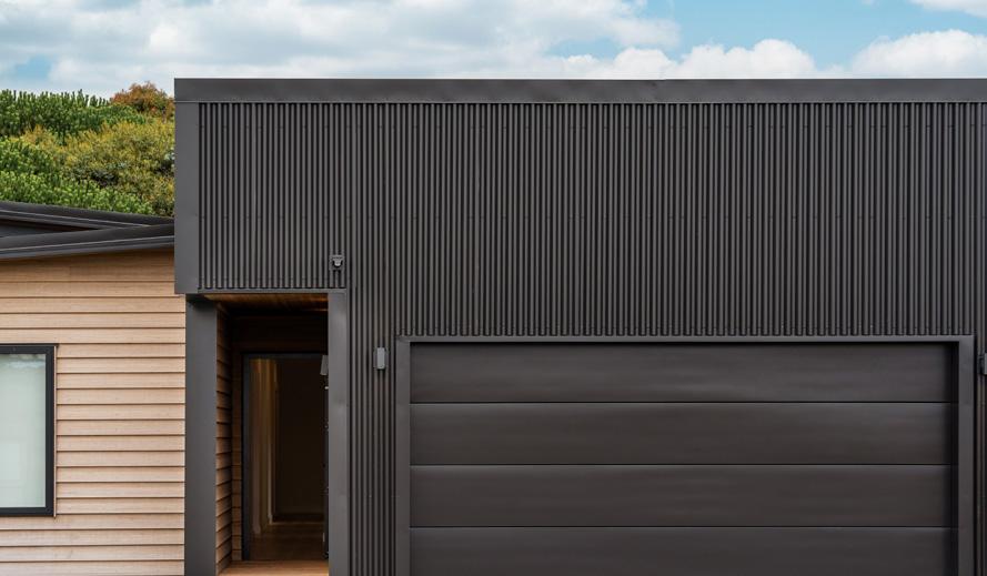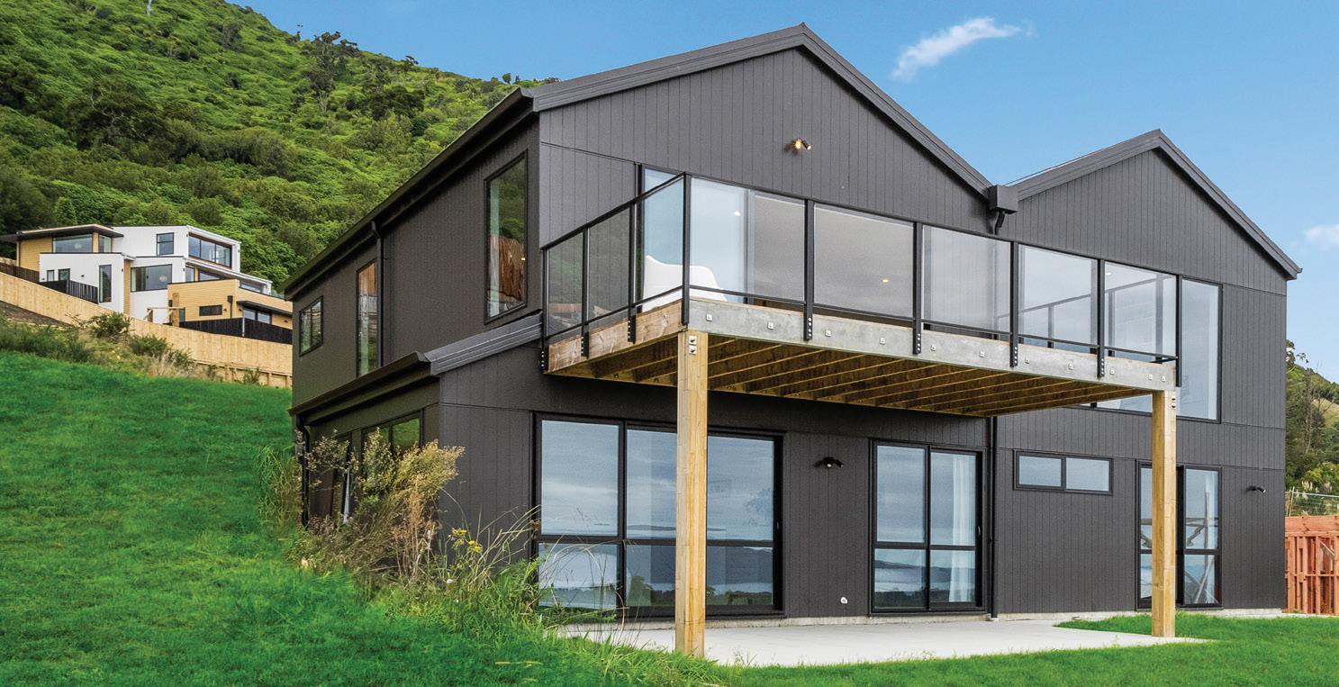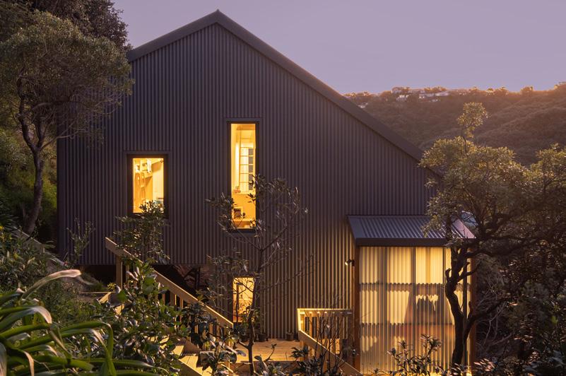 Creativity meets cost-effectiveness in this three-bedroom family home on Kāpiti Coast. Designed for a stylish young couple, the 164sqm house on an elevated wedgeshaped corner site dispels the notion that budget inevitably means boring. It gets off to a cracking start with dark macrocarpa bevel-back timber with random battens, and a boardwalk-style entry. Intriguing angles