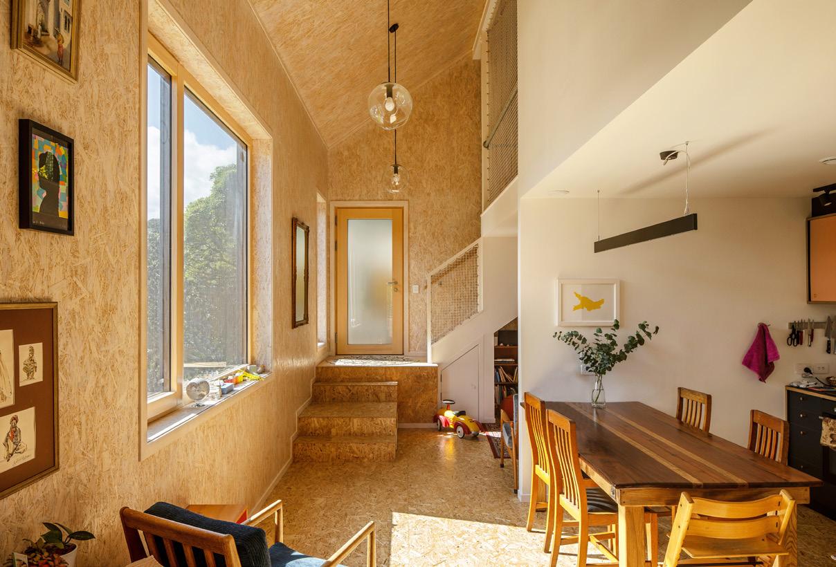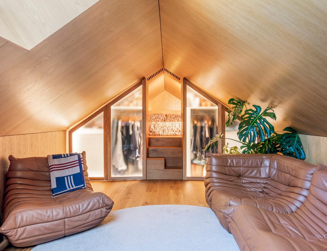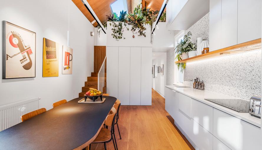 Oak imbues the zone with warmth; the grain adds interest. A skylight in the gable roof throws a welldeserved spotlight on just what has been achieved here. Downstairs, terrazzo tiles in the white-and-wood kitchen and in the new toilet lend sophistication.