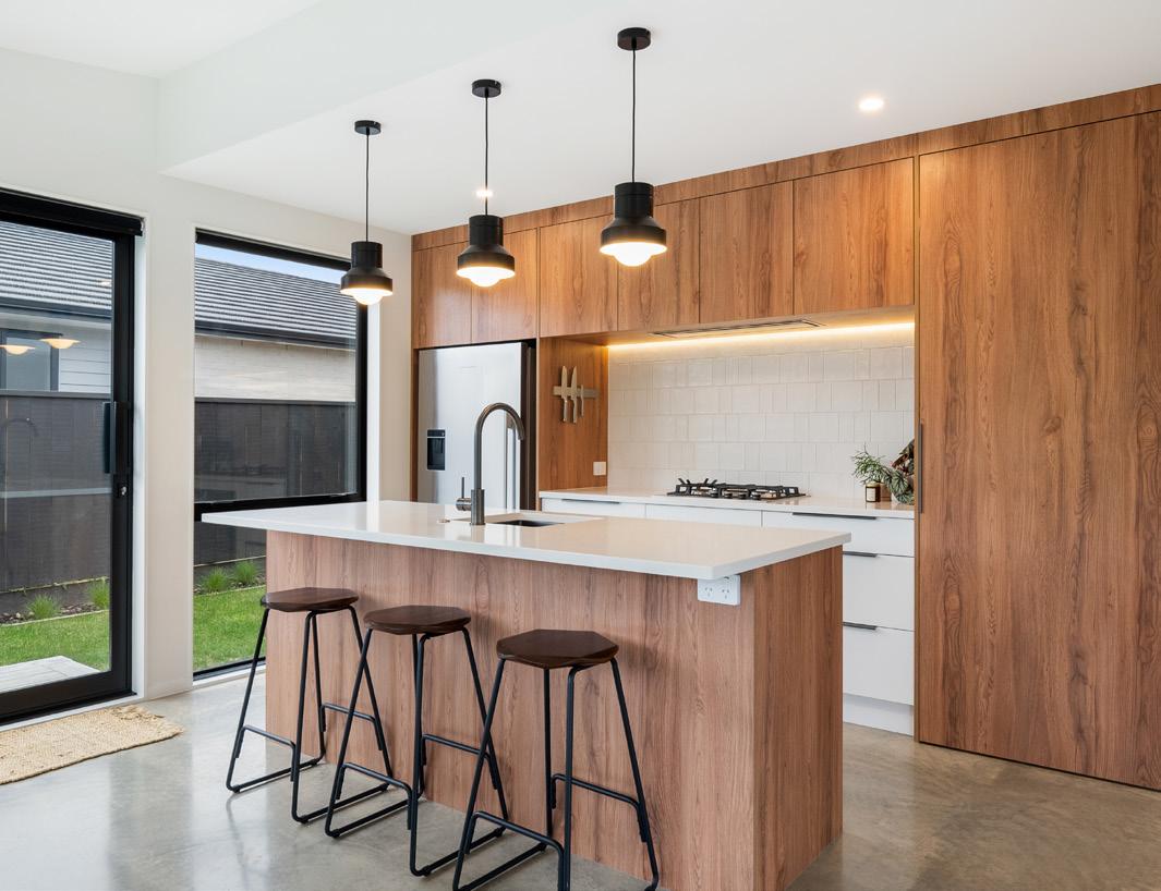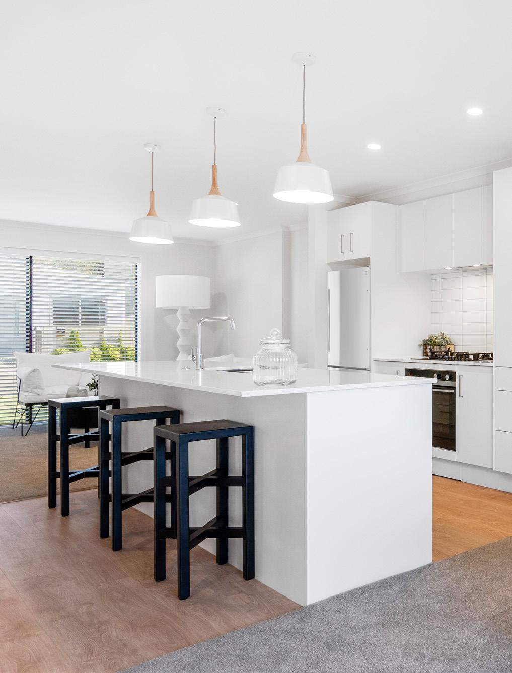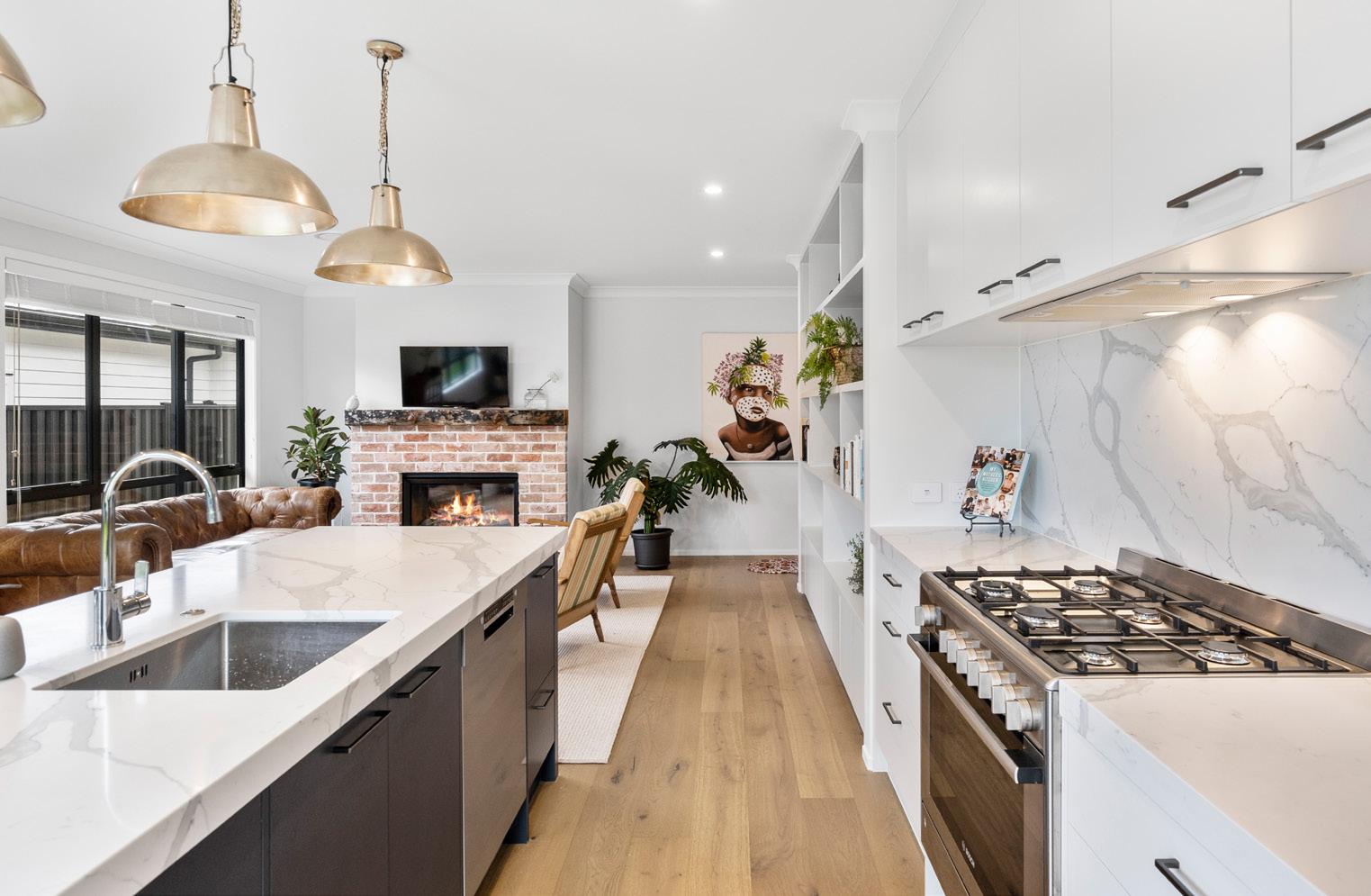 tiled splashback and timber flooring, and the dining and living spaces straddling it. Elegant pendulum lights hover over the island, throwing a spotlight on the craftsmanship. The powder room is handy for residents and visitors.