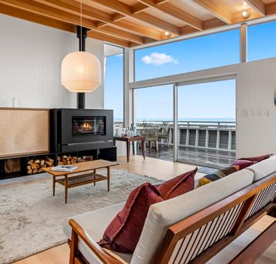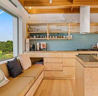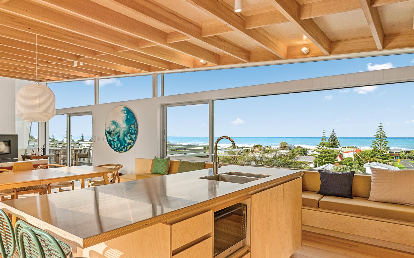 Take a prime seaside site with unimpeded sea views, add slick architecture, timber artistry and a nod to the nautical and what have you got? This beautiful 187sqm show home with three bedrooms, two bathrooms and a study. From first glance, the house catches the eye. A bow front with cedar trim sets the maritime scene and coloured steel and concrete-look cladding anchor the house to its long, narrow site. An upstairs balcony visible from the front ensures wide views are enjoyed. The entry is a strong indicator of the quality within. Vertical cedar lines both sides of the hall, stairwell and angled ceiling. On closer inspection, one wall reveals