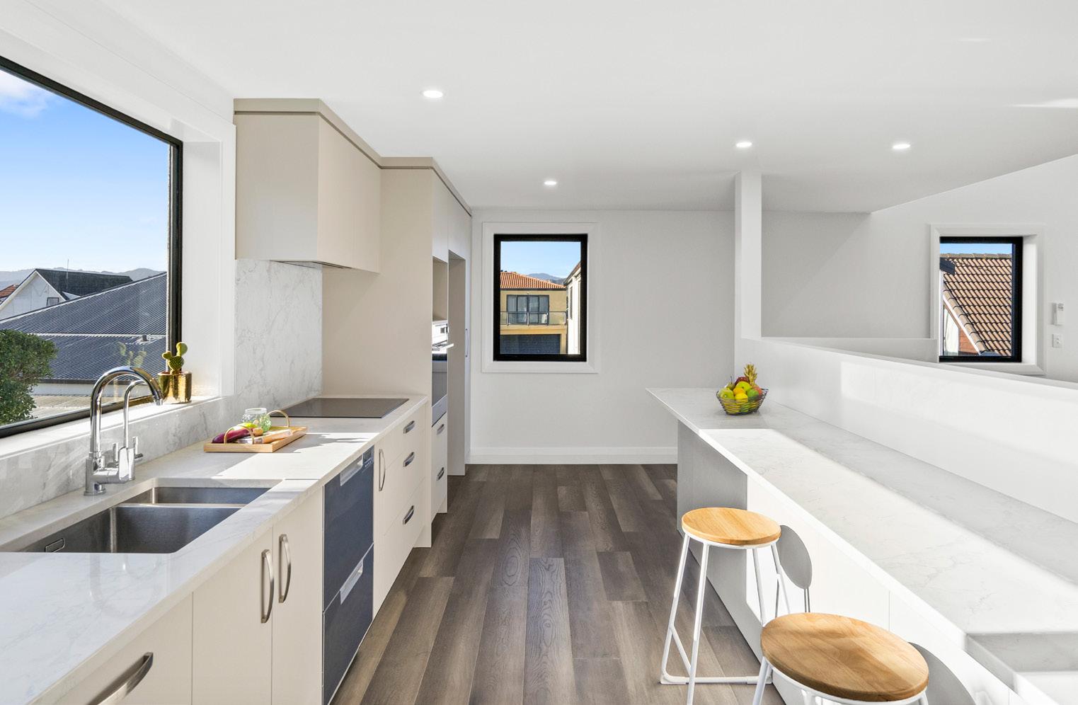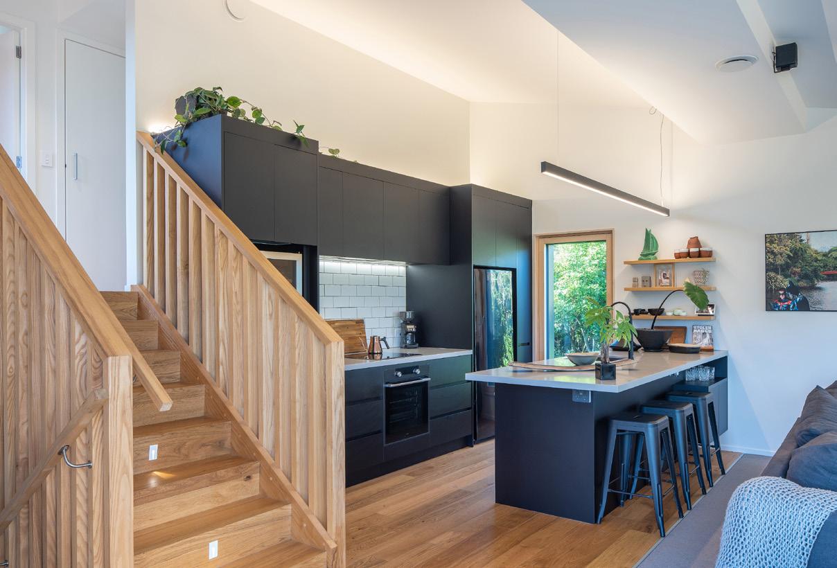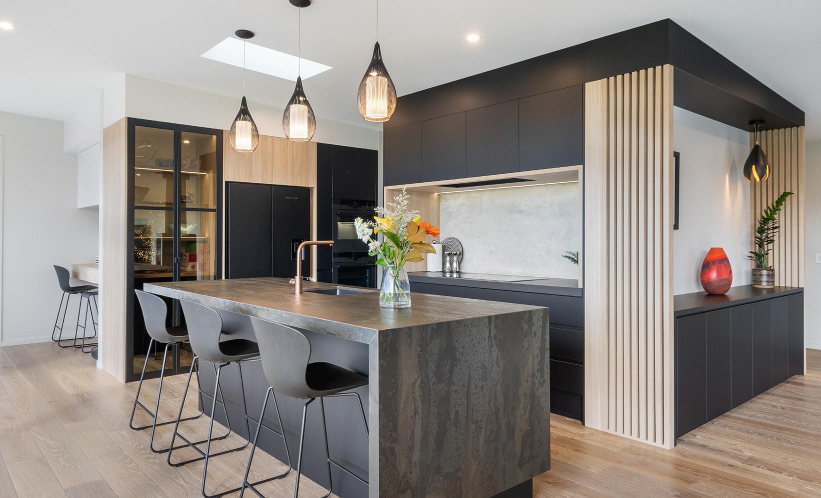 views. A light-filled entry and hall lead to an open-plan kitchen, dining and living area with an over-sized window and wide sliders that lead to a balcony. All the kitchen cabinetry is custom made and includes a fully integrated rangehood cover. The marble benchtops, island and splashback, and the addition of a scullery, make the kitchen a delight for cooks and entertainers. This is understated style at work. Also on this floor are a double garage, study, double linen cupboard and separate toilet. Downstairs, linked by a stairwell with a black feature rail, has three bedrooms, all with sliding doors that open to the great outdoors. The main bedroom has a large walk-in robe and ensuite. Black bathroom fittings lend an ultra-modern feel, as does the dark joinery that contrasts with the bright, breezy interior. For more of this house go to houseoftheyear.co.nz