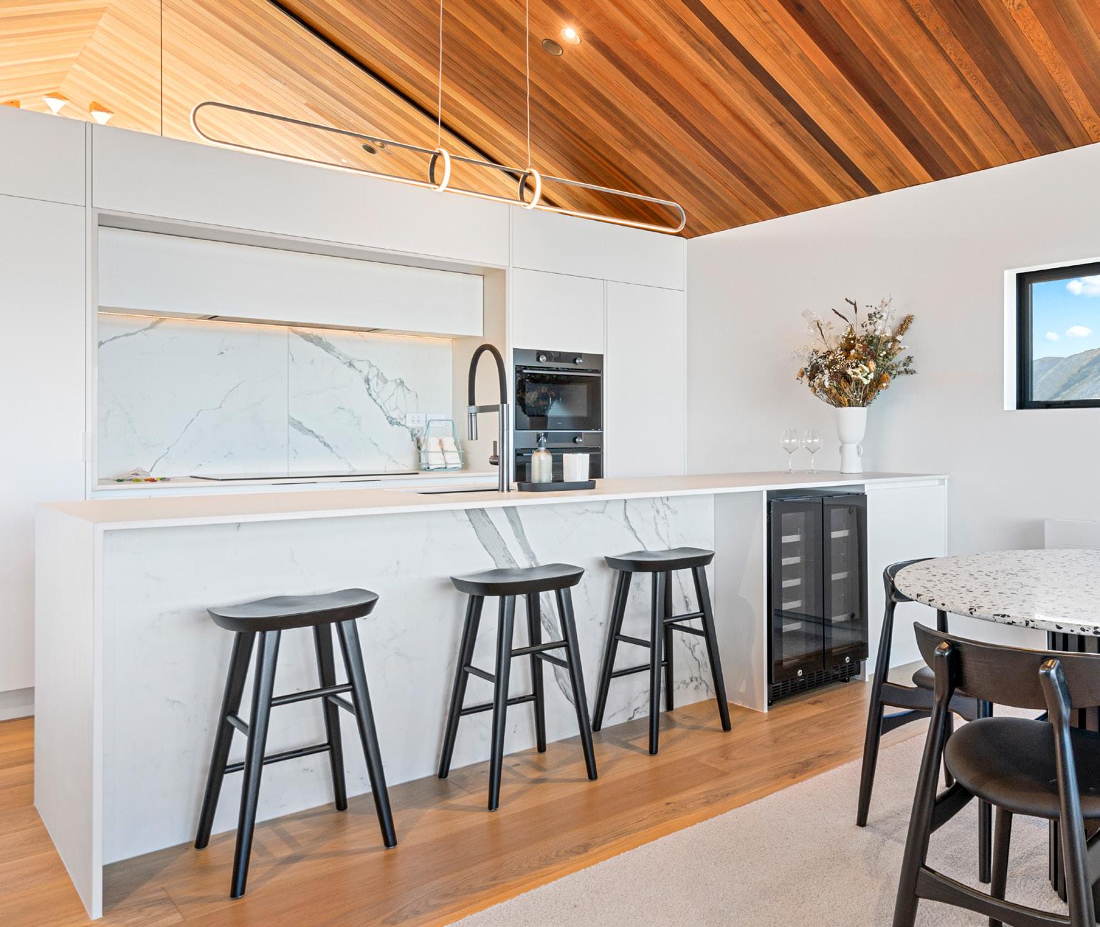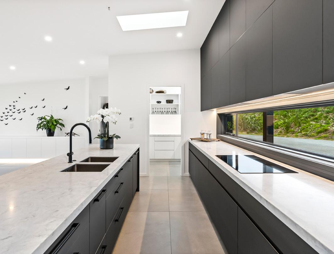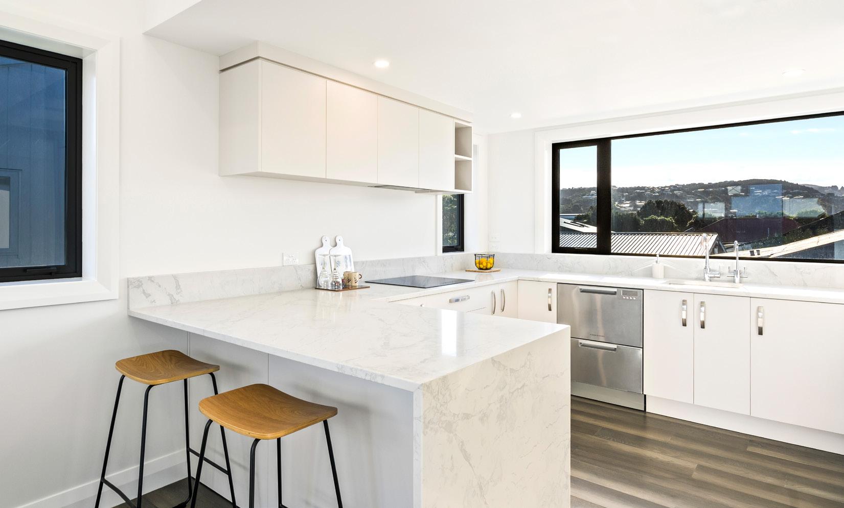 views. A light-filled entry and hall lead to an open-plan kitchen, dining and living area with an over-sized window and wide sliders that lead to a balcony. All the kitchen cabinetry is custom made and includes a fully integrated rangehood cover. The marble benchtops, island and splashback, and the addition of a scullery, make the kitchen a delight for cooks and entertainers. This is understated style at work. Also on this floor are a double garage, study, double linen cupboard and separate toilet. Downstairs, linked by a stairwell with a black feature rail, has three bedrooms, all with sliding doors that open to the great outdoors. The main bedroom has a large walk-in robe and ensuite. Black bathroom fittings lend an ultra-modern feel, as does the dark joinery that contrasts with the bright, breezy interior. For more of this house go to houseoftheyear.co.nz
