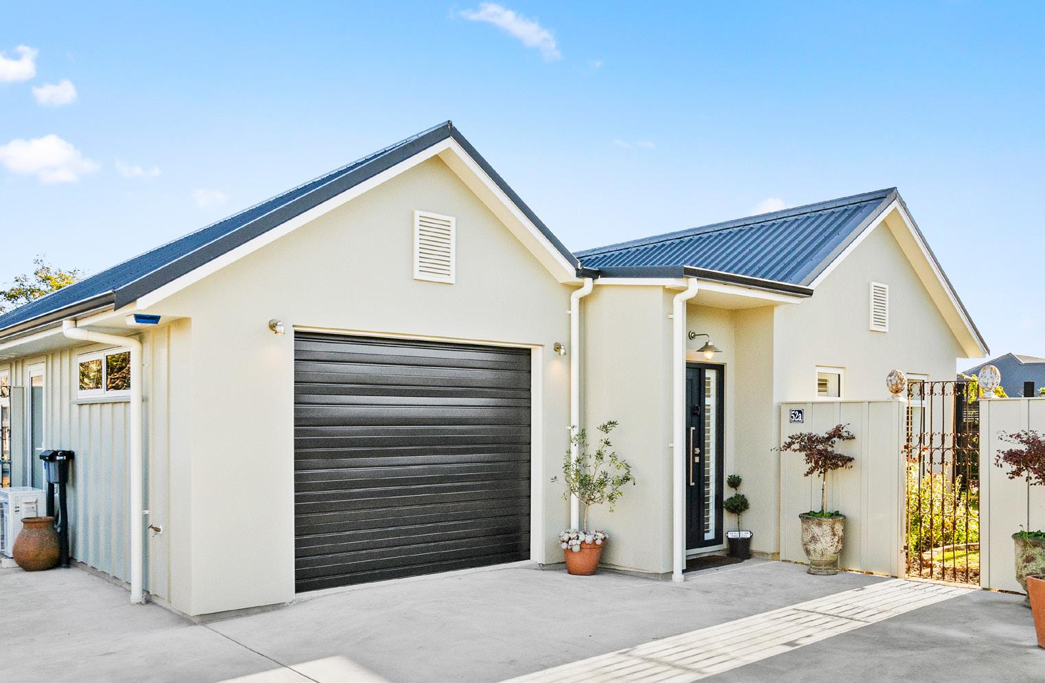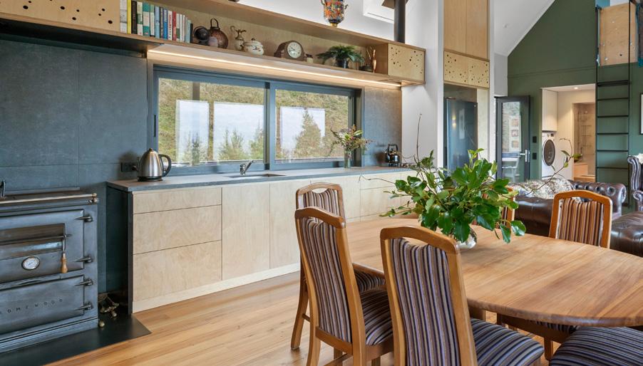 As well as the three bedrooms, the sunny house has a study, two bathrooms and a garage. The kitchen, in white and wood tones and with a tiled splashback, has a scullery; in the main bedroom, a walk-in wardrobe is tucked behind a deep-green panelled feature wall. Other embellishments include a barn-style sliding door in the lounge, a tongueand-groove feature wall in the ensuite and a window seat in the dining room. Concrete floors in the kitchen-dining zone are practical and sleek.