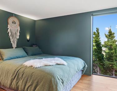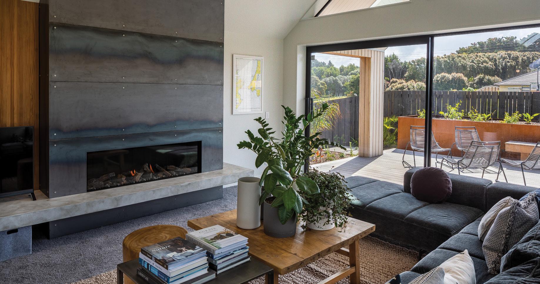 The adjacent living-dining space leads to a sunny outdoor area that’s ideal for entertaining. Me time? A lounge with a fireplace is just the spot for cosying up. You’ll find one bedroom suite on this floor, and three more bedrooms upstairs. These include the main bedroom sanctuary with its walk-in robe, ensuite and views, although every room up here enjoys an outlook. There’s clever use of colour to create visual interest, and the quality finishes confirm this home is top notch. For more of this house go to houseoftheyear.co.nz