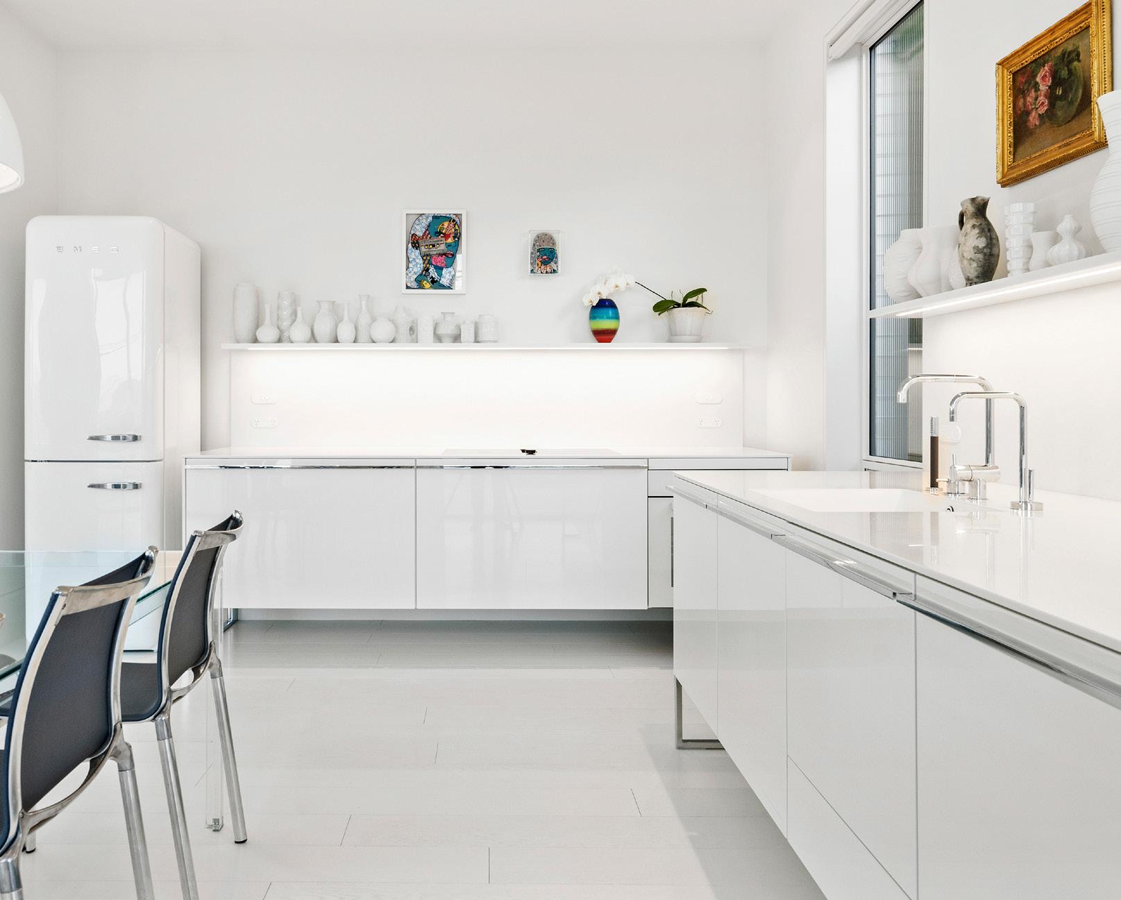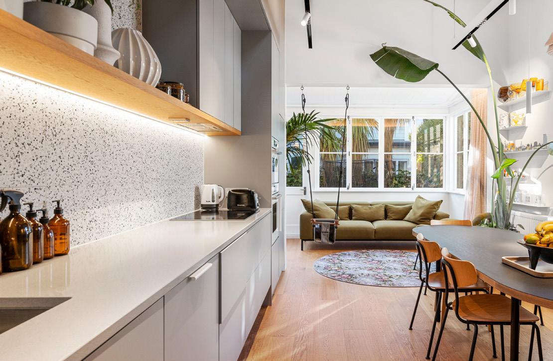 Light spills into both sides of the house, illuminating the slick white kitchen with tiled splashback.