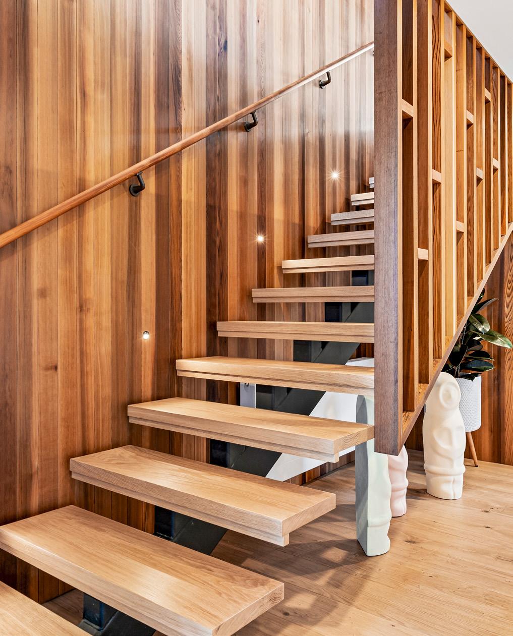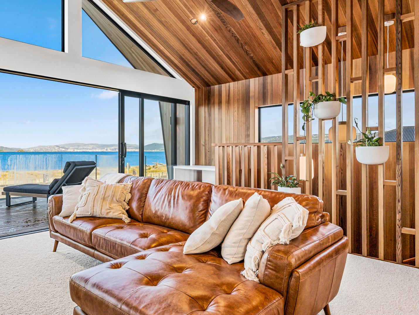 Head upstairs and you arrive in a living space with warm-toned timber — and that panorama.