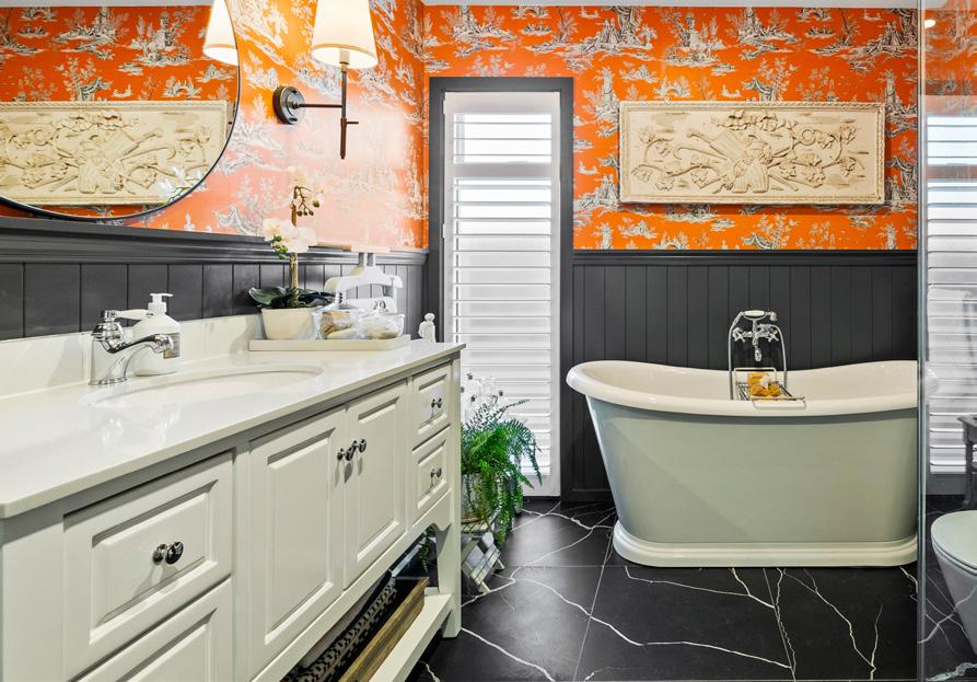 Wallpaper feature walls provide pops of colour and interest in the three bedrooms and two tiled bathrooms. A vibrant orange example demands attention in the family bathroom, which has a traditional standalone bath. The main bedroom has an ensuite and walk-in wardrobe.