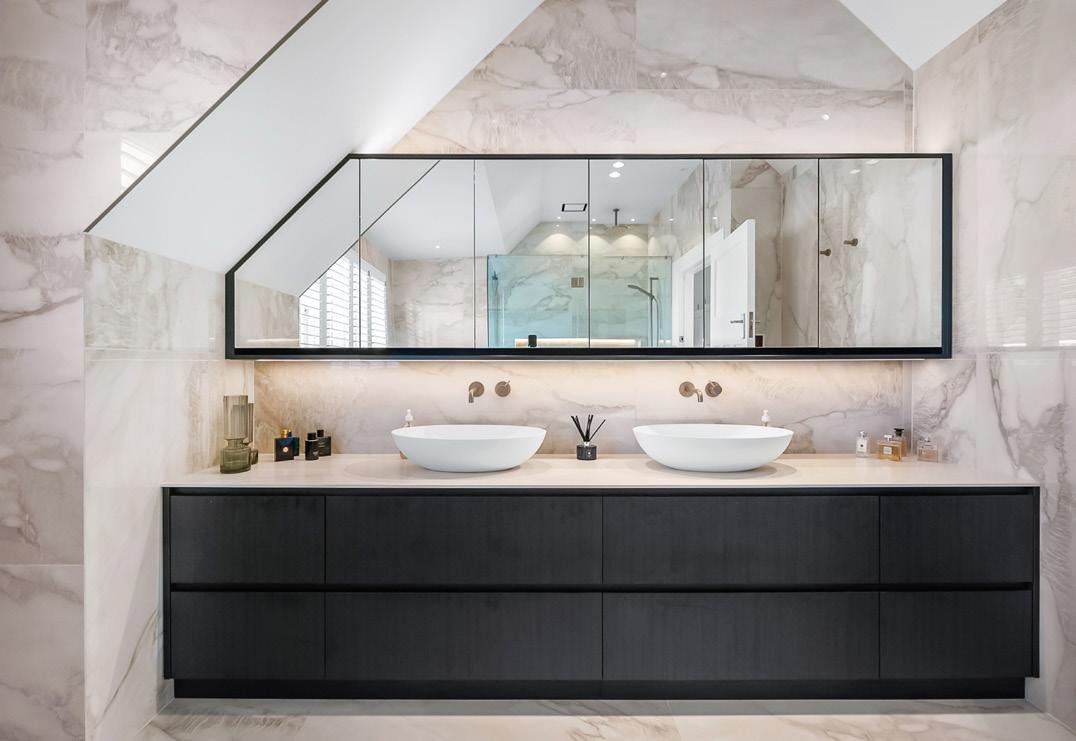 Take the flight of stairs up to the carpeted bedrooms, one of which is the main bedroom with a walk-in wardrobe and ensuite. Both the bathroom and ensuite are as pristine and streamlined as the kitchen.