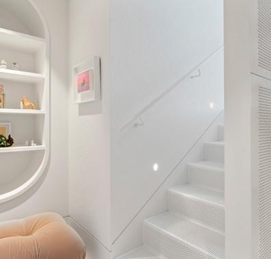 removed to make a large, open-plan kitchen-living area. The new kitchen has a butler’s pantry and pass-through window to a versatile outdoor space, perfect for barbecues or morning coffees. Every room got attention — from new bathrooms, a custom-built headboard in the main bedroom and feature lighting and pendants throughout. The narrow stairwell was revamped into an open staircase, creating a focal point and allowing natural light to flow though.