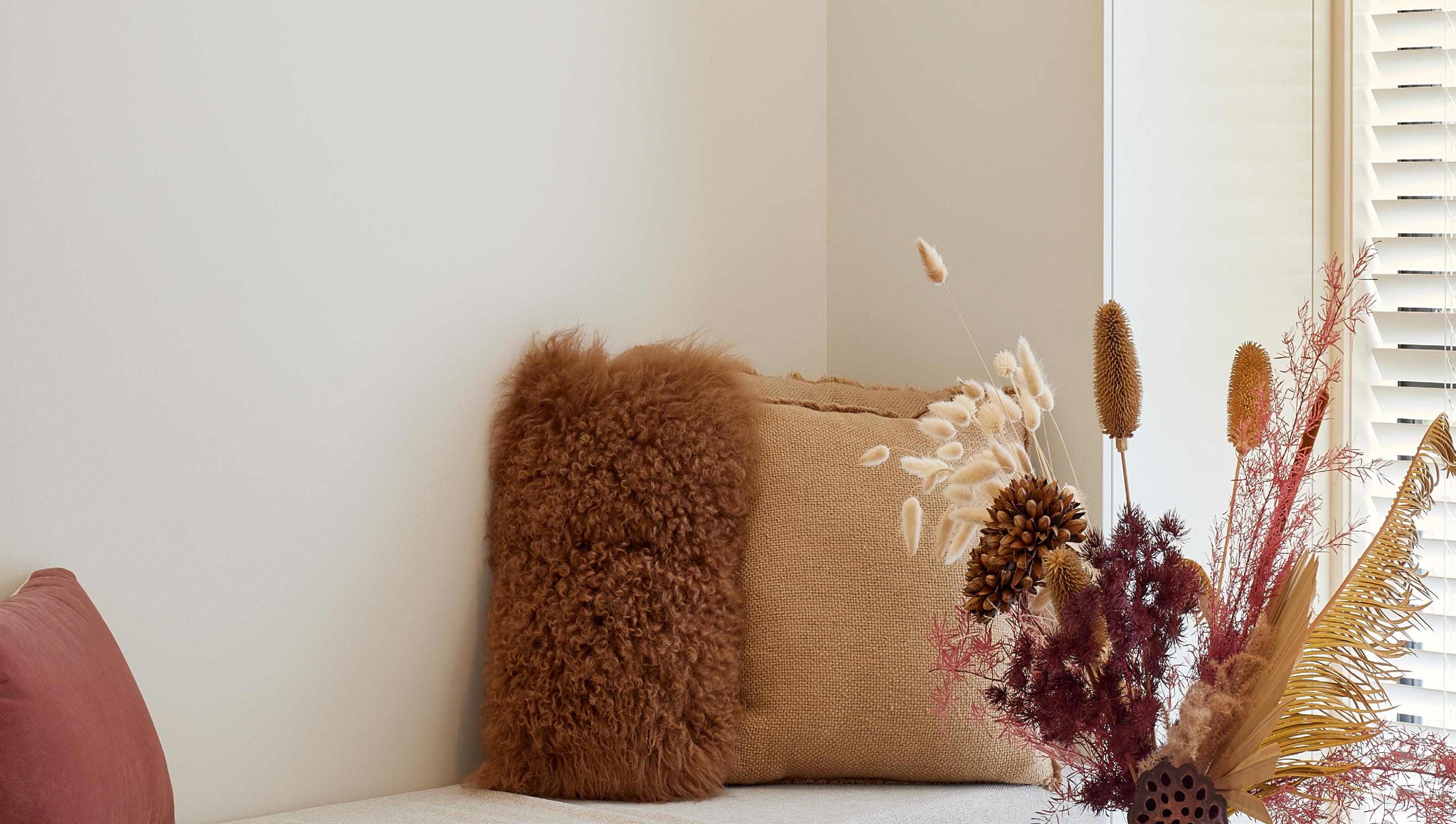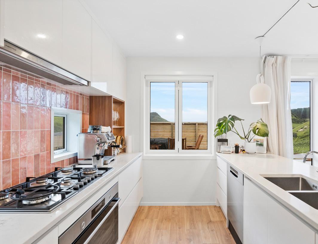 From the moment you step inside, there’s a sense of warmth and spaciousness. The open-plan living area has polished wooden floors and large windows that capture light and views. The kitchen, part of the open-plan area, features top-of-the-line appliances, a butler’s pantry, splashback with shades-of-pink tiles and a peninsula that doubles as a breakfast bar. It’s a cook’s delight.