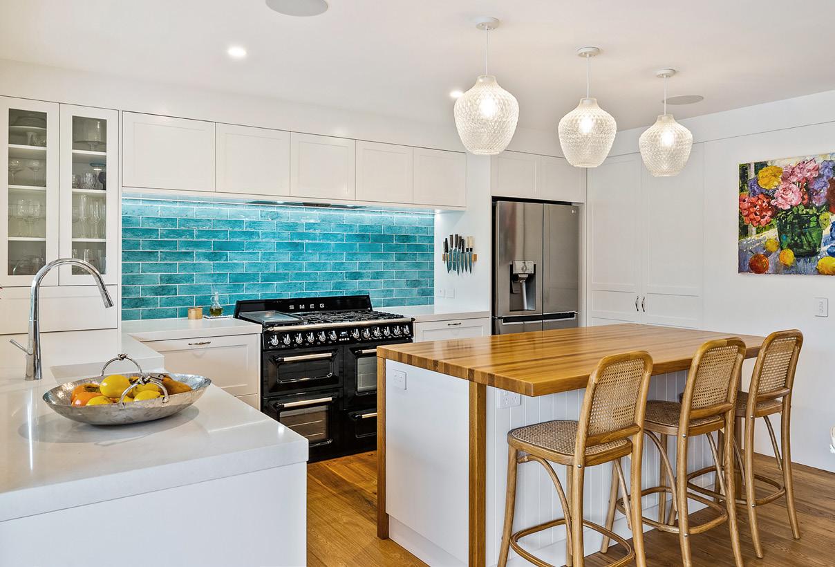 The kitchen has custom cabinetry, engineered stone benchtops, a trio of pendant lights and a scullery.