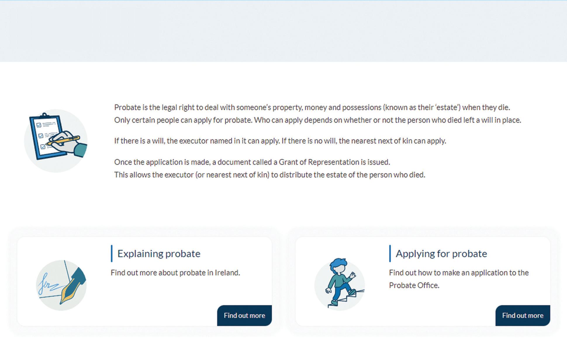 The content is easy for both legal practitioners and personal applicants to understand the steps involved in the process, what information they will need to provide each step of the way and what they can expect from us. We also have a new feature which enables people to check in advance if they are entitled to apply for probate. This content is available on courts.ie.