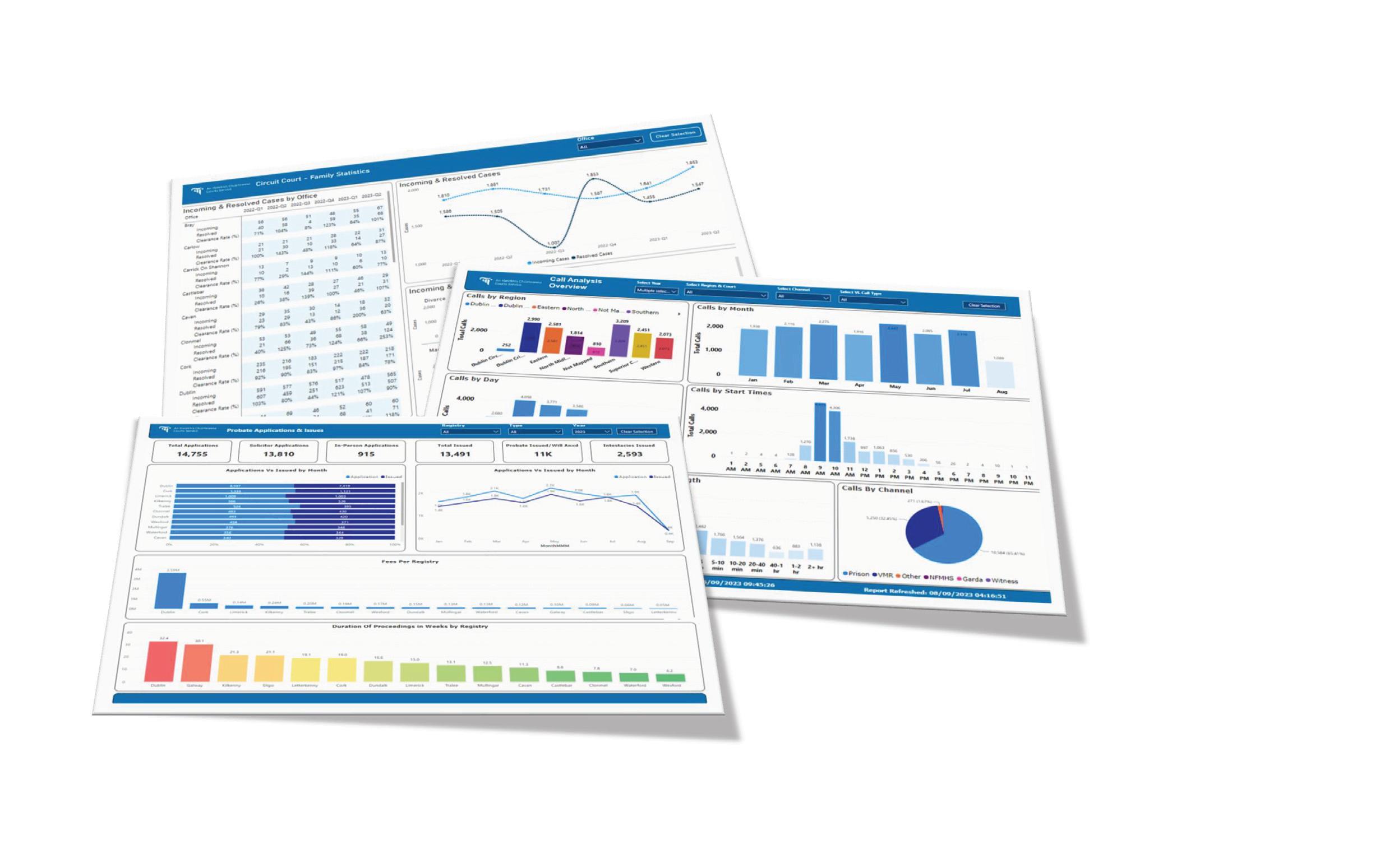 across multiple areas of work. Data dashboards are available for court sittings, wait times, probate, jury, and video court utilisation, among others. All data reporting is now launched from a new single reporting portal accessible by management and will expand over 2024 and beyond.